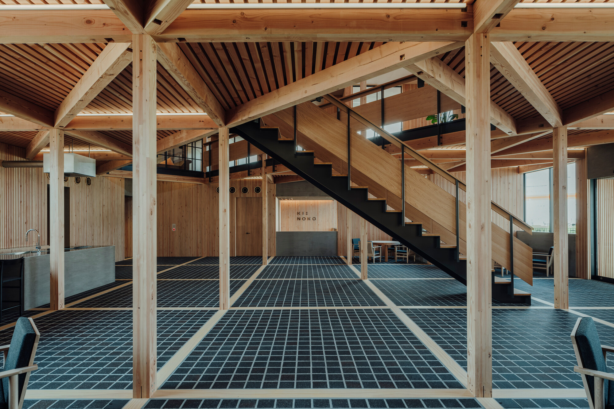 特別的是,KITONOKO 並沒有使用大型工程木材來形塑寬闊空間,而是刻意選用一般蓋小住宅用的標準尺寸木材。要在這樣的條件下蓋出一棟中型公共建築,是非常大的挑戰。設計團隊仔細安排結構協調與尺寸控制,讓建築在符合傳統木框架邏輯的前提下,依然能創造出寬敞明亮的感覺。