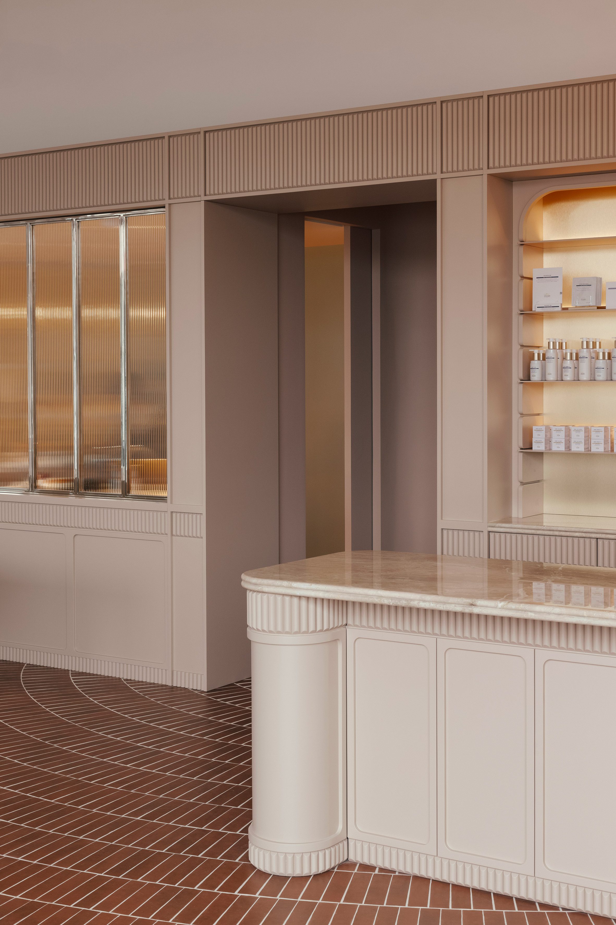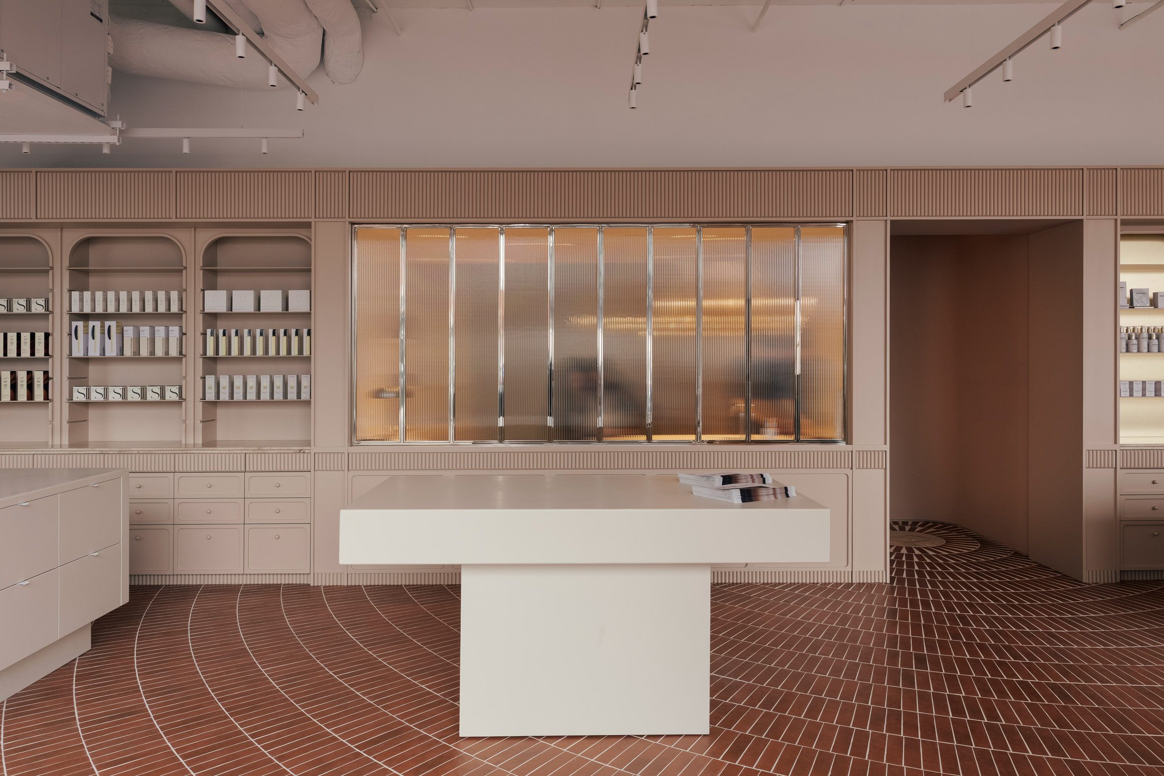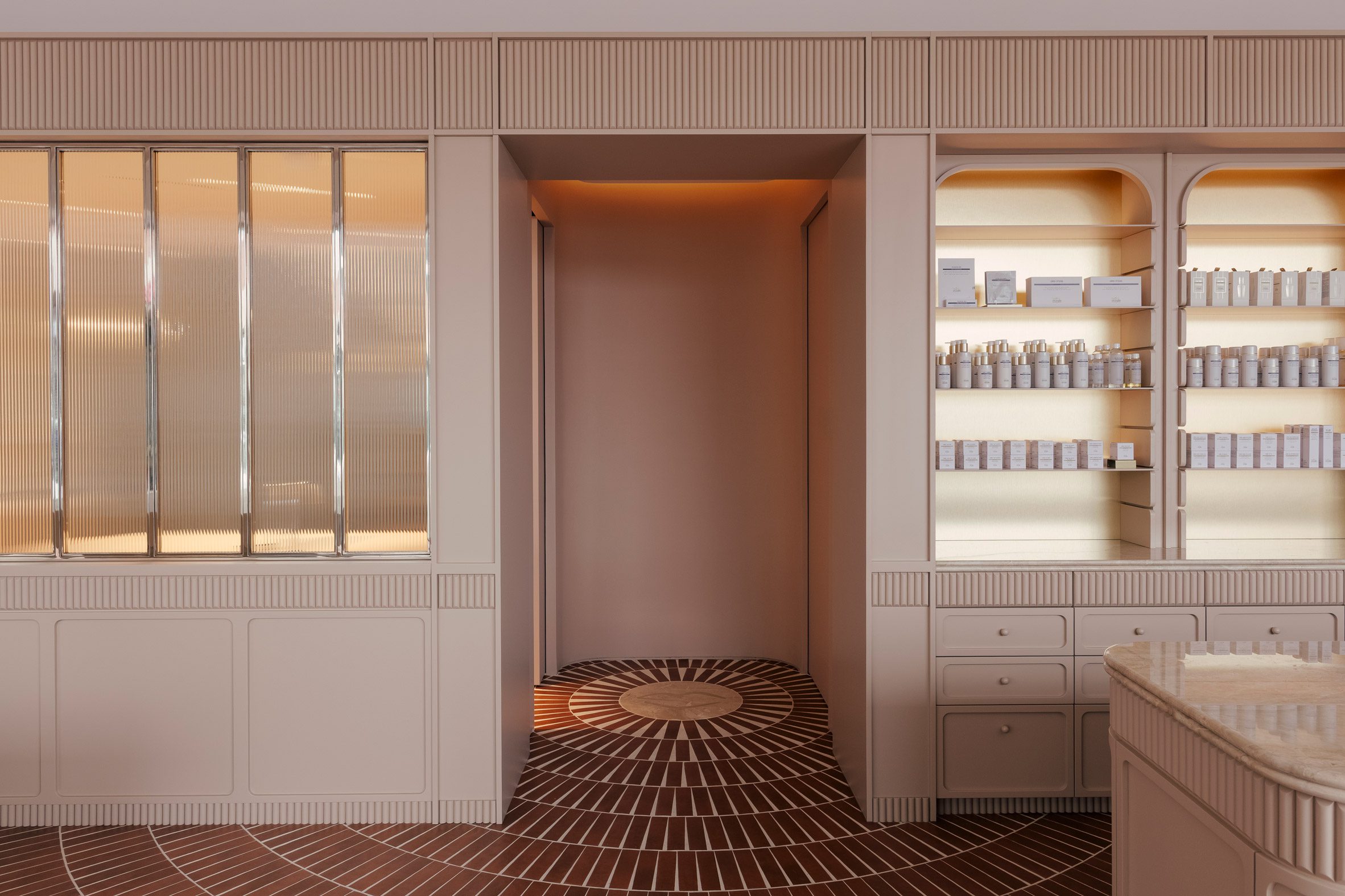 整個零售區域的地面,鋪設了赤陶色調的瓷磚,這些瓷磚以同心圓弧的形態,朝向臨街的玻璃立面輻射開展。所有弧線的匯聚點,恰好落在零售空間與後方水療區入口的交界處,極具動態感的圖案,彷彿一股無形的引力,自然而然地將訪客的腳步,由外向內、由動態的商業區導引至靜謐的療程區。分隔兩個區域的,是鑲嵌在鍍鉻框架中的直紋玻璃窗,它在維持視覺穿透性的同時,也為後方的私密空間,保留了恰如其分的朦朧感。