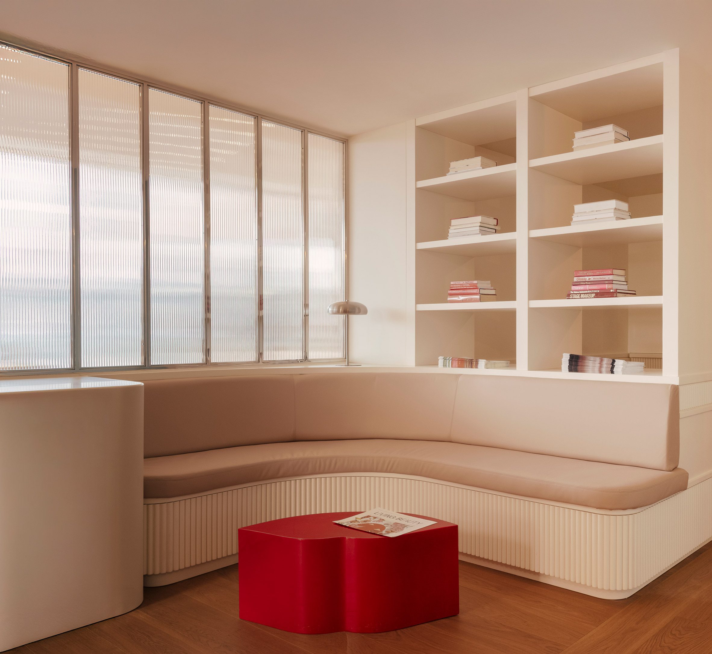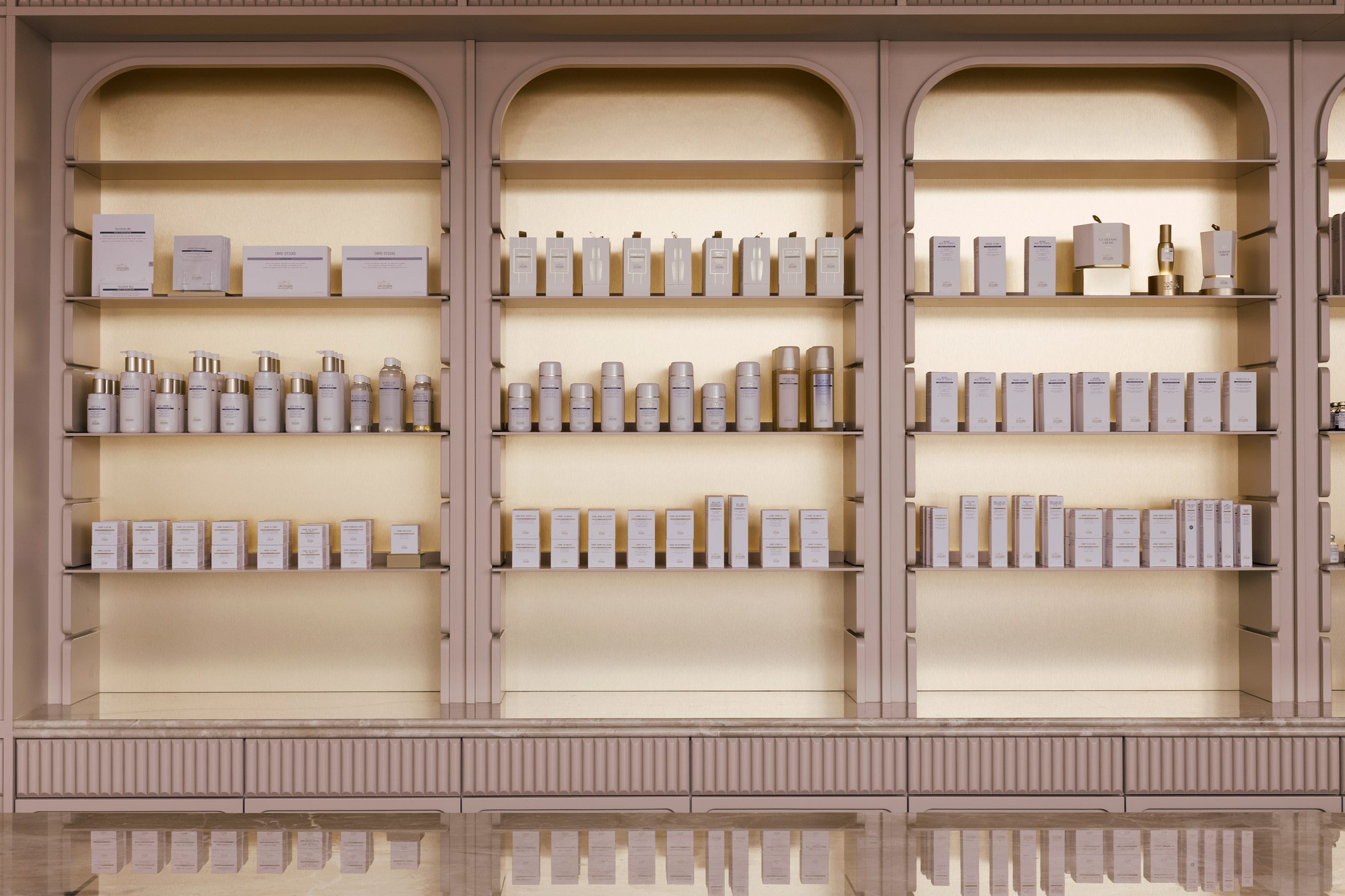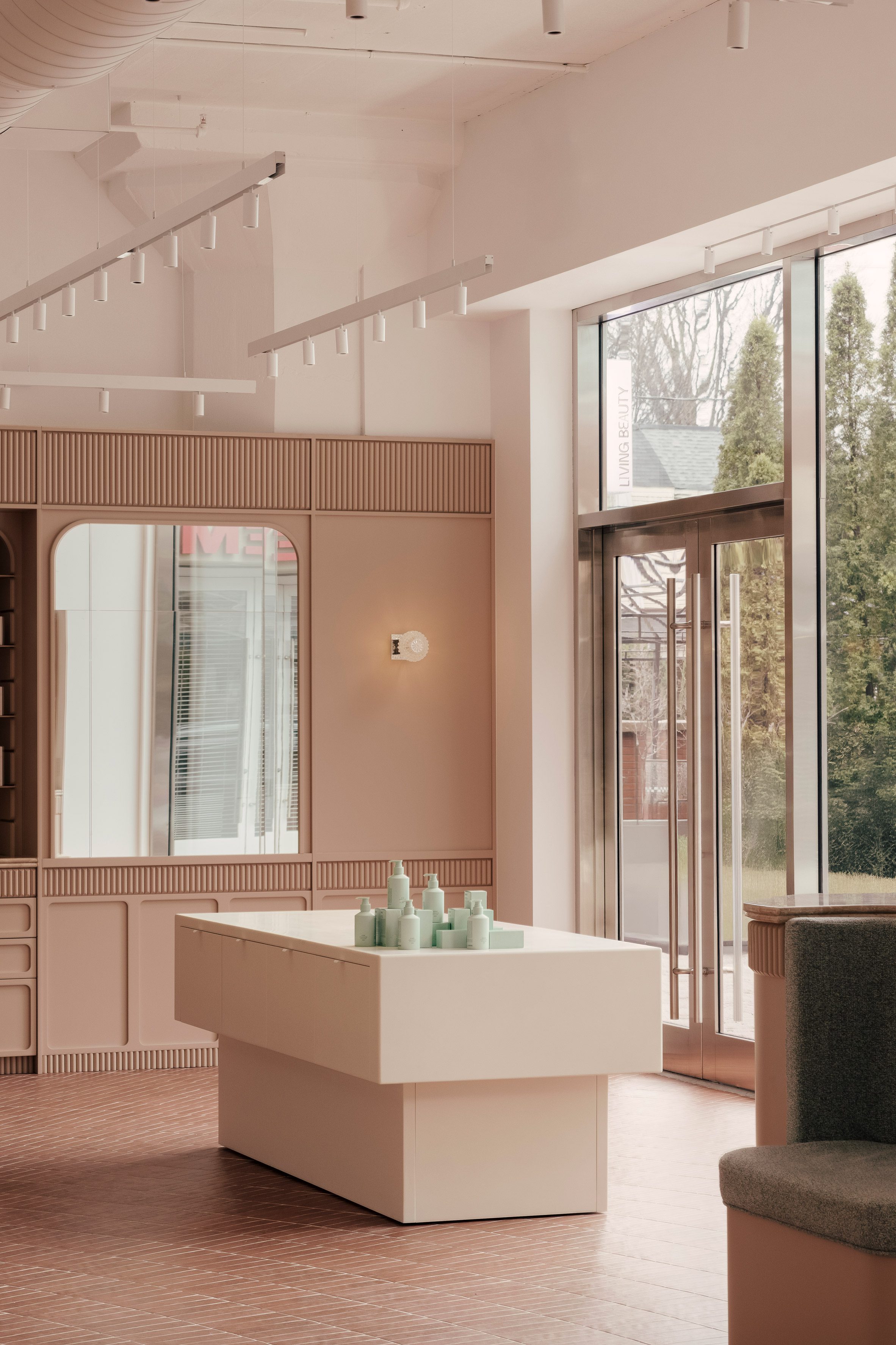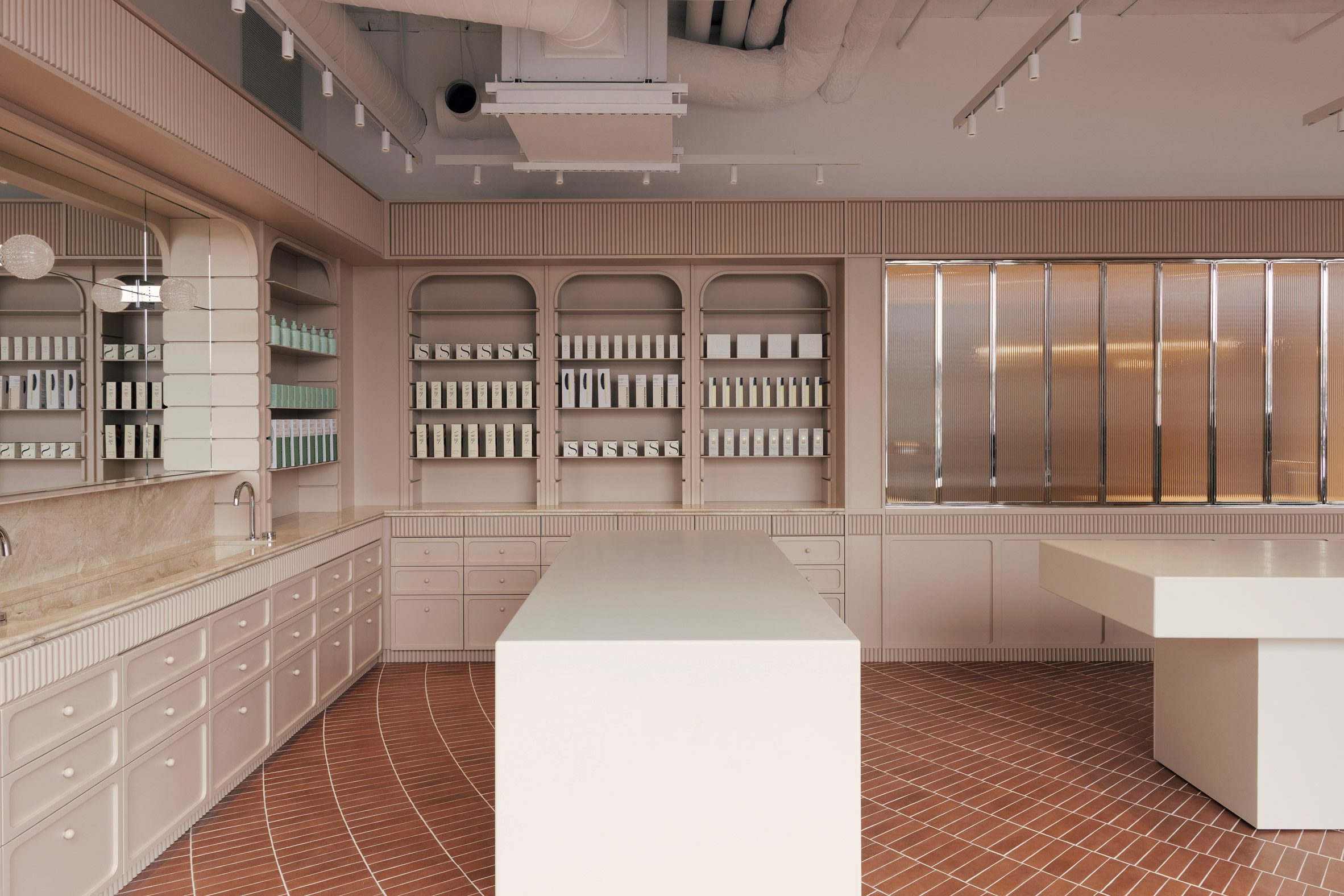整個零售區域的地面,鋪設了赤陶色調的瓷磚,這些瓷磚以同心圓弧的形態,朝向臨街的玻璃立面輻射開展。所有弧線的匯聚點,恰好落在零售空間與後方水療區入口的交界處,極具動態感的圖案,彷彿一股無形的引力,自然而然地將訪客的腳步,由外向內、由動態的商業區導引至靜謐的療程區。分隔兩個區域的,是鑲嵌在鍍鉻框架中的直紋玻璃窗,它在維持視覺穿透性的同時,也為後方的私密空間,保留了恰如其分的朦朧感。