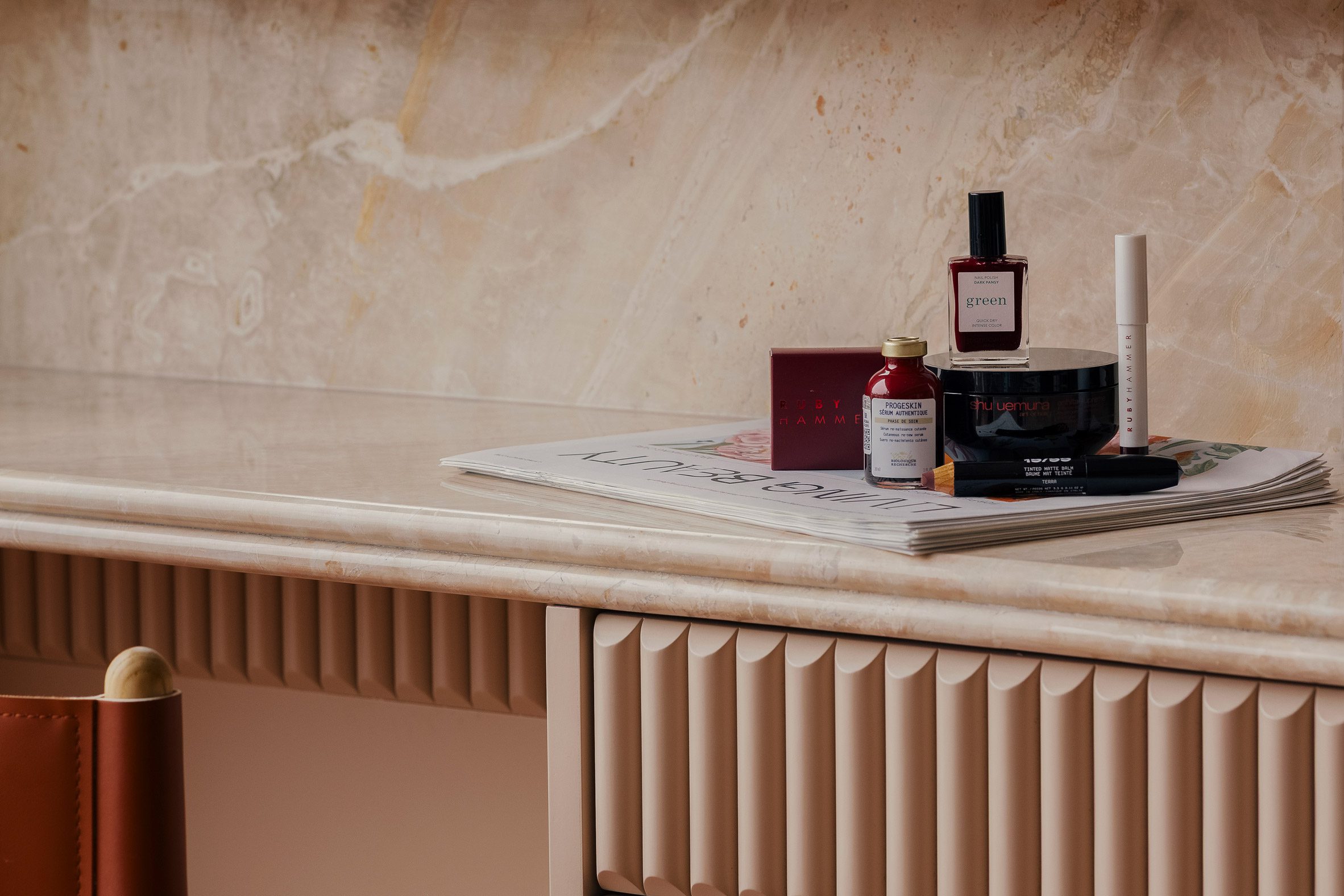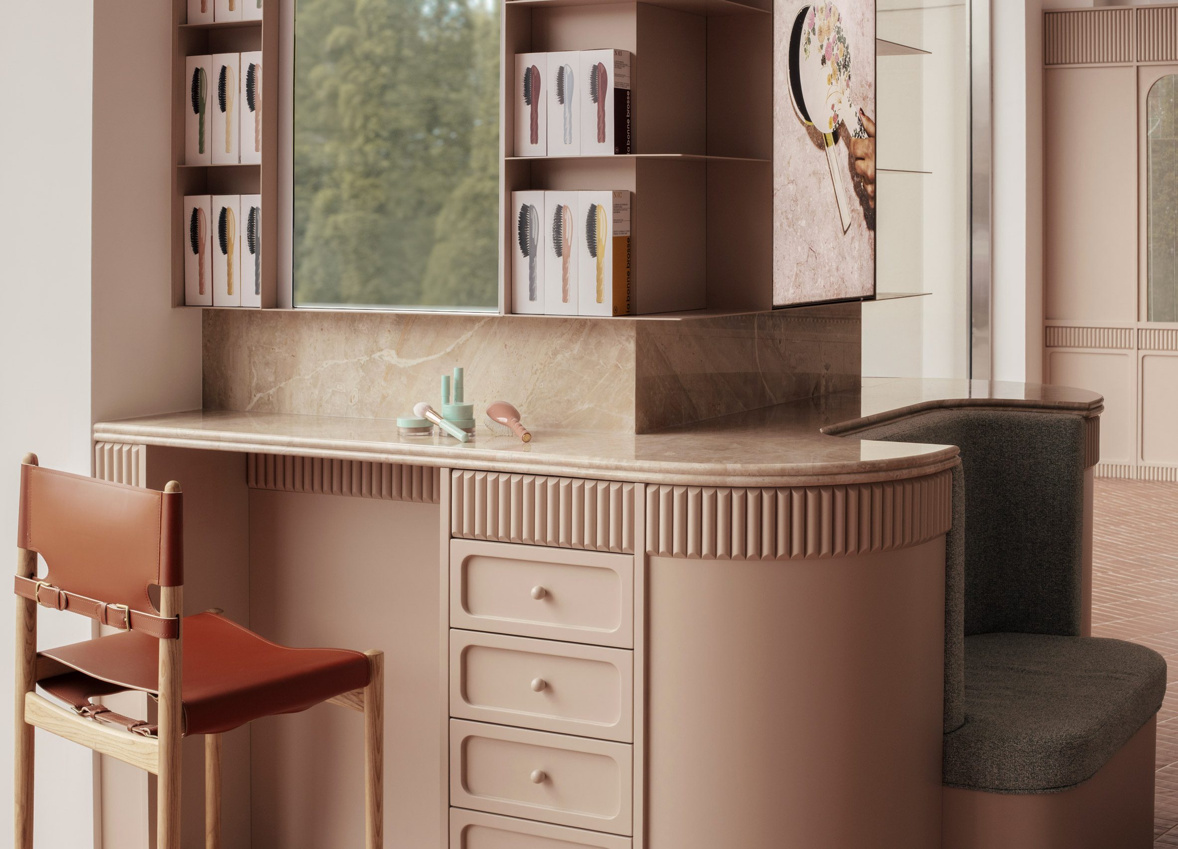 櫃檯之外,更多的同款大理石被用於弧形產品展示區內的檯面式層架,這些展示區由溫暖的黏土色木作包覆著牆面,營造出宛如壁龕的圍繞感。在壁龕上方,商品被精心陳列於開放式的粉末塗層鋼製層架上;下方則是實用的抽屜,用於存放補充庫存,維持了視覺的整潔。
