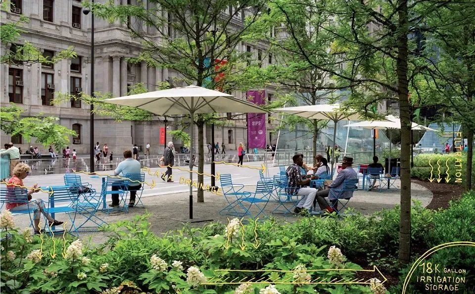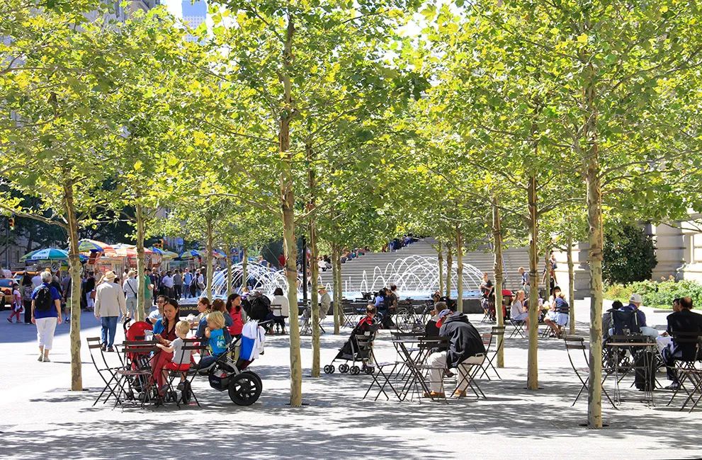 廣場新增的樹木約有100棵,是以前的兩倍多。這樣增加遮蔭後環境變得更加舒適,更適合停憩,而且降低路面的溫度最高可達25華氏度。