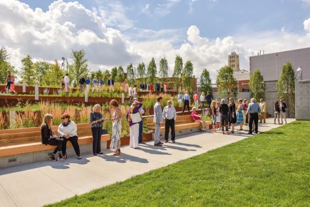 OLIN將原來的地面停車場轉換成了一系列梯田式戶外空間:迎賓廣場、柔性草坪、一條柔草環繞的蜿蜒小徑,以及象徵凱霍加山谷國家公園森林的林地。
