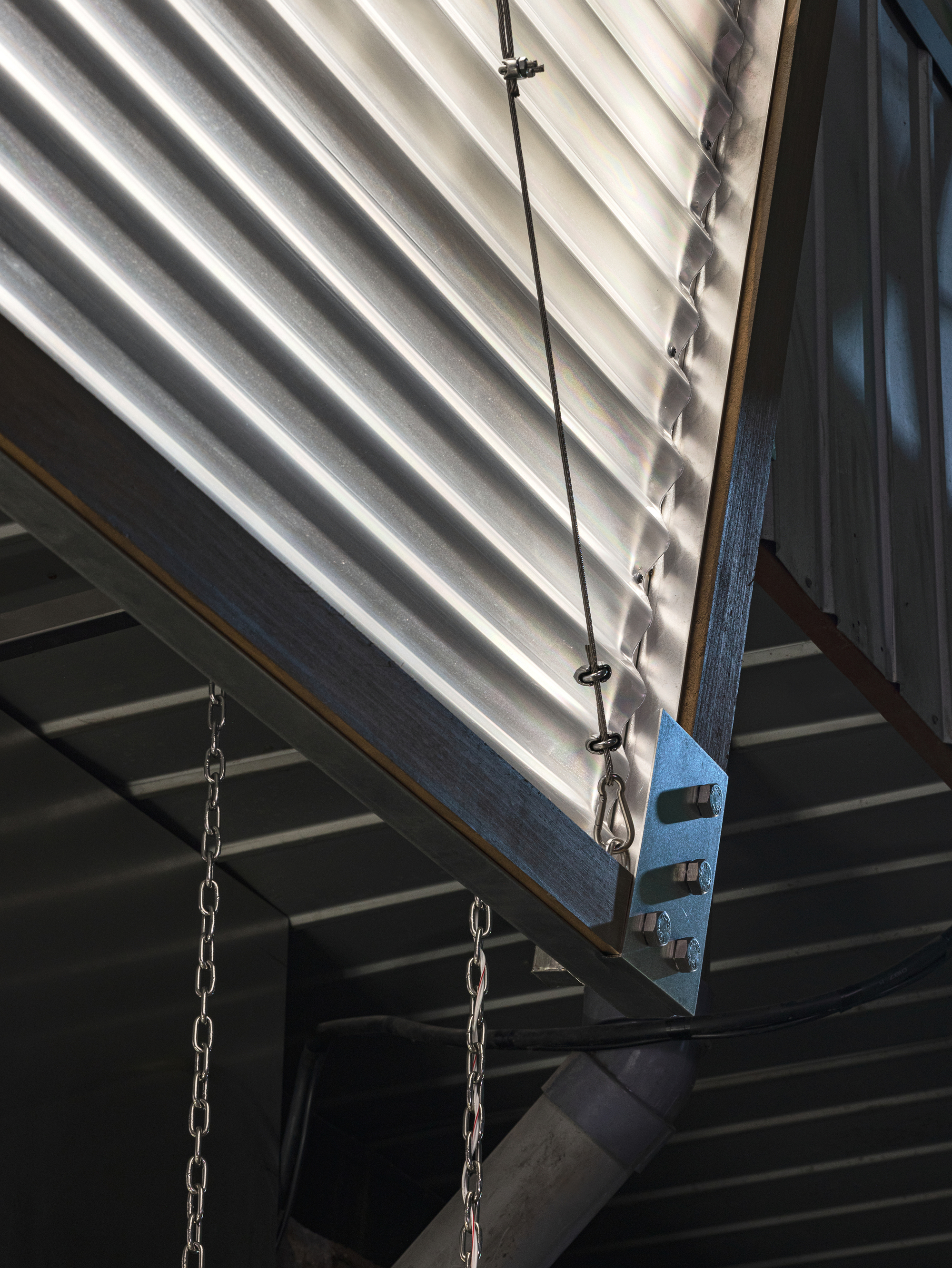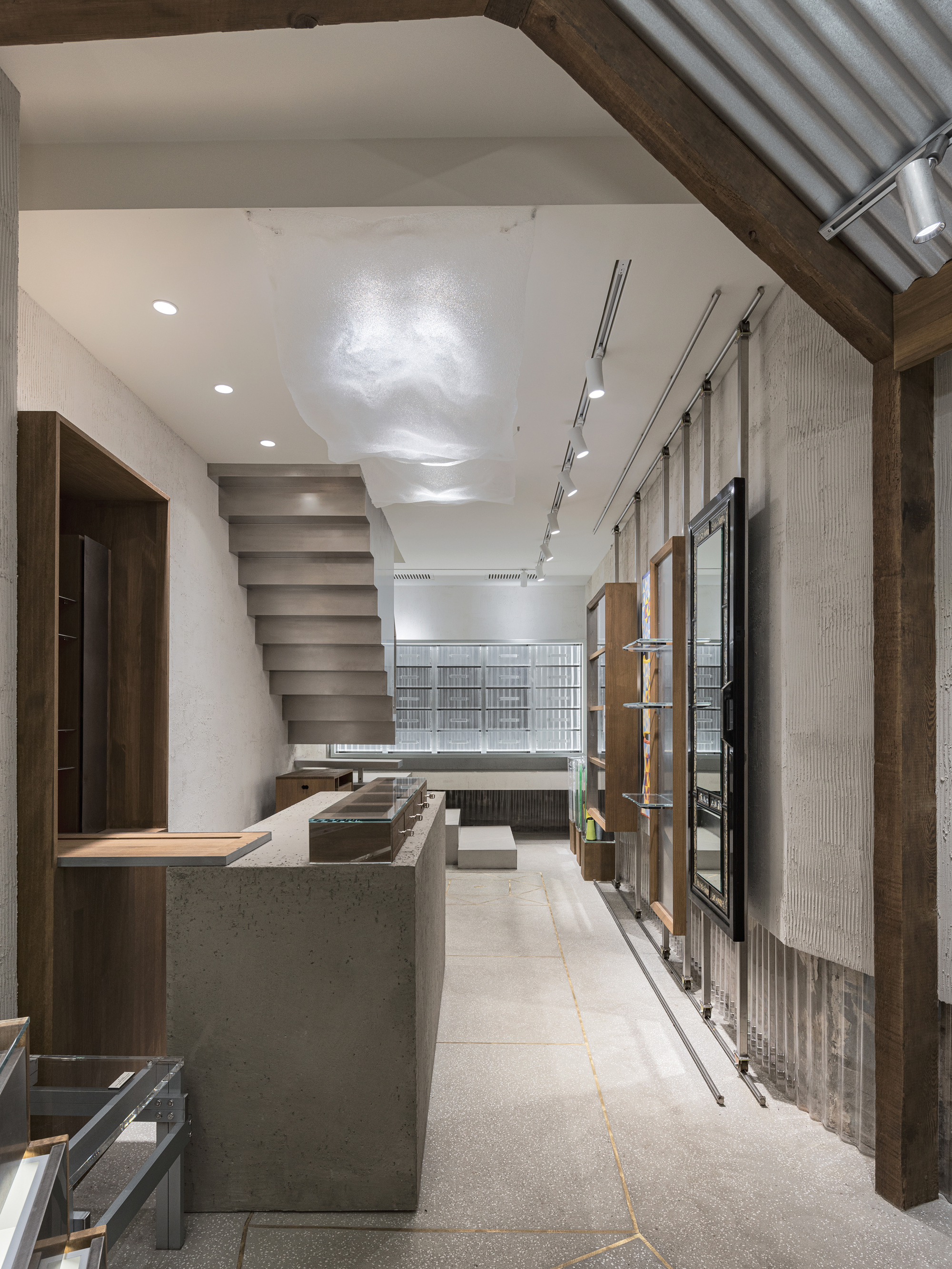 傳統零售店鋪常囿於單純的「觀看」功能,然而,PLEATSMAMA 的新店設計卻追求從視覺到「親身體驗」(experienced)的感知躍遷。這項轉變,讓品牌的永續精神有了具體而持久的形態。一樓立面選用了半透明的波浪狀 Lexan PC 板材,這種日常建材在廣藏市場中隨處可見,卻被賦予了獨特的紋理。光線穿透表面,柔和地散射進入室內,既映照出市場的喧鬧,也濾鏡出品牌沉靜的感性,這棟建築彷彿呼吸著市場的節奏,創造出層次分明的節奏與光影。設計師運用材質與光的雙重作用,營造詩意的購物環境。