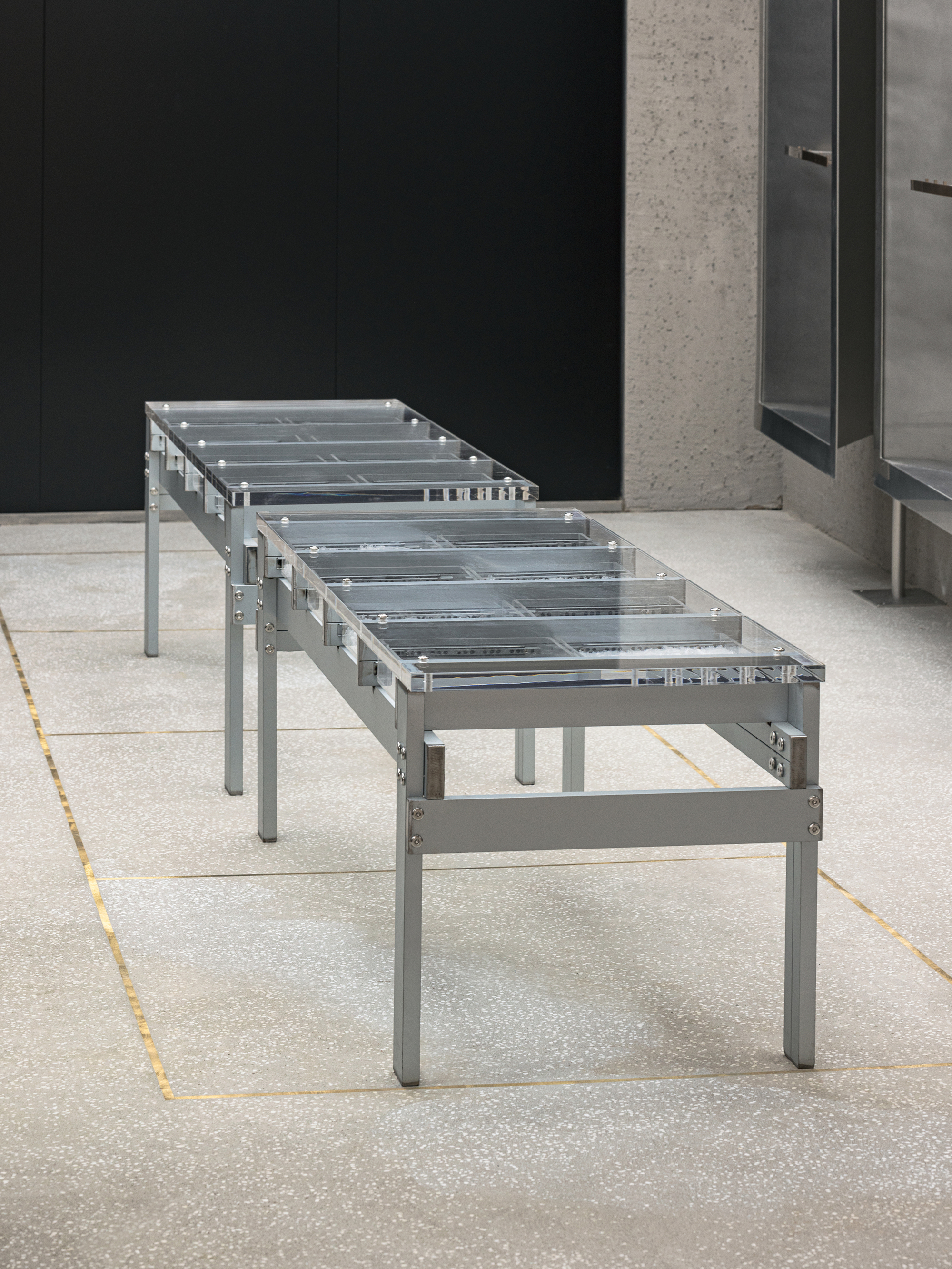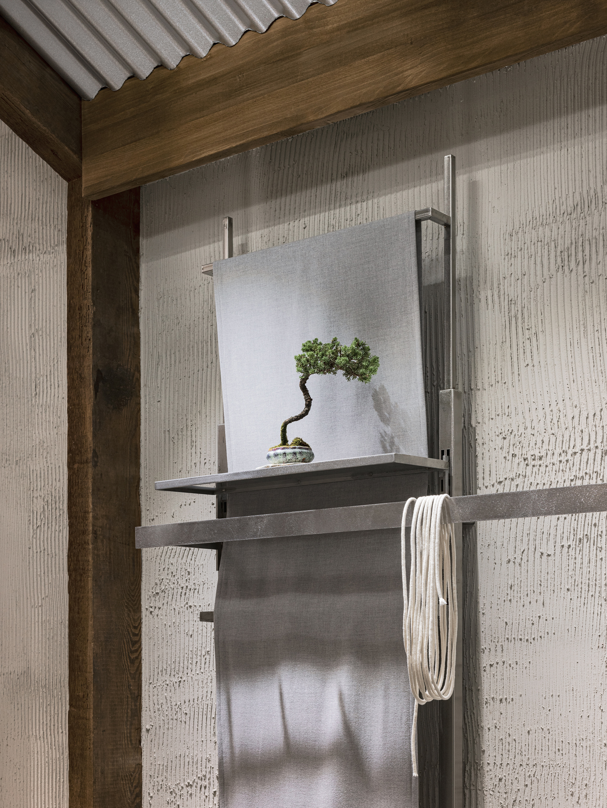 為了深化品牌追尋永續與自然循環的哲學,設計在選材階段便擁抱了材料的長壽與循環性。對循環經濟的實踐,超越了單純的環保選項:壓克力長凳鑲嵌著回收塑膠碎片,再生木柱上殘留著時間的痕跡,加上由再生紗線製成的編織繩,都成為連結過去與現代感性的詩意中介。品牌將褶皺形態的概念延展至日常材質的重新詮釋,例如波紋鋼屋頂增加韻律感,透明壓克力抽屜則透過光影折射強化褶皺圖樣,營造出材質與功能間的平衡。這些選材元素不僅是環保材料,更是傳遞工藝、傳統、社群與市集文化的哲學載體。