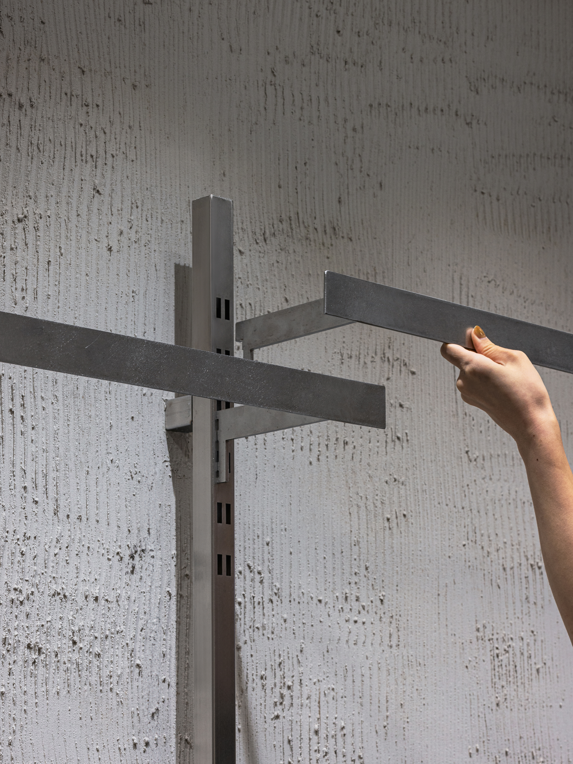 二樓的視覺核心,聚焦於 PLEATSMAMA 標誌性的斜向衣架陳列系統,在空間中央形成對稱的結構核心。其設計靈感取自韓國傳統的賓約髮簪(Binyeo hairpin),這種飾品原是固定髮髻的工具,象徵著女性的身份與地位,其固定的邏輯被轉化為一種金屬插銷連接系統。這套模組化邏輯,讓貨架和掛桿可以直覺地安裝或重新佈置,賦予空間極大的適應性與配置彈性。拉絲金屬邊框與天然木紋的運用,精準地平衡了金屬的冷靜精密與木材的溫潤質感,創造出零售場景所需的多功能性,同時也向韓國精湛的板金工藝致敬。