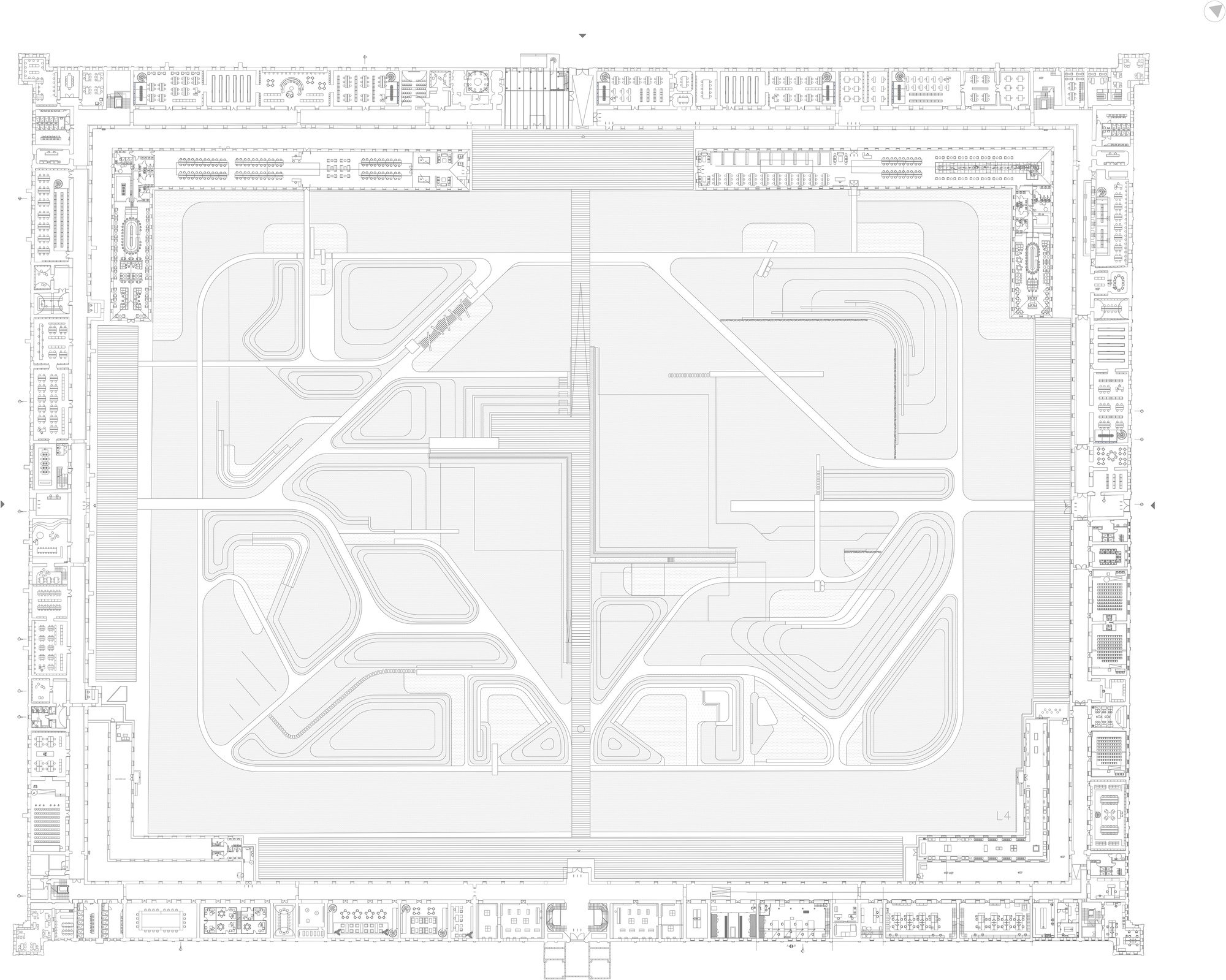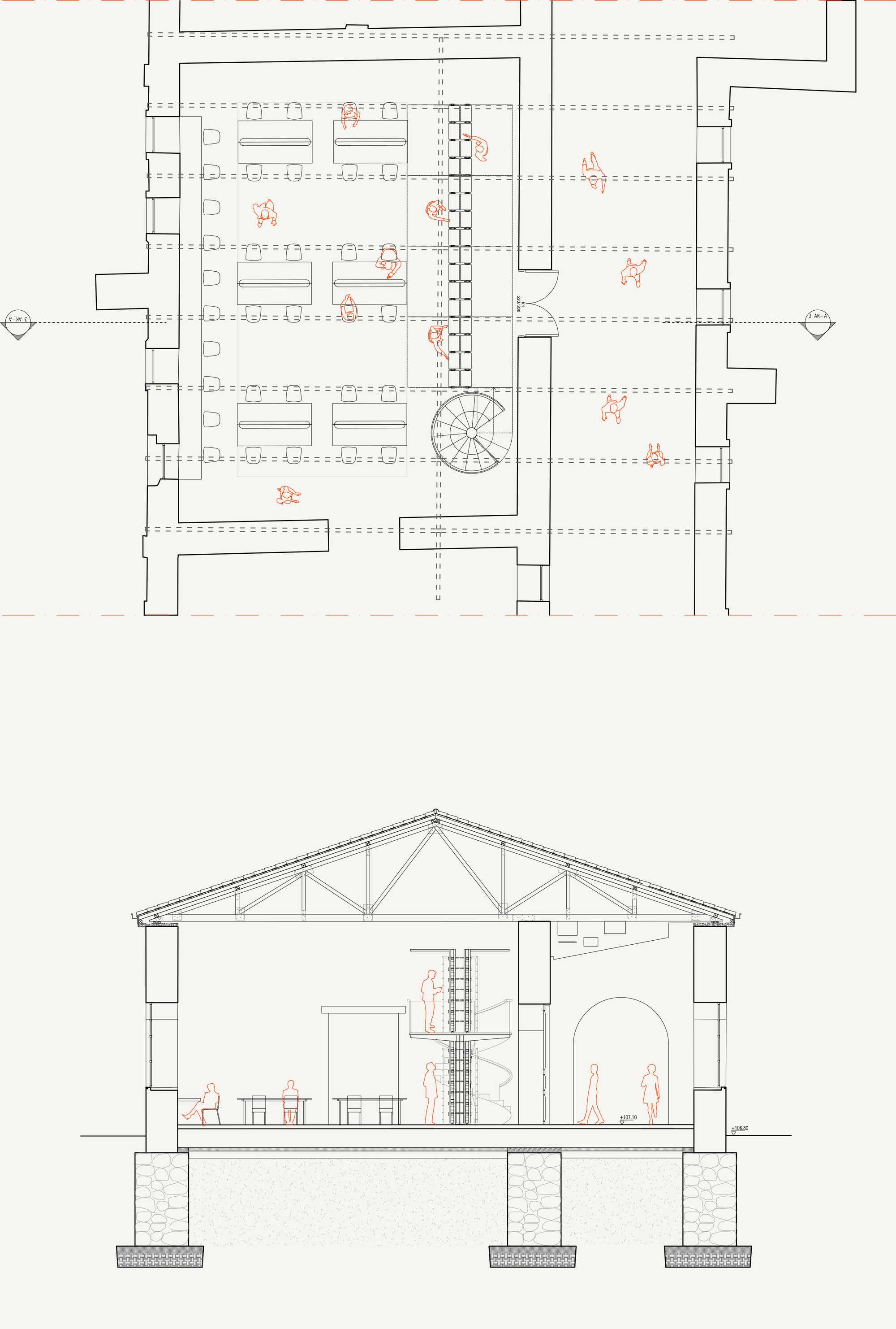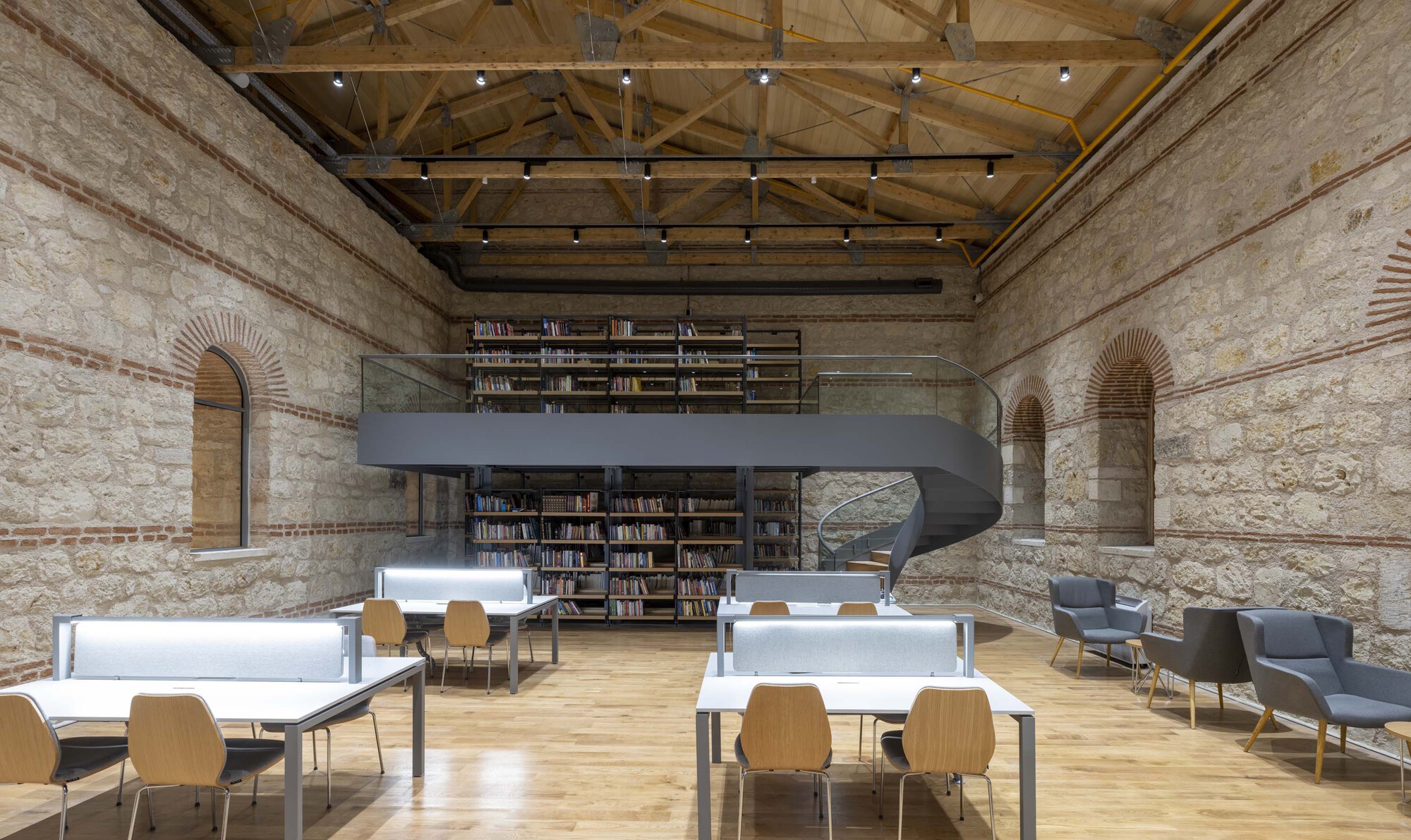 為了在有限的歷史建築殼體內滿足當代圖書館龐大的空間需求,建築師引入了輕量化的鋼構夾層,夾層被設計為「可逆式結構」,意味著它們可以在不傷害原有石砌建築的情況下被移除。夾層由與書架對齊的簡單鋼製系統支撐,創造出新的學習與研究區域。在材料表現上,鋼與木的運用與原本的磚石構造形成微妙對比,清晰地界定了新介入元素與歷史脈絡的邊界。