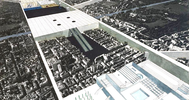 The zone can be built today (if necessary, in segments, perhaps with a modified location, perhaps with the segments dropped like stones, apart from each other, and only connected by the overlapping ripples caused by their impact on the urban pond, i.e. like true social condensers). It requires a fundamental belief in cities as the incubators of social desires, the synthetic materializations of all dreams. If people were allowed to become acquainted with Architecture, they would decide to re-appropriate the physical and ideological decay of our Urban Societies and to rehabilitate their premises with the metropolitan ideal and life style. Under the threat of doom, the common concern, that is the fulfilment of all private desires within a subliminally collective and deliriously permissive common effort, produces phantom proposals, in the knowledge that phantom reality is the only possible successor to the present reality shortage.