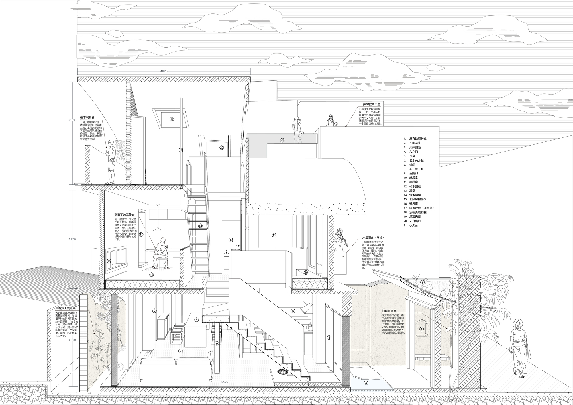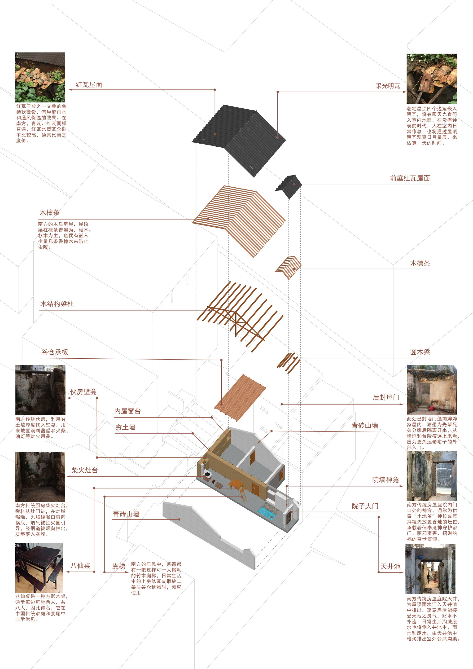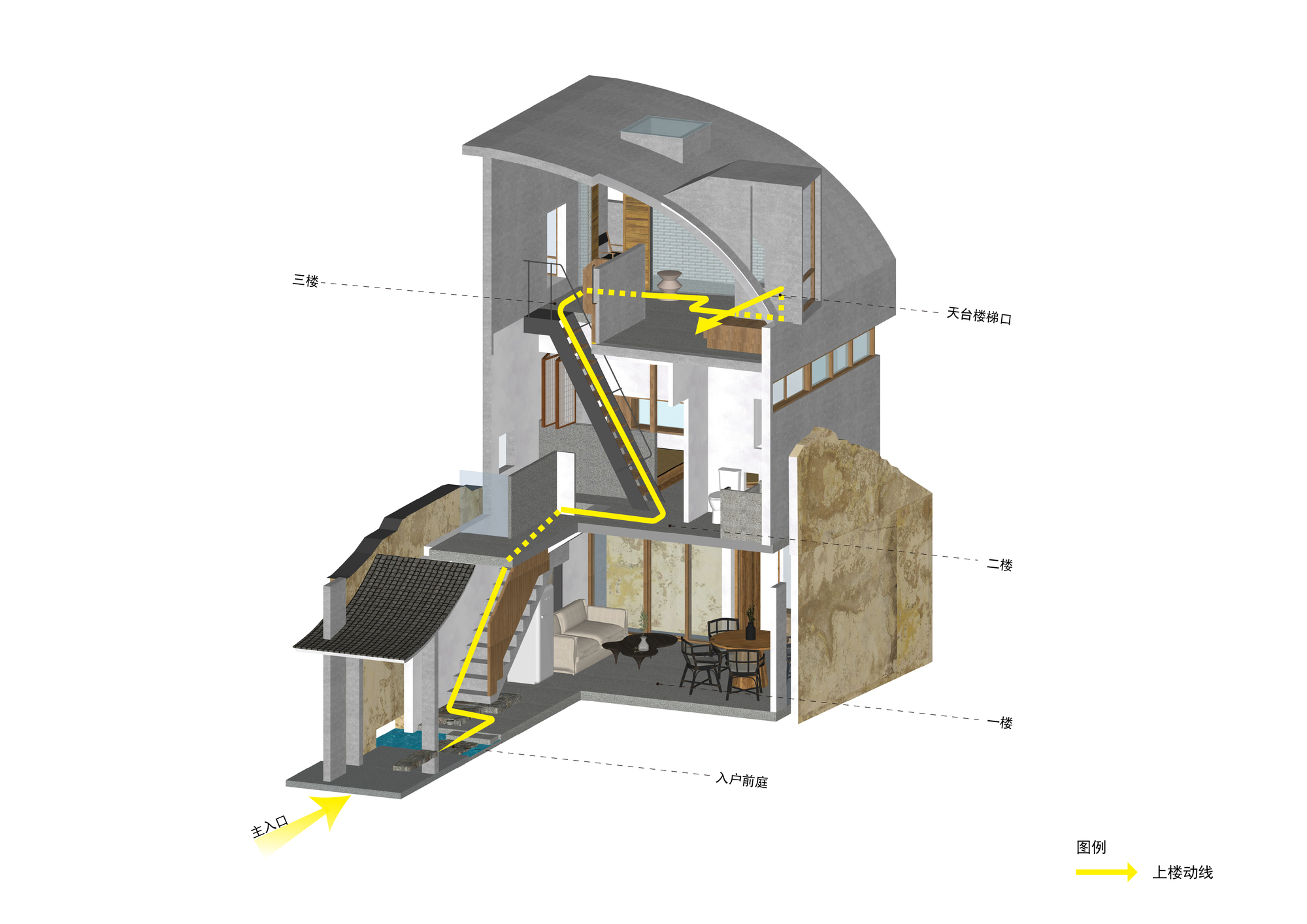 在設計師眼中,這道牆不僅是物理上的邊界,更是情感的載體,是連線過去與未來的關鍵媒介。區別於宗祠家廟等純粹的祭祀空間,這類繼承性祖宅將精神性與日常生活並置,既指向對先人的緬懷,也承載著當下的生活起居。因此,設計的起點便在於如何識別並轉化這些限制中的潛力,將這處坍塌的祖宅,轉化為既能滿足居住功能,又能回應家族情感與文化認同的「日常棲居之所」,讓建築成為連結血緣與地緣的紐帶。