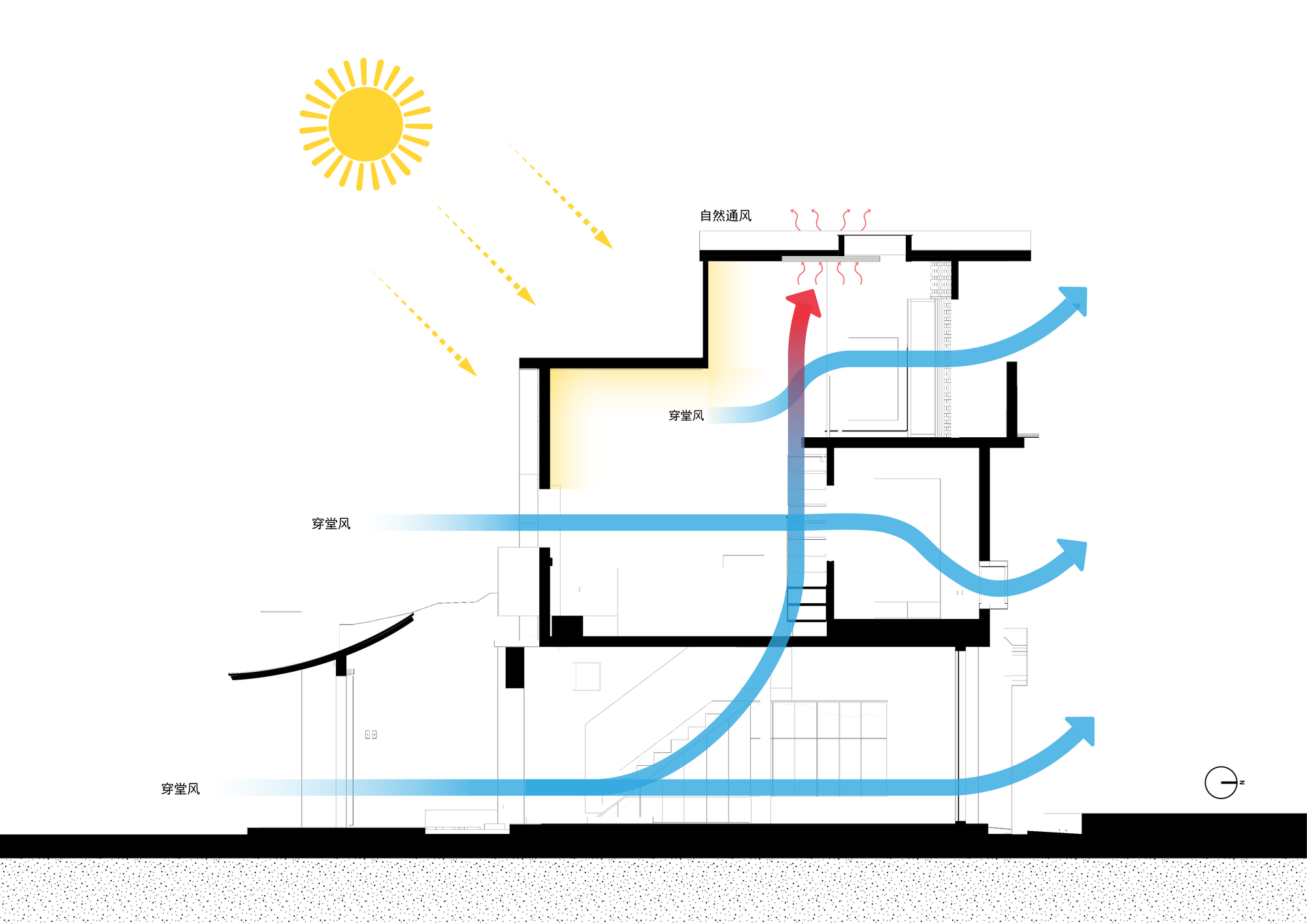 針對嶺南地區悶熱潮濕的氣候特徵,良好的通風成為舒適居住的關鍵。倉北文旅團隊摒棄了全靠機械空調的思維,轉而設計了一套精細的「被動式通風」策略,稱之為「呼吸建構」。首先,利用建築南北向的開口組織穿堂風;其次,在一樓地腳設定隱蔽的進氣格柵,並在三樓屋頂預留排氣風口。這項設計利用熱空氣上升的原理,創造出「煙囪效應」,即使在無風或門窗緊閉的狀態下,也能形成持續的氣流循環,將室內的濁熱空氣排出,引入底部的涼爽空氣。