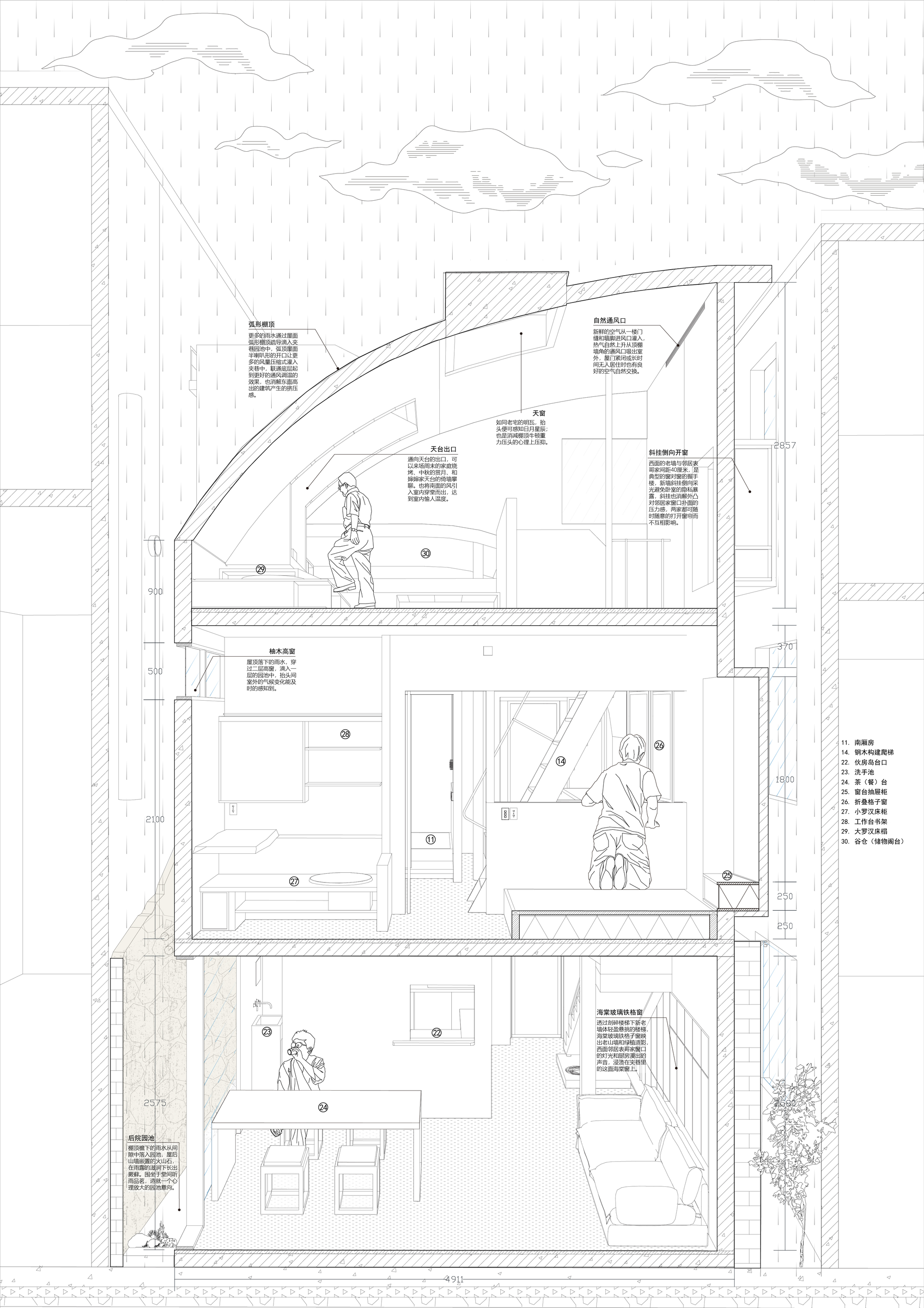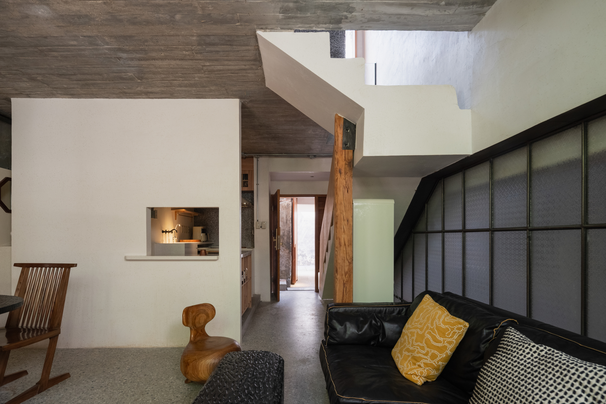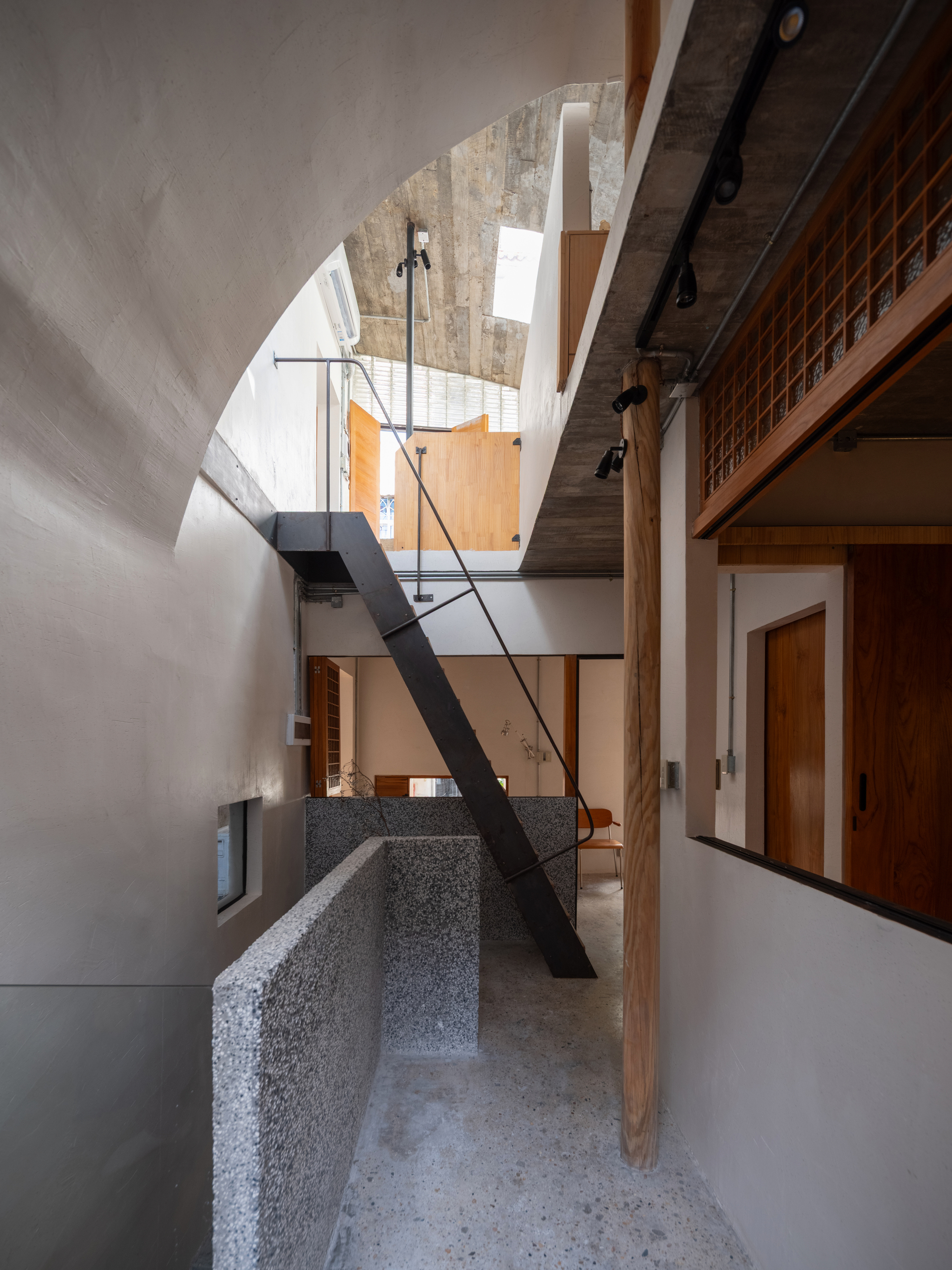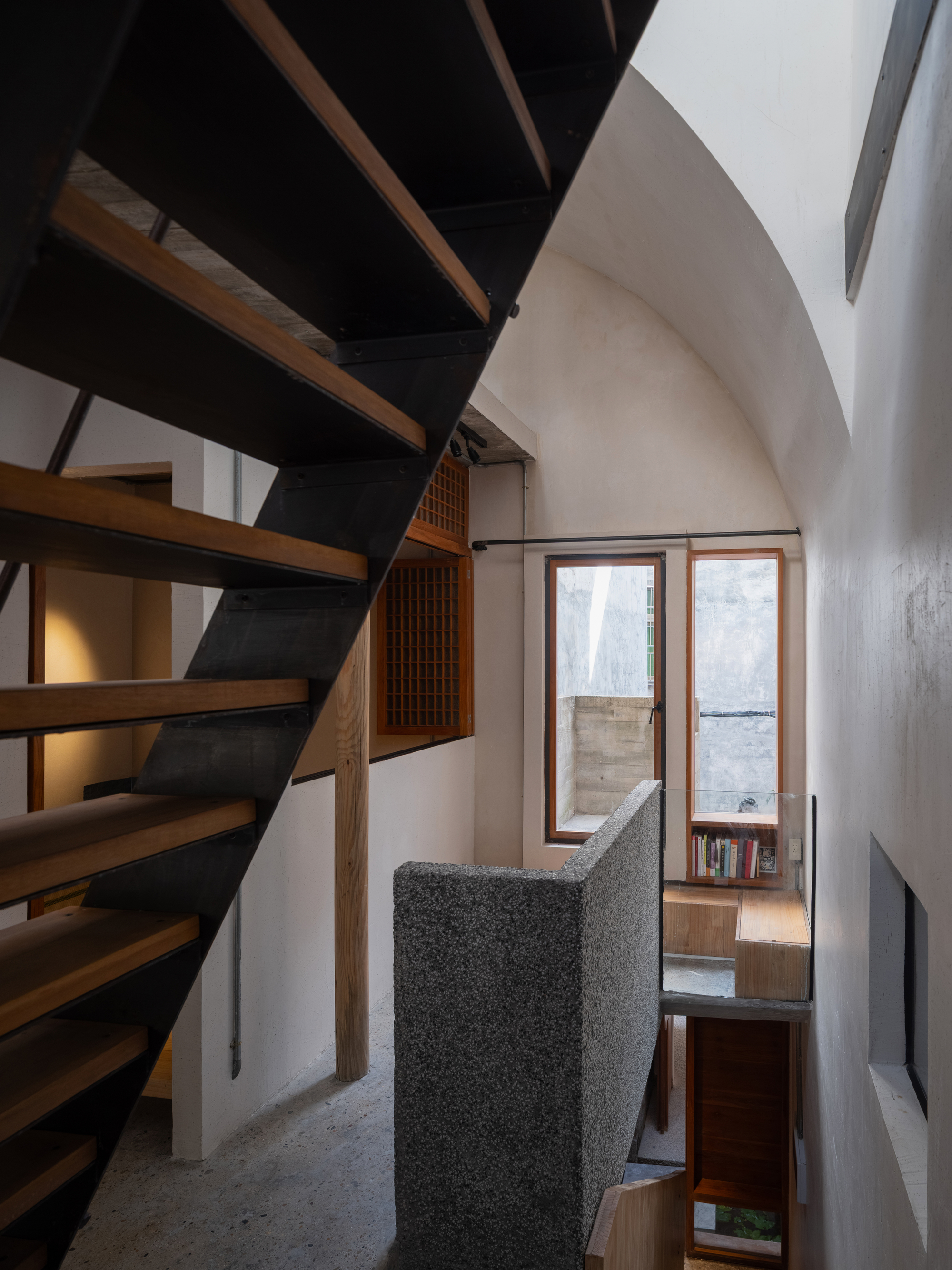 在內部空間的組織上,所有開口與家具的佈置均依據人體的尺度與行為模式進行錨定。通往三層耕讀空間的樓梯設計尤為獨特,其坡度與僅65公分的寬度,刻意回歸了老城窄梯的尺度,使用者必須「手抓護欄,一人上下」。這種受限的、具有明確身體性的攀爬過程,與現代商品住宅中寬大流暢的樓梯形成了鮮明對比,將移動轉化為一種儀式性的體驗。