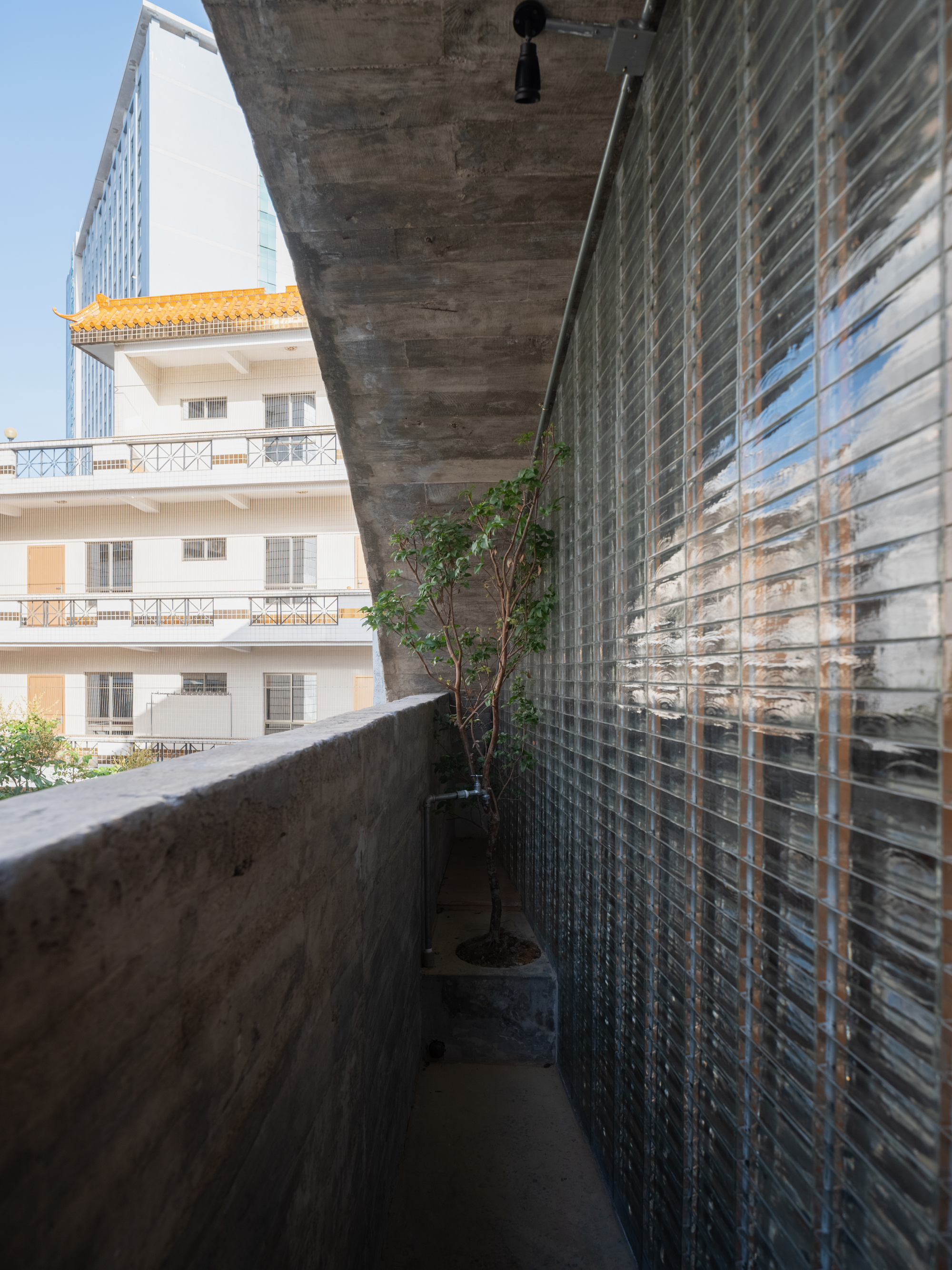 這種處理手法,不僅為室內引入了生機與自然景觀,更在心理上擴展了空間的邊界,讓居住者在方寸之地也能感受到自然的律動。清水混凝土的質感搭配回收老木板轉印的木紋,營造出一種質樸而溫暖的氛圍,回應了反裝飾主義的原則,也讓建築更和諧地融入嶺南的環境之中,展現出大巧若拙的美學境界。