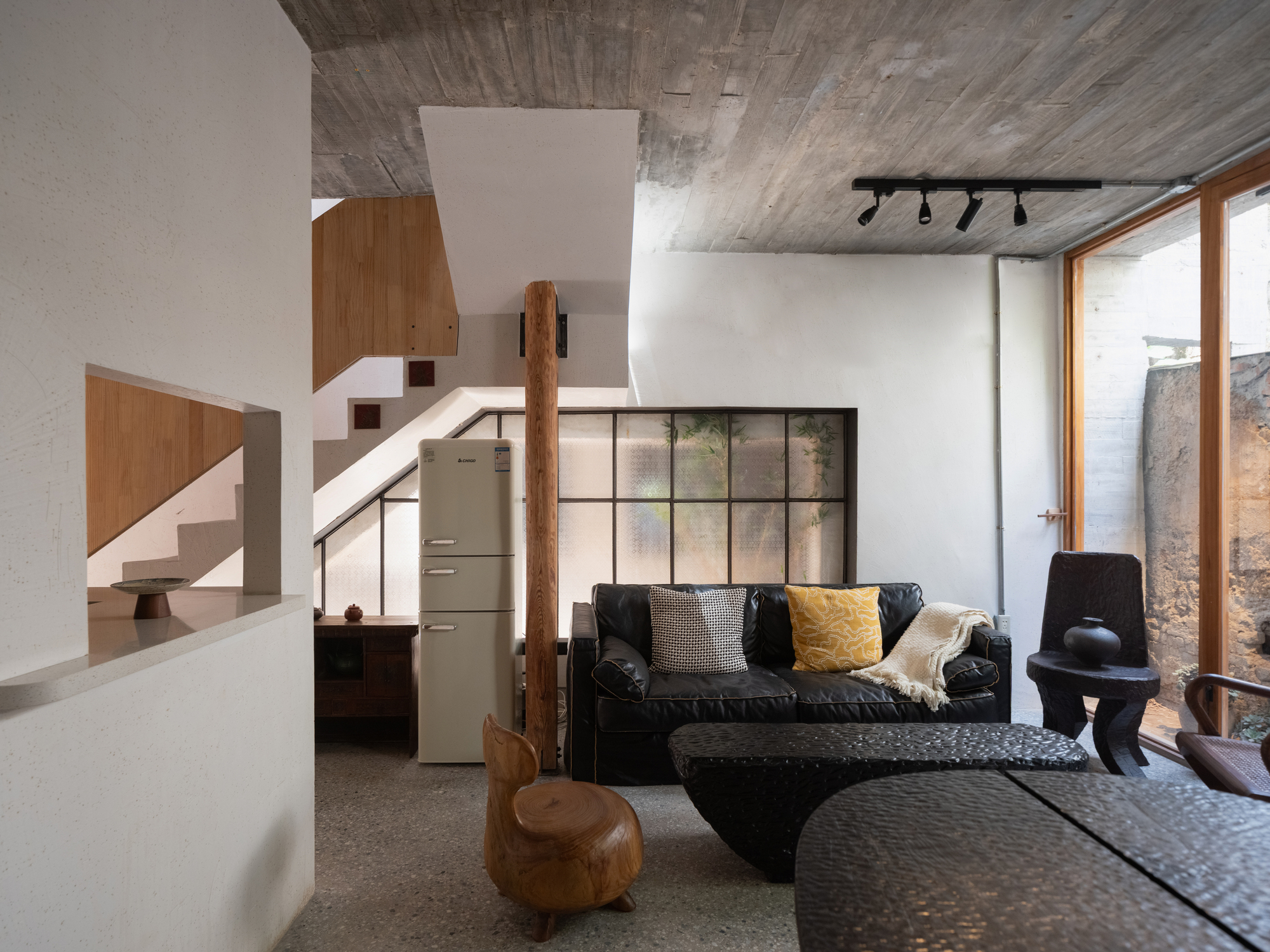傳統民居中的閣樓或穀倉,象徵著「積攢」與「傳承」。學背之家的夾層設計,正是為了保留「儲存」這一家居核心功能的空間屬性,暗示著這個家具有容納時間與記憶的能力。而在寸土寸金的一樓,設計團隊並未試圖將空間填滿,而是塑造了一個具有「前庭後院」感的微縮園池。在這裡,設計師選擇了「留白」,讓光線、微風、雨水和綠植能夠在此自然生長。