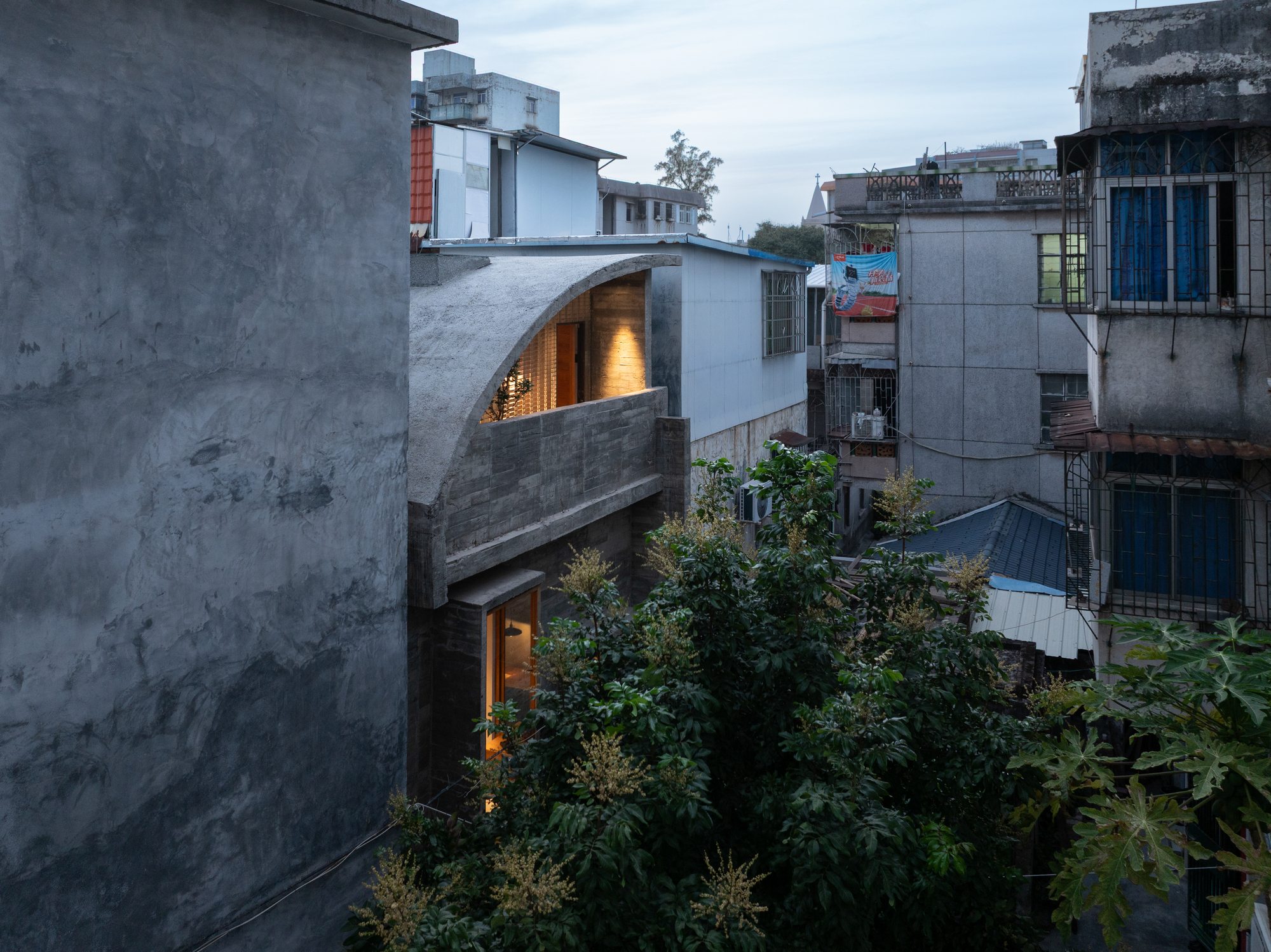 為了化解周邊建築高牆帶來的壓迫感,屋頂被設計成一道舒緩優雅的弧形。這道弧線不僅在視覺上柔化了混凝土四方盒子的僵直感,賦予建築輕盈的意象,更在空間體驗上發揮了重要作用。向外張弓的天弧頂,在視覺上拉高了空間感,消解了內部的侷促;當人置身於三層弧頂之下,坐臥在特意設定的羅漢床榻上時,視線會隨著弧面自然的延伸而顯得更為深遠。