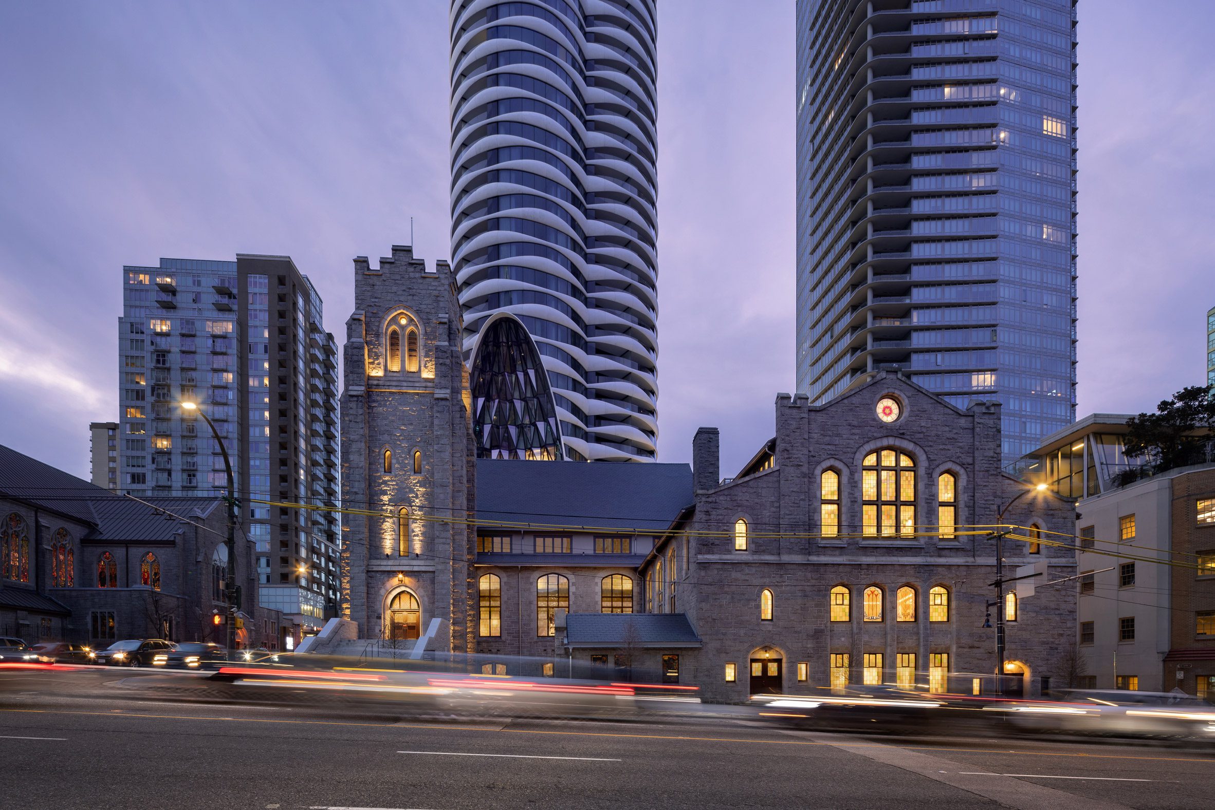 此開發案的另一項卓越成就,在於其對基地旁歷史建築——建於二十世紀初的第一浸信會教堂(First Baptist Church)的審慎整合。建築師並非採取迴避或壓倒的姿態,而是尋求新舊建築間的對話。