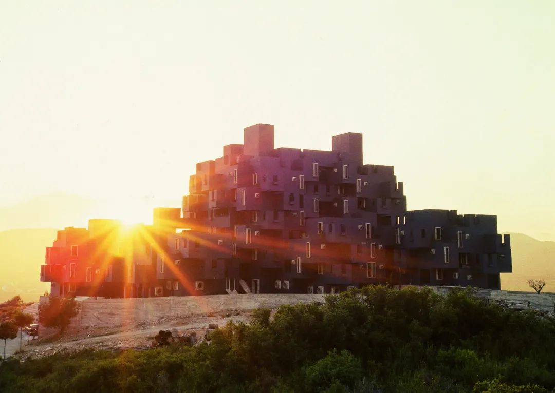 一座令人眼花繚亂的紅色城堡,以錯落有致的線條,和密密麻麻的規整格子狀,魔幻而迷離地聳立在海岸線上。迷宮一樣的巨大宮殿,在陽光下散發出耀眼的淡藍色,淡紫色和紅色。以令人言喻的古怪感,致敬後現代建築。