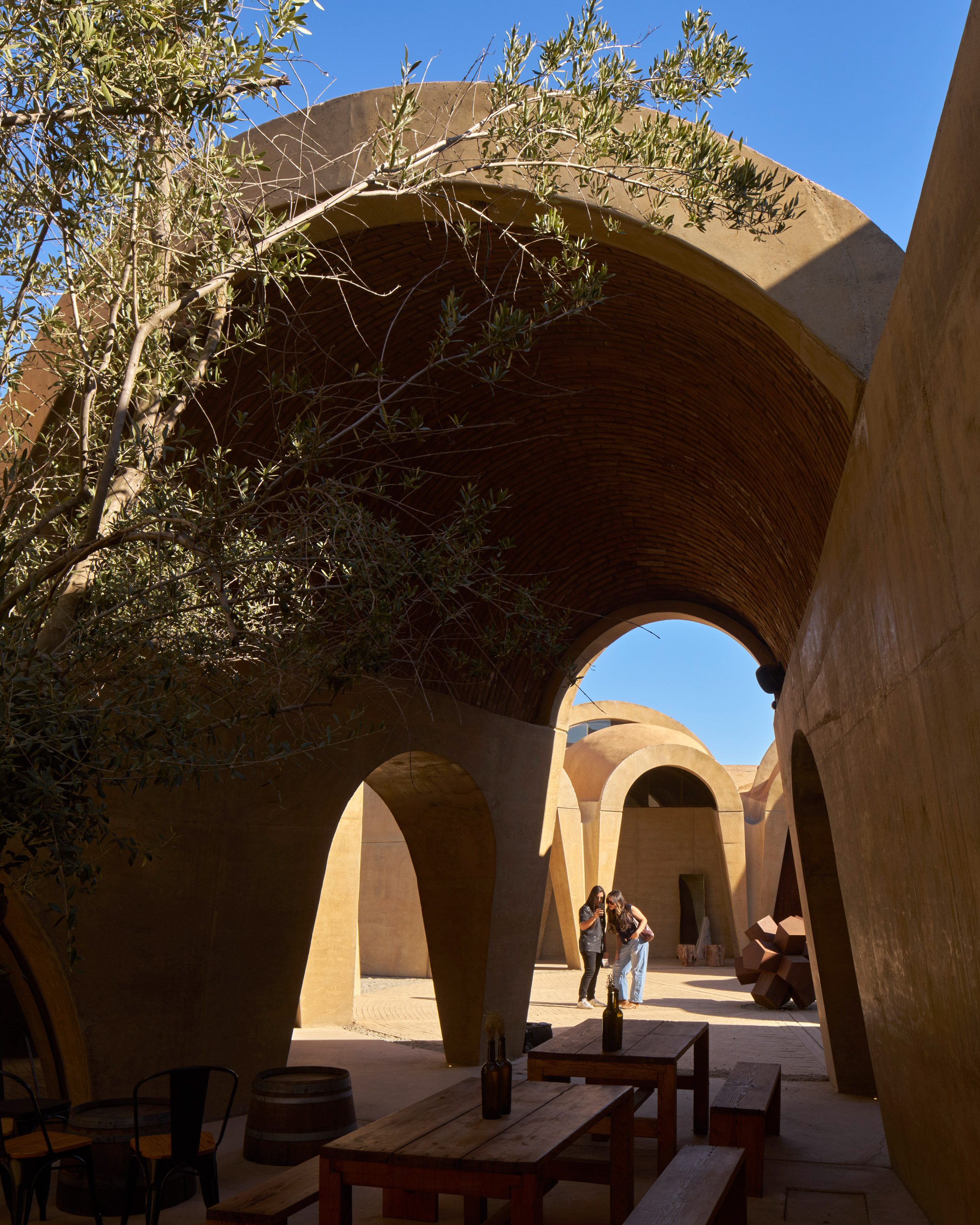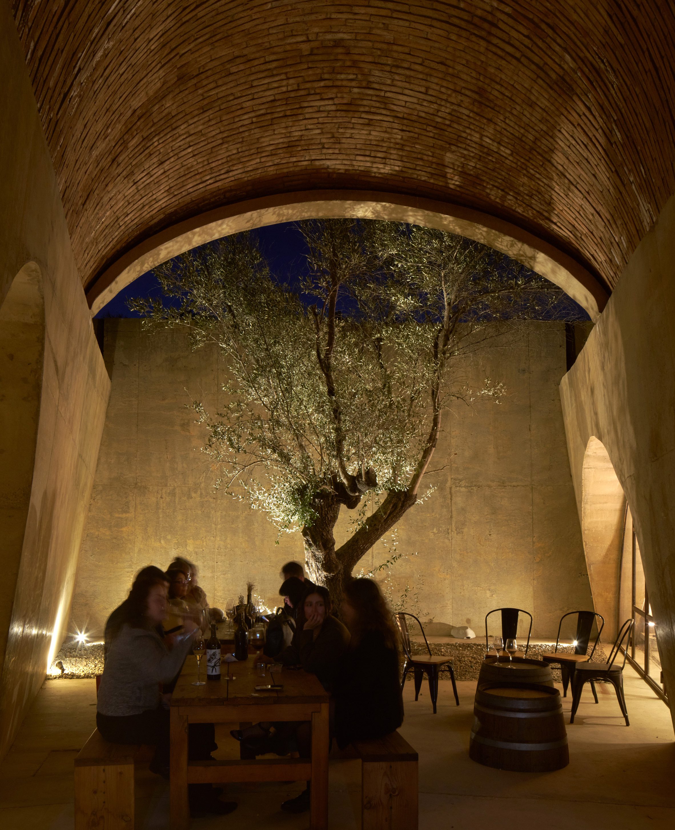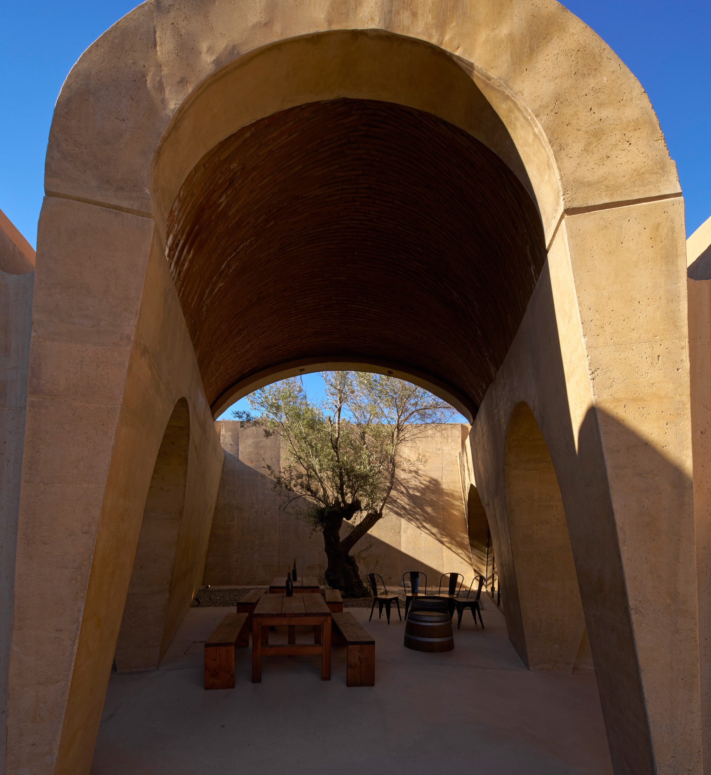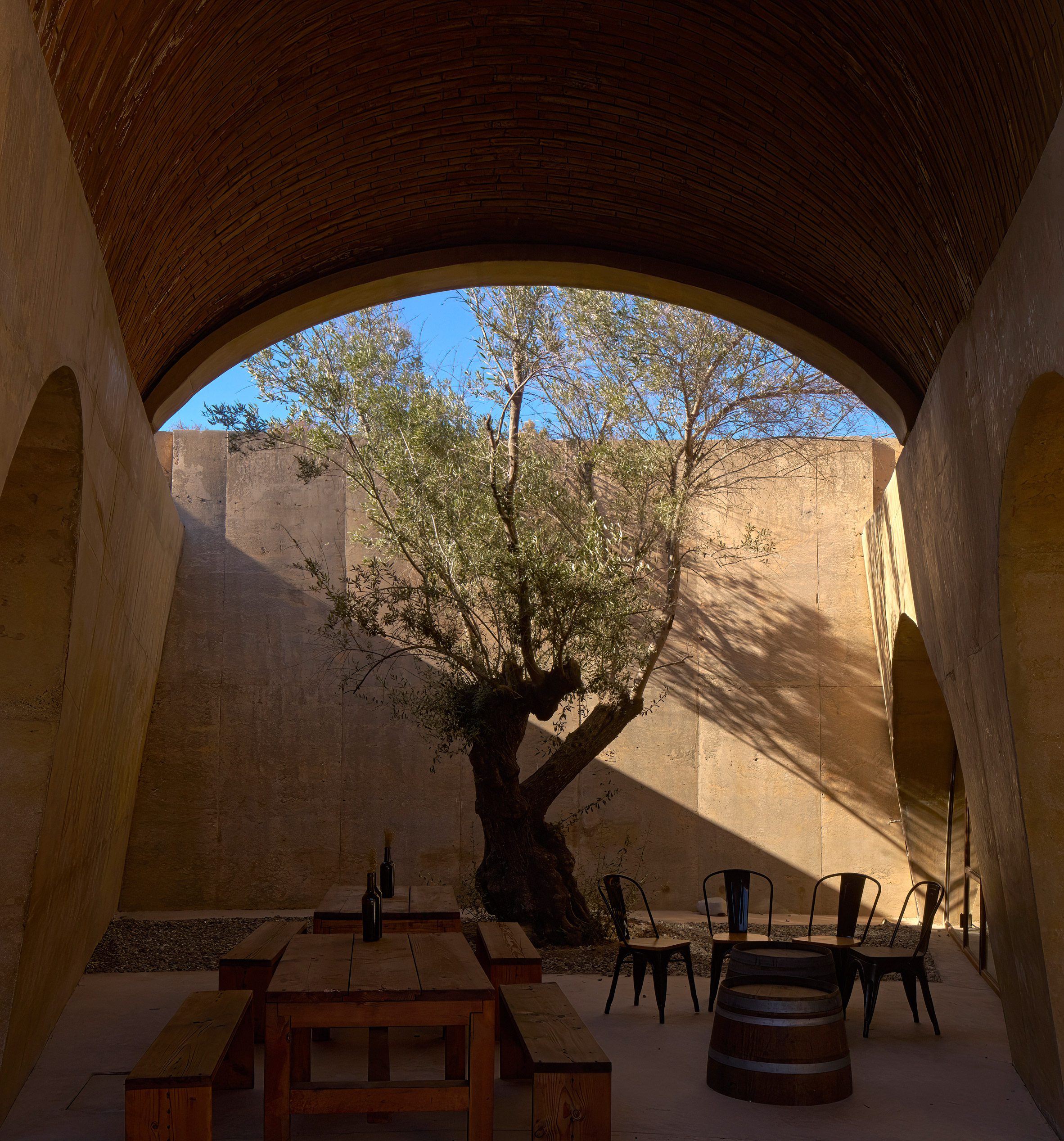 環繞著中央庭院,兩圈氣泡狀的拱頂序列井然,將釀酒廠的生產、儲存及款待賓客等多元空間,悉數收納於炙燒陶磚構築的穹頂之下。厚重的拋物線混凝土拱門,形塑出通往品酒、裝瓶、橡木桶陳放區,以及後勤空間的垂墜入口。建築師特別抽除了東側的拱頂,創造出一座露天花園,引天光入室。佈局參照了十六世紀修道院的內廊設計,提升空間使用效率,減少不必要的動線,更促進內部空氣的交叉對流。