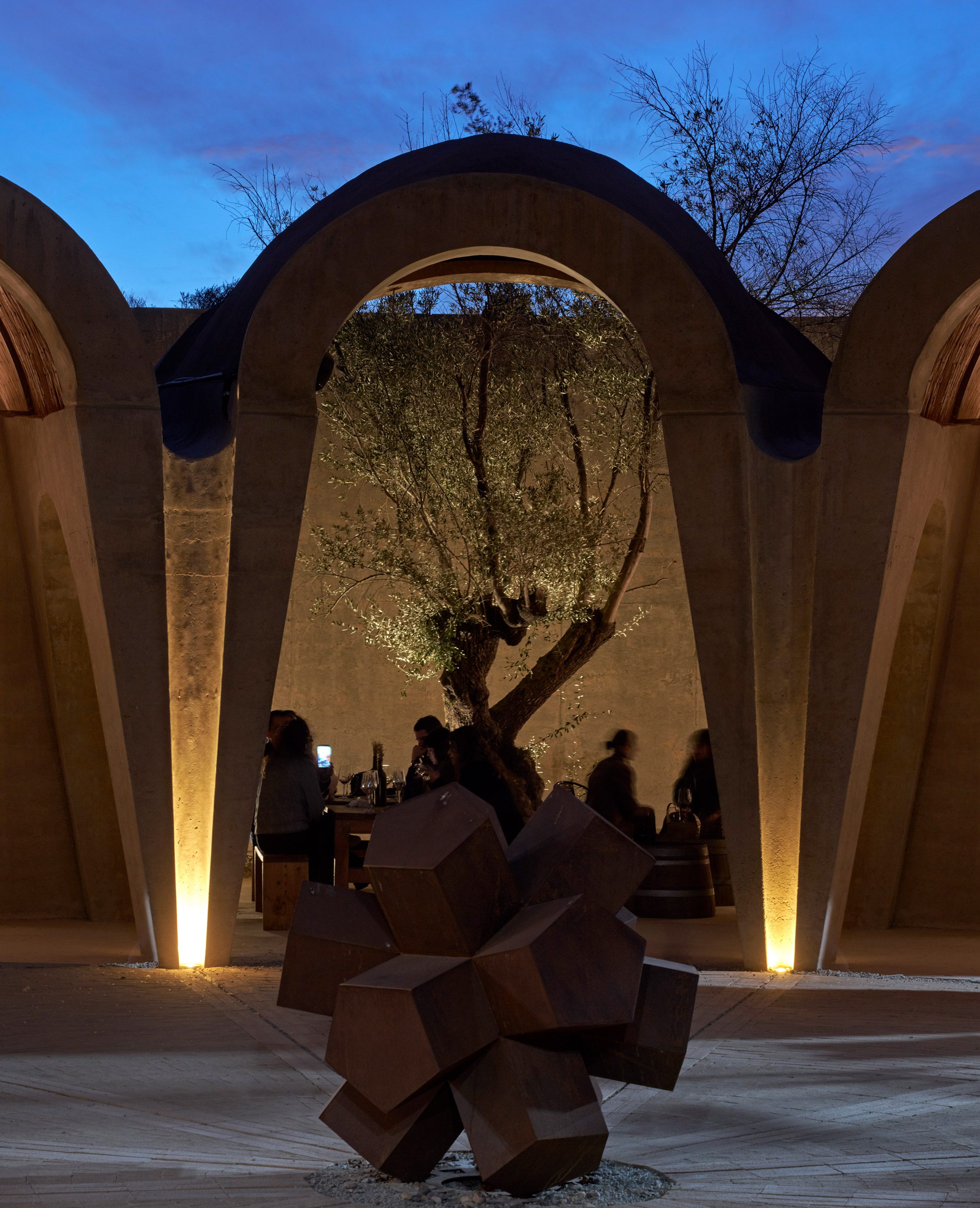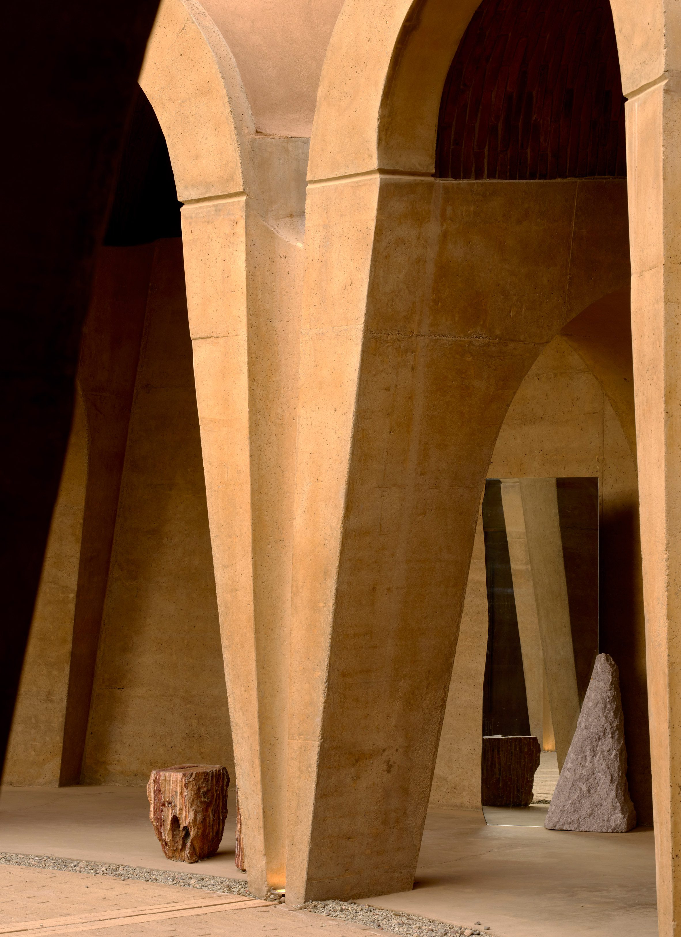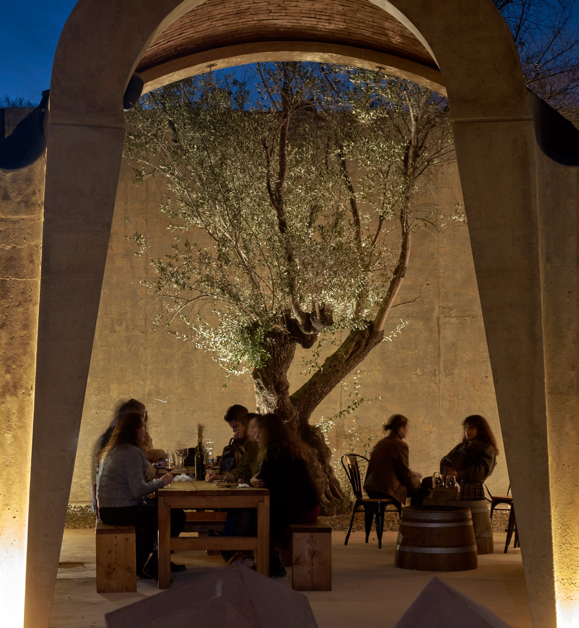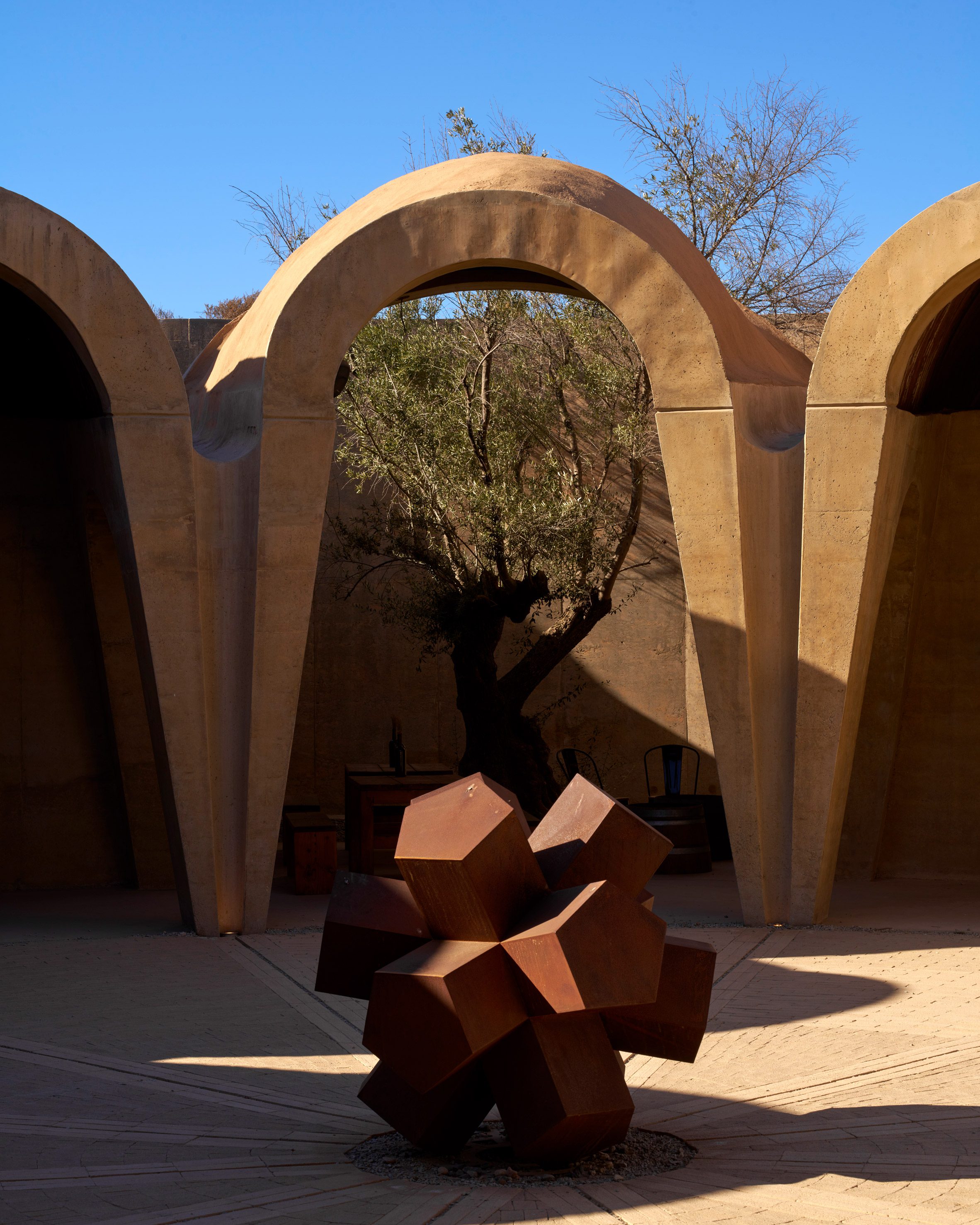 環繞著中央庭院,兩圈氣泡狀的拱頂序列井然,將釀酒廠的生產、儲存及款待賓客等多元空間,悉數收納於炙燒陶磚構築的穹頂之下。厚重的拋物線混凝土拱門,形塑出通往品酒、裝瓶、橡木桶陳放區,以及後勤空間的垂墜入口。建築師特別抽除了東側的拱頂,創造出一座露天花園,引天光入室。佈局參照了十六世紀修道院的內廊設計,提升空間使用效率,減少不必要的動線,更促進內部空氣的交叉對流。