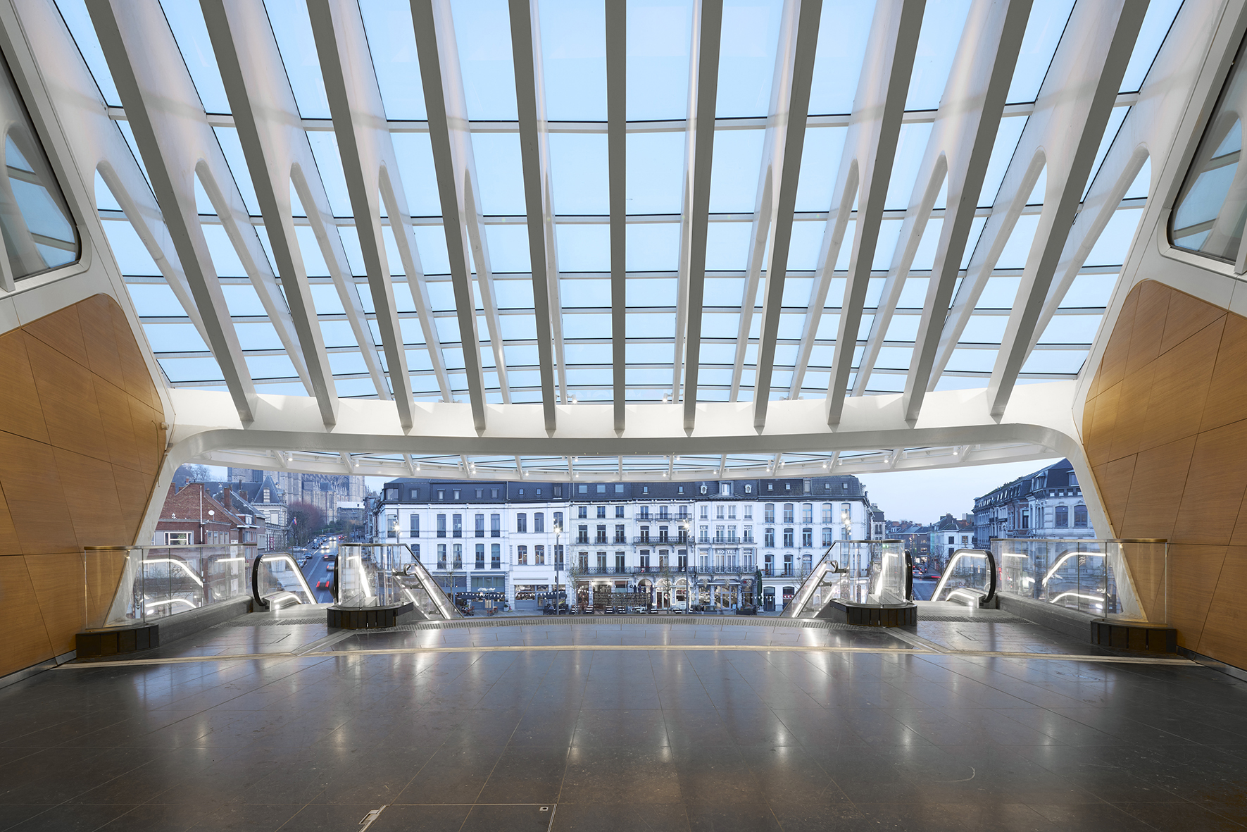 從街道上看,車站的白色外型以精準的工藝與巨大的尺度吸引著人們的目光。巨大的玻璃頂篷以連續的曲線向外伸展,為下方通往主大廳的宏偉樓梯與電扶梯提供遮蔭