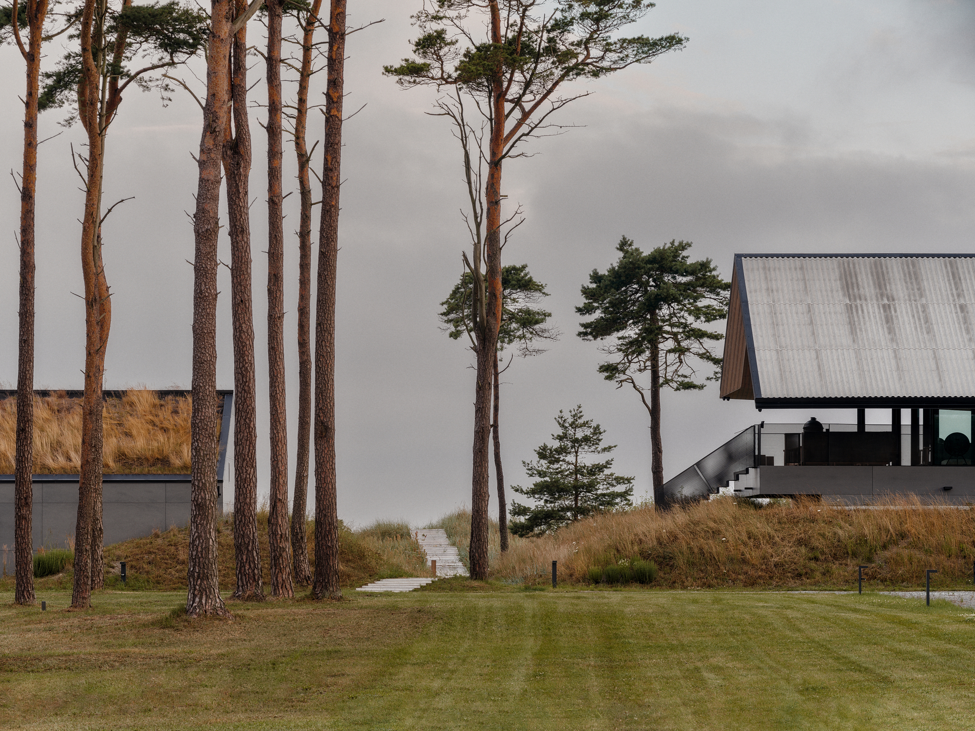 主屋的生活場域從二樓展開,入口則刻意隱藏於量體下方。高懸於波羅的海地平線之上,整座宅邸宛如橋樑般橫跨兩座碉堡地基,藉由懸挑設計擴充居住面積,將對周遭脆弱沙丘環境的干擾降至最低。
