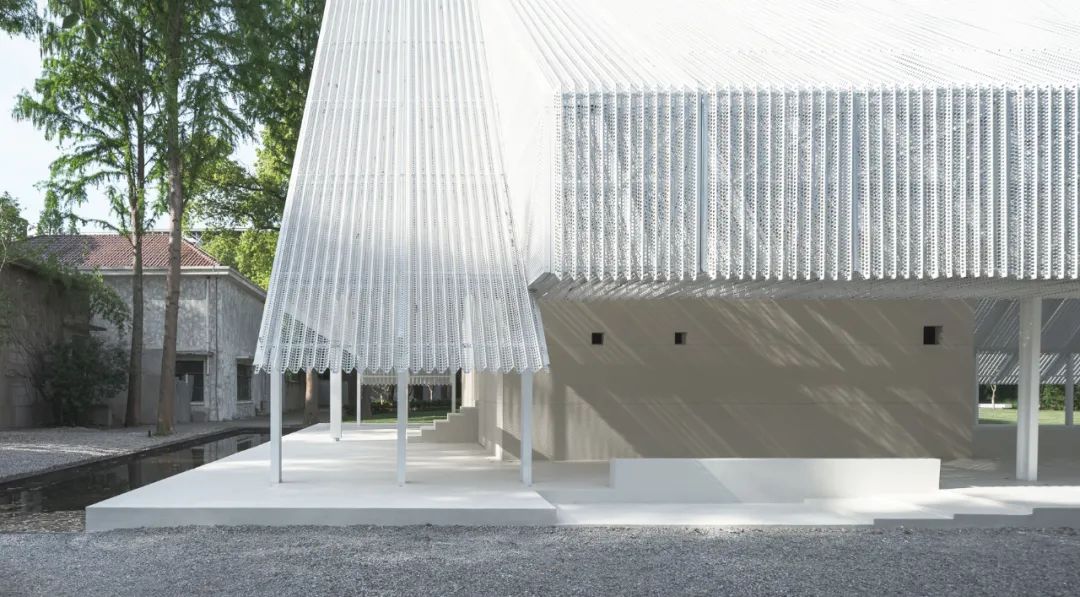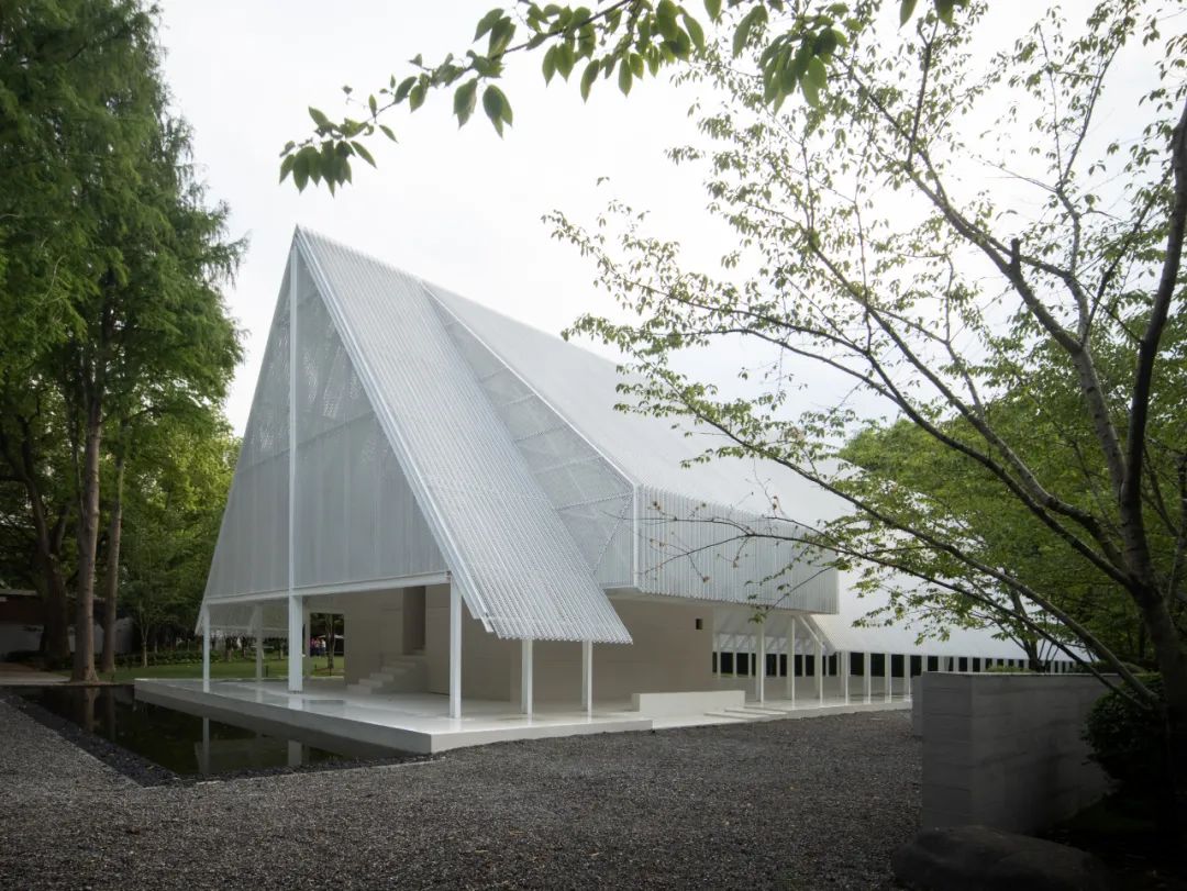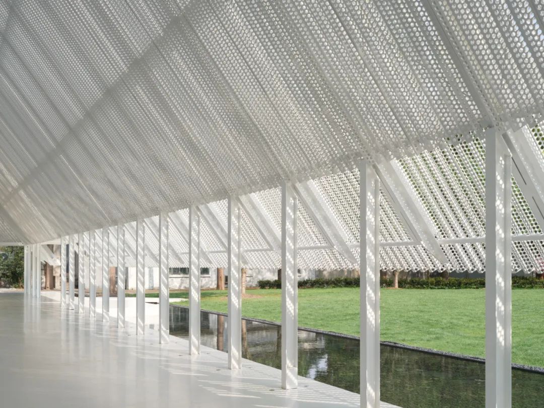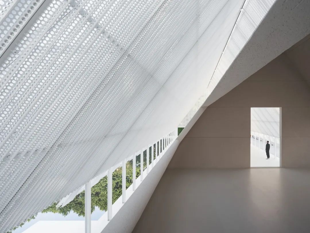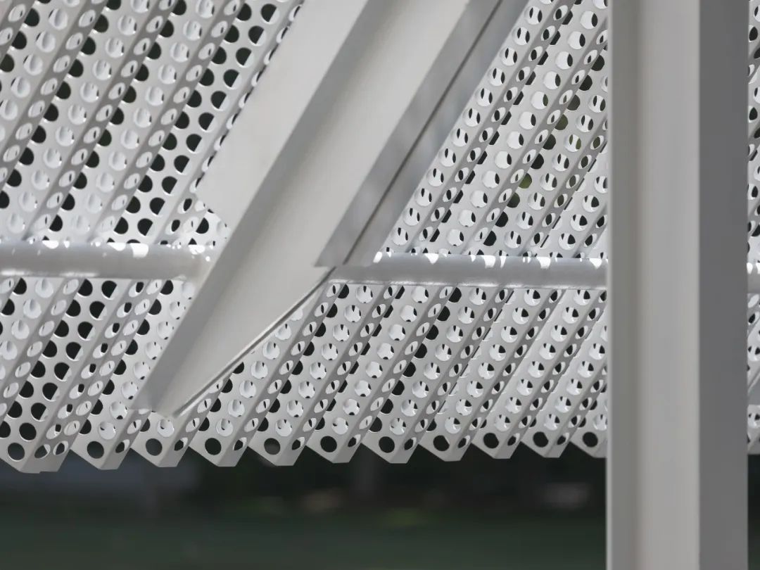 屋頂材料選用預鑄沖孔板,單元式的組裝確保現場快速施工,其質密多孔的材料提供了不同尺度的視覺感受,乍看簡約,細觀有物。雙層沖孔板也成為內部空間與外部環境之間的過濾器——陰天時沉靜,晴天時和煦。屋頂的形體在入口處異變為掀起的切口,邀請人們進入。內部空間高聳而闊大,猶如空白畫布,容許使用者在後續增添色彩。