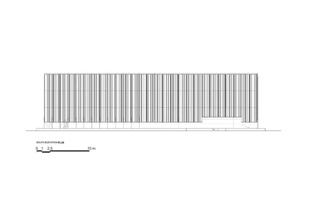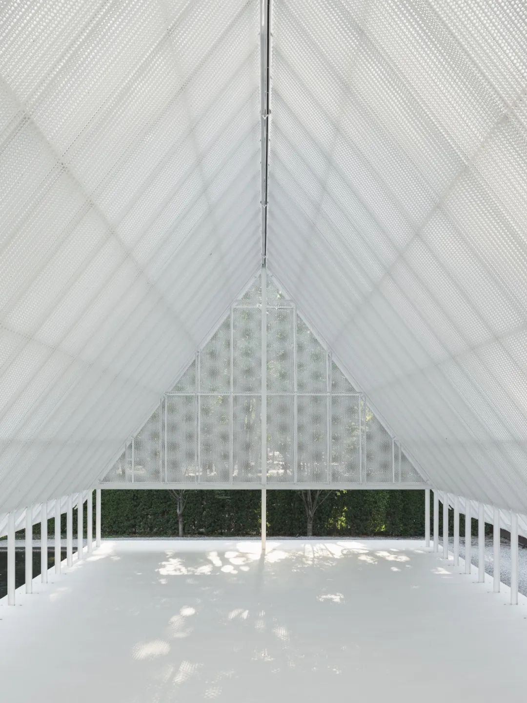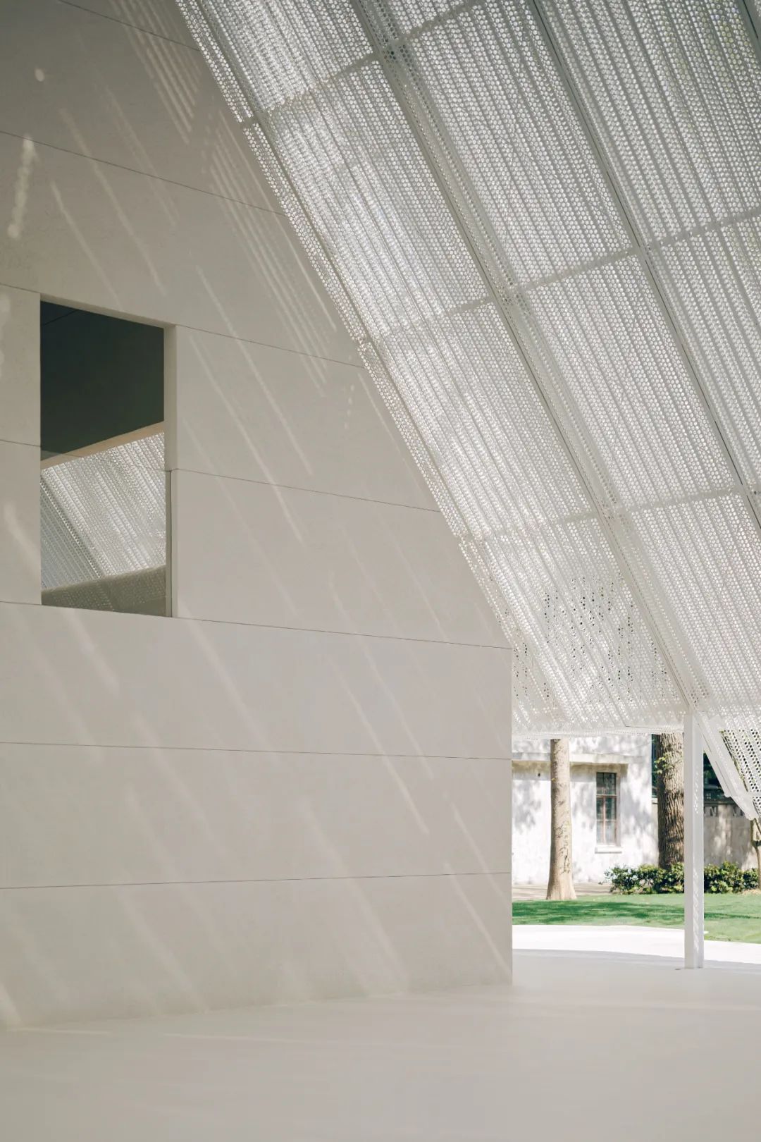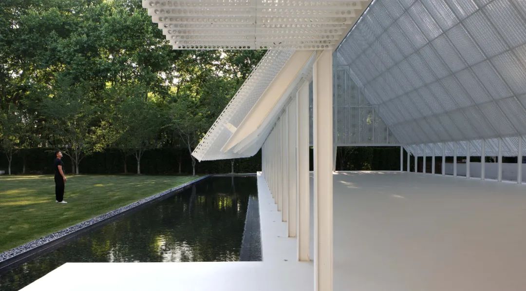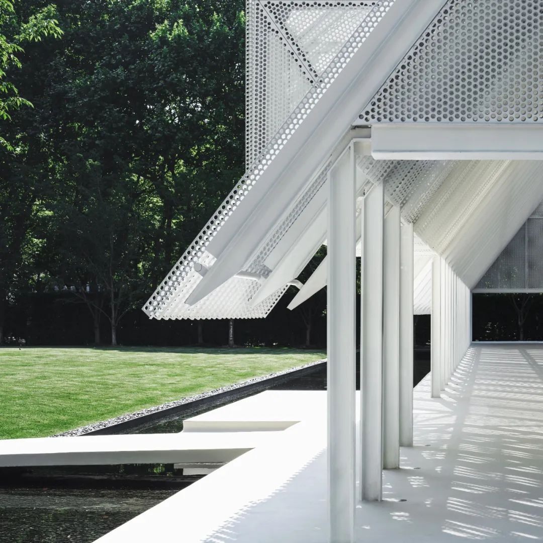 屋頂材料選用預鑄沖孔板,單元式的組裝確保現場快速施工,其質密多孔的材料提供了不同尺度的視覺感受,乍看簡約,細觀有物。雙層沖孔板也成為內部空間與外部環境之間的過濾器——陰天時沉靜,晴天時和煦。屋頂的形體在入口處異變為掀起的切口,邀請人們進入。內部空間高聳而闊大,猶如空白畫布,容許使用者在後續增添色彩。