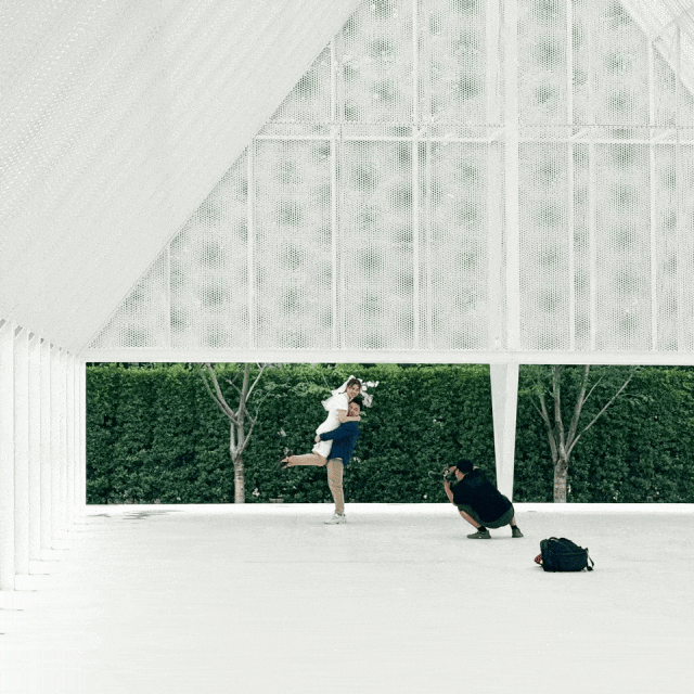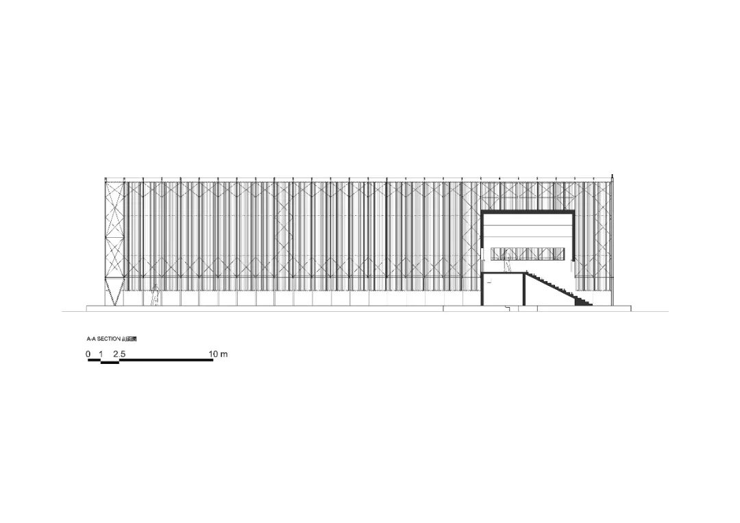 主體建築由羽翼般的鋼結構屋架與地景般的基座組成,屋架懸浮於基座之上。纖細的鋼架陣列排開,輕盈通透的同時平衡了用鋼量與結構效率。截面僅有100*150mm的工字鋼柱支撐起長度42m,跨度15m,高度12m的開放空間,服務於婚禮、活動、展覽與集會的需求。