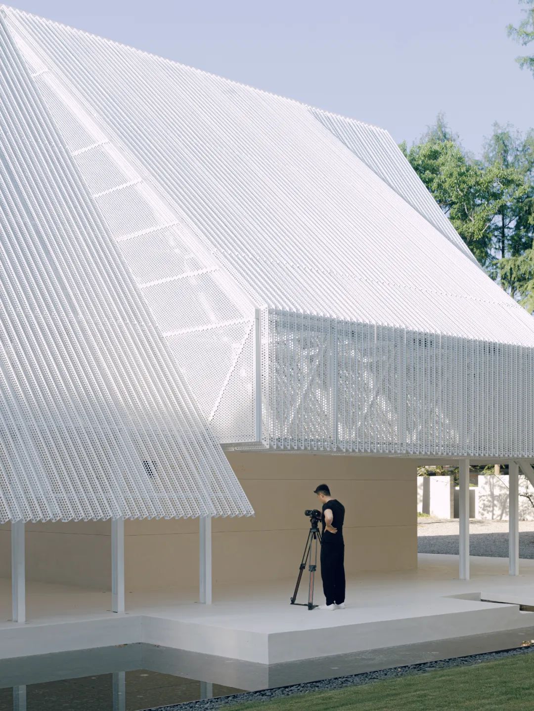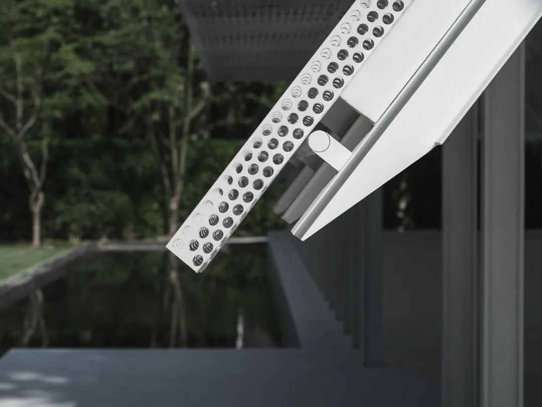 微風禮堂被視為一個承載城市集體記憶的庇護所,它除了具有震撼、高聳、超尺度的儀式空間,也充滿了人體尺度的細部與材料處理——低垂的屋簷有意將雨水引流至水池並收集起來,儘可能少的藉著人工補給;雙層沖孔板依靠屋架的廓形實現了風拔的效果,屋脊處留出的間隙與水池的蒸發聯動,形成了微風流動的局部氣候,哪怕在酷熱的夏天,也有習習涼風穿行其中;