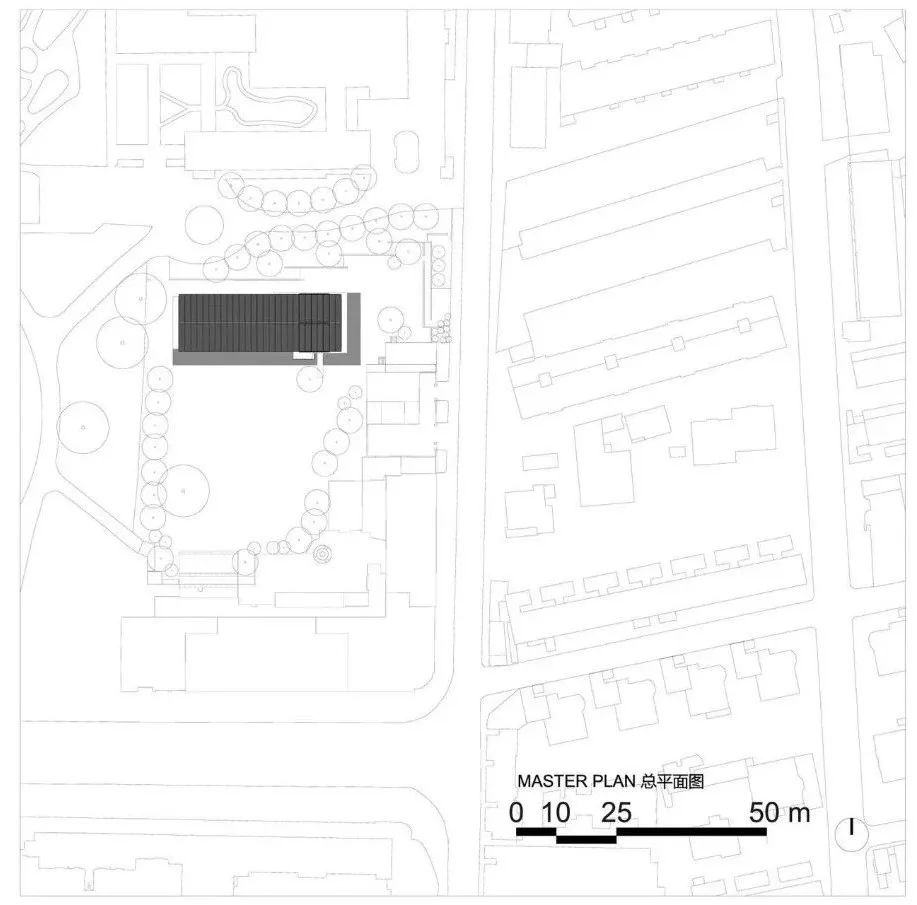 微風禮堂座落於上海最重要的紀念性公園——魯迅公園內。它的前身是魯迅紀念館南側的一片雜樹林,被柵欄劃歸為公園的邊角,淪為城市發展的碎片而被人遺忘。2023年,SHISUO是所對這片基地進行重新梳理——散落在基地中的一部分樹被移栽到建築南側,與紀念館前原有的一排樹構成步道,也為新建築提供了緩衝的邊界;其他樹被移栽到基地兩翼,形成一大片圍塑的空地;大型喬木與竹林則被保留,新置入的動線與它們巧妙應和,成為路徑轉換中的景觀,這些調整賦予基地更多的公共性。西側的世界文豪廣場林木蔭蔽,城中的老人們在這裡聚會談天、唱歌跳舞,是這裡每天的日常,而微風禮堂就座落在它的旁側。
