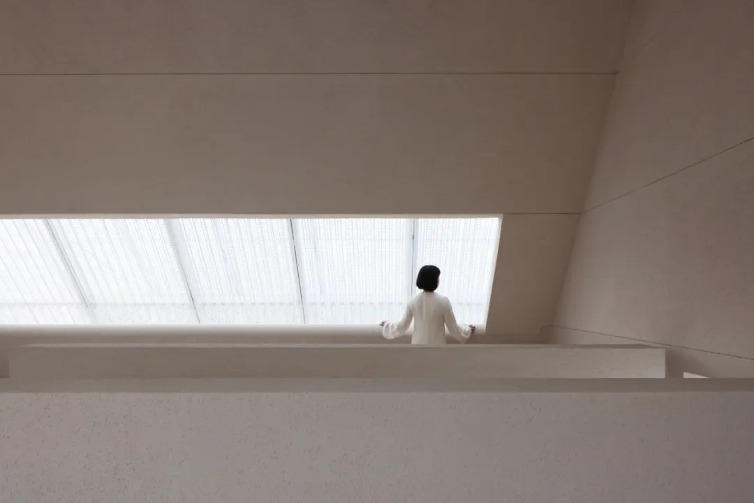 低矮的屋簷過濾了對面商業街的嘈雜,只露出水池的倒影與綿延的草地。在這裡,氣流、光線、鳥鳴穿行而過,雜亂的世俗卻被阻隔在外。地景般的基座與基地發生多樣的互動,或成為拾級而上的踏步與觀景長凳,或成為一道連接建築與草地的虹橋,又或者變化為親水平台。