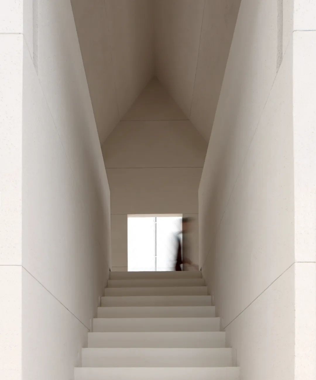 在內部,基座向上聳立並凝固成為一個抽象的房子,讓人想起靜默無言的碑或塔。它背後峽谷般的樓梯指引人們來到更高處的平台,眺望屋架的框景與光影的變幻;兩側條窗則將光線引入內部,人們在這裡回看入口的景象。每日清晨,太陽從它的背後升起,光暈會賦予它神秘而神聖的色彩。