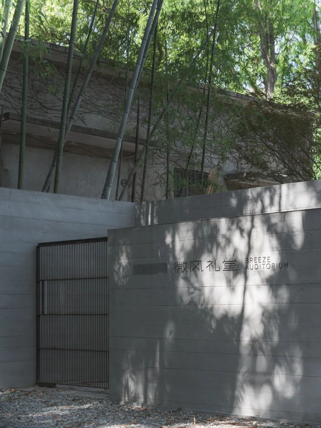 當從城市道路進入,踏上古樸的條石台階,穿過一從竹林,碎石在腳下沙沙作響。用手握緊移門,也許會留下些許鏽跡。伴隨著它的滑動,進入甬道,緩坡逐漸抬升,在這個過程中看不見任何禮堂的痕跡,只有垂落的樹影和長長的甬道。