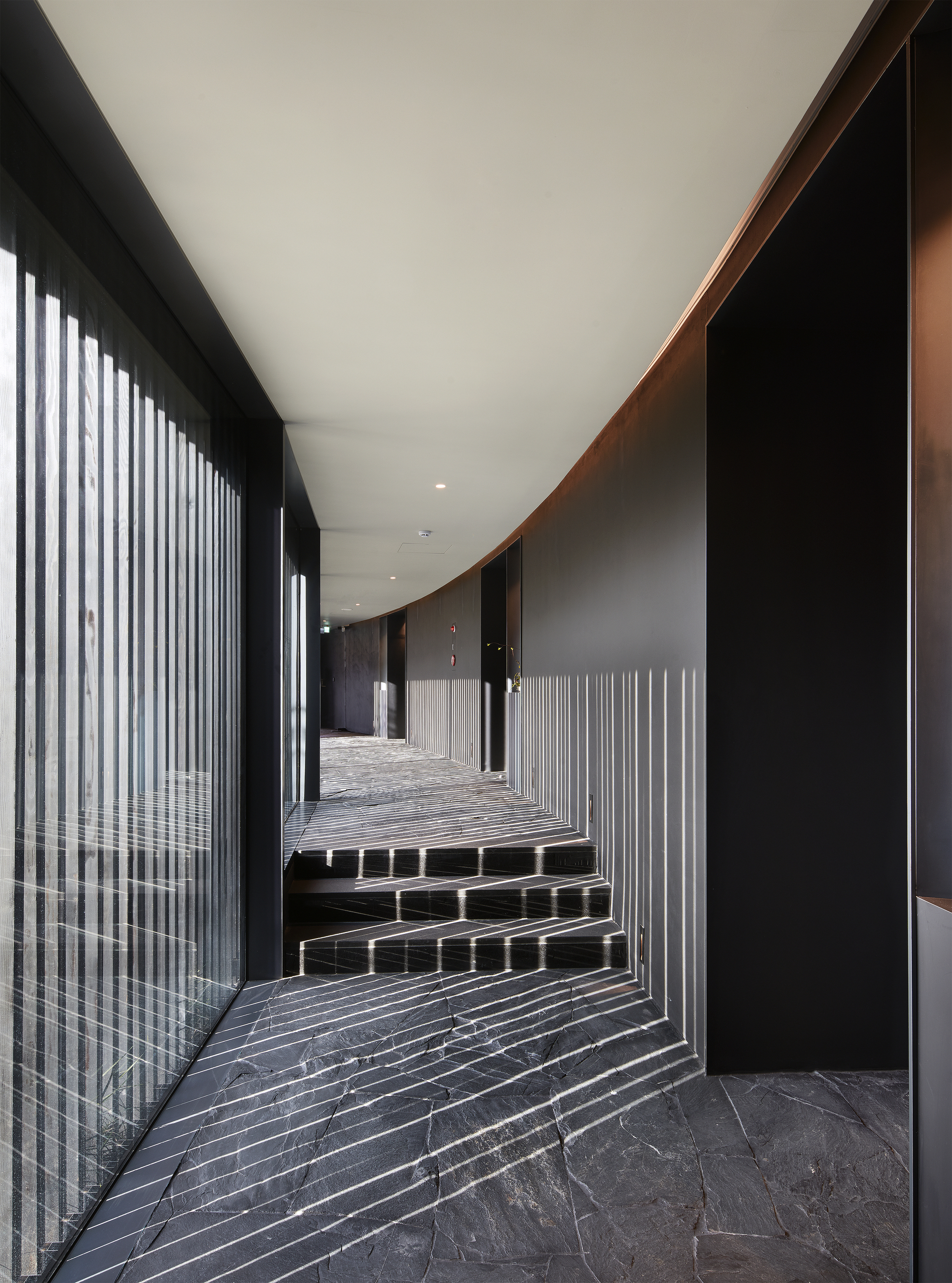 建築量體主要分為東西兩翼。西翼延伸自業主的居住空間,包含了畫廊與名為Sicha的咖啡廳。在這裡,訪客可以靜坐品茗,欣賞池塘中倒映的天空與花園景致,感受靜謐的氛圍。東翼則規劃為招待所,其設計重點在於光影的演繹。沿著走廊設置的垂直百葉,隨著日照角度的變化,在室內投射出律動的光影線條,讓居住者能直觀地感受到時間的流逝。走廊上的門扉通往圍繞中庭配置的客房,這種內向型的設計進一步強化了私密性與寧靜感,為使用者提供了一個遠離塵囂、專注於當下的心靈角落。