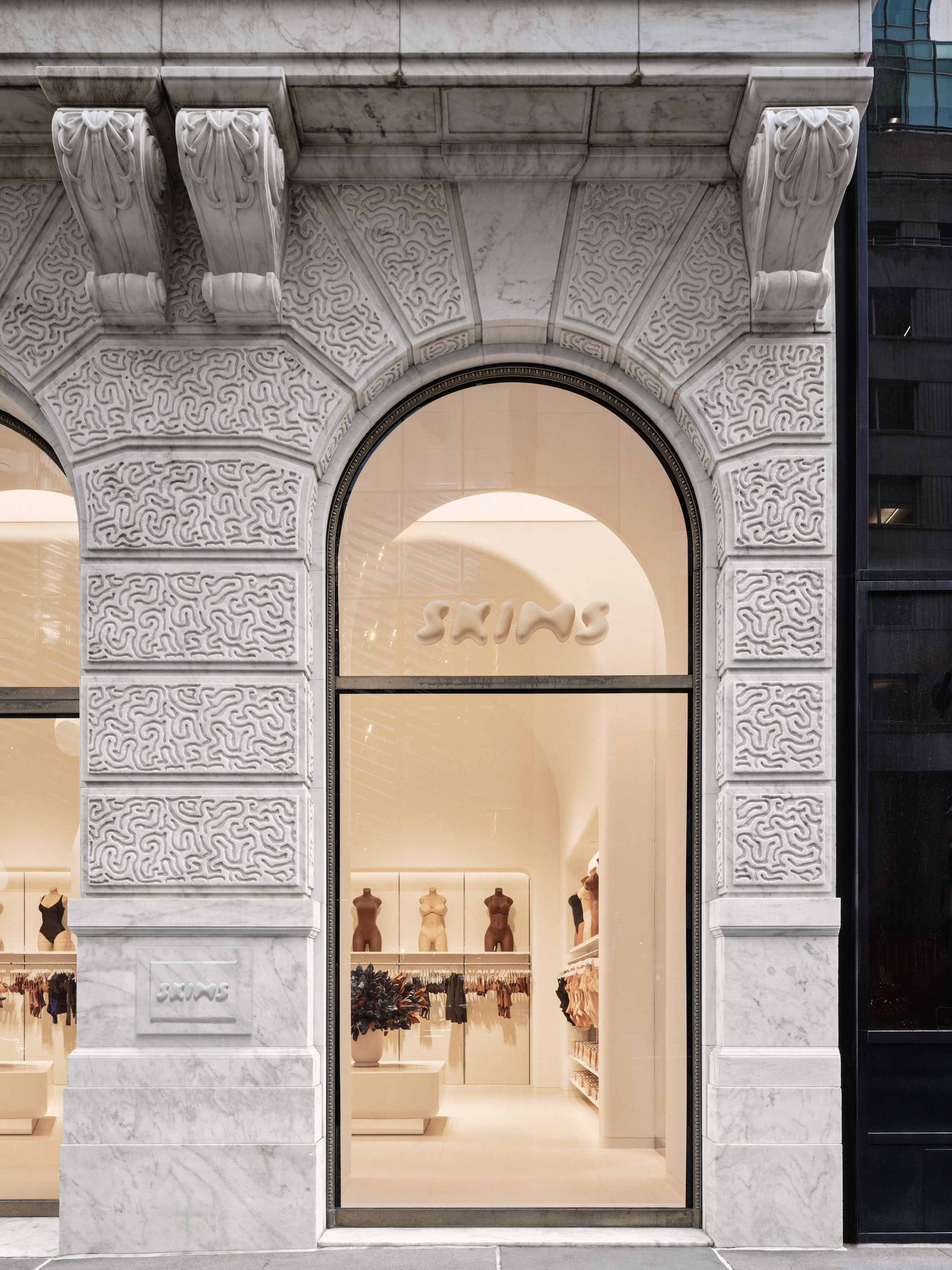 美國真人秀電視節目明星金·卡戴珊(Kim Kardashian)創立的服裝品牌「SKIMS」於2024年12月12日在紐約第五大道(647 Fifth Avenue)開設了第一間旗艦店,選址在一棟擁有華麗石材立面的歷史建築中,距離聖派屈克大教堂(St Patrick’s Cathedral)僅一個街區,與洛克菲勒中心(Rockefeller Center)隔街相望,地理位置優越,周圍環繞著眾多國際知名品牌,展現出SKIMS 進軍高端市場的雄心壯志。這家旗艦店的開幕,標誌著 SKIMS 從線上品牌走向線下開設實體店,也為紐約的零售業注入一股活力。