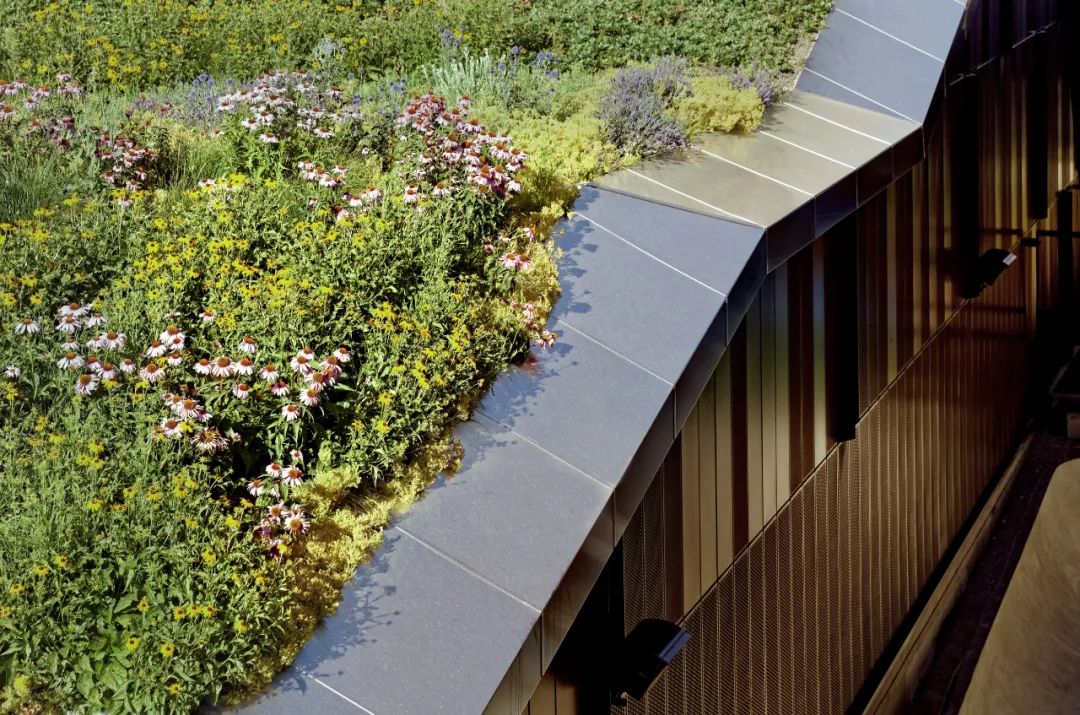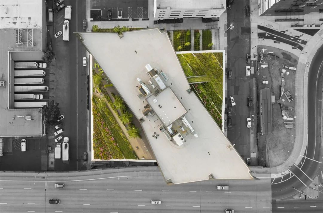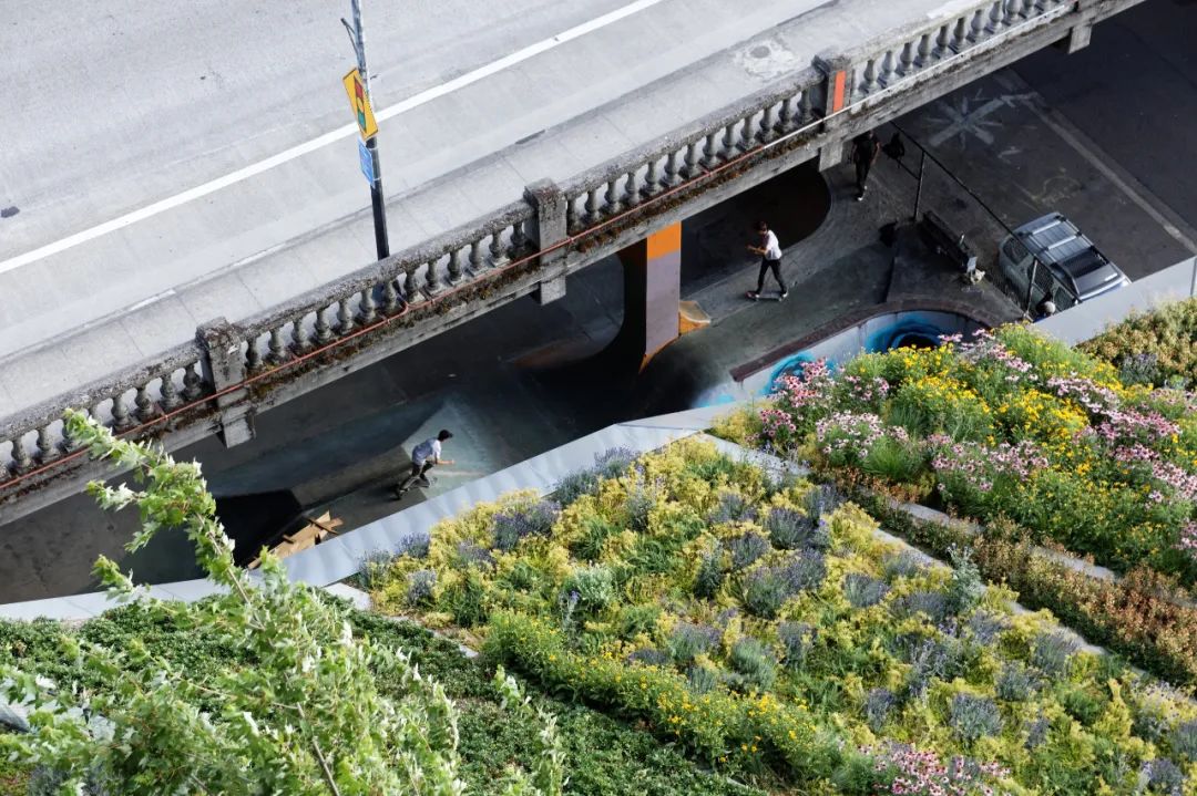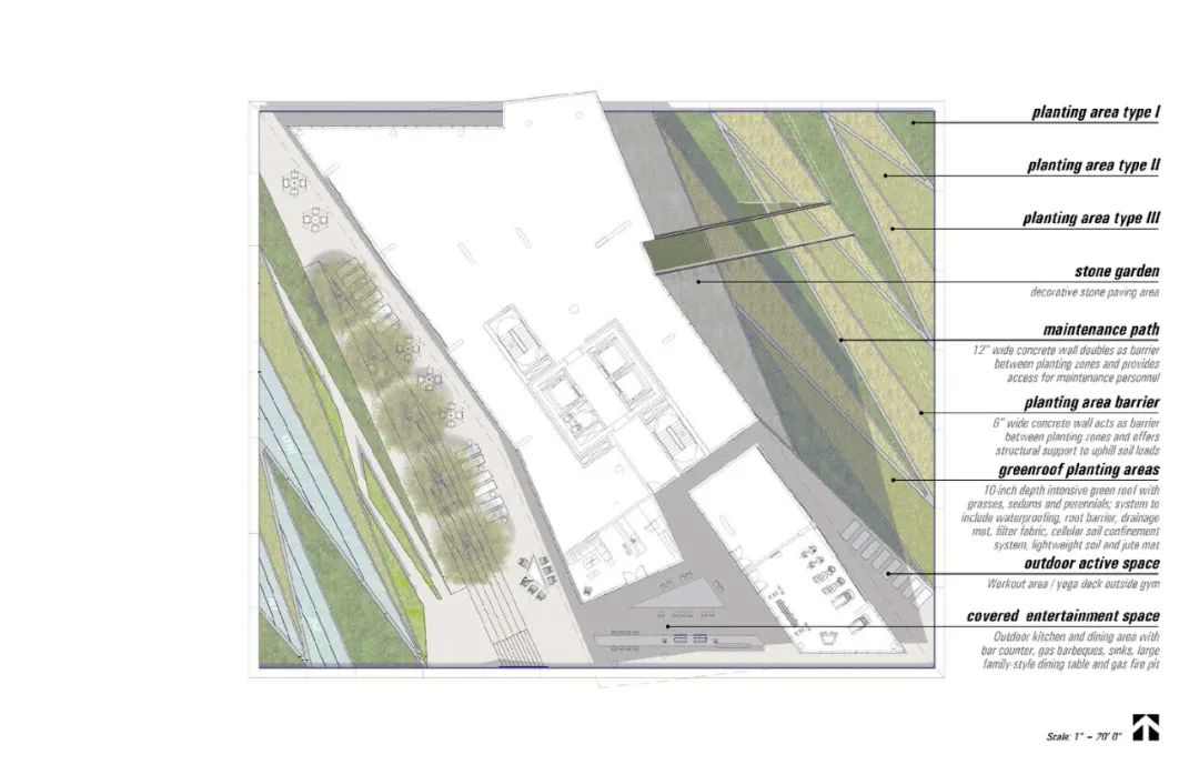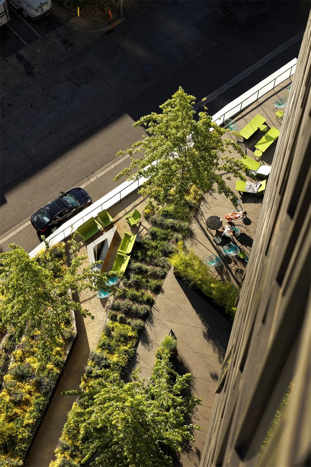 公寓裙樓的屋頂綠化將自然的植栽景觀提升到面高度,創造了一個共享的社區景觀環境,而摺疊的屋頂形狀則抽象地再現了水濱區的自然地形斜度。景觀既開幕,也向承租者開放,並提供水療、健身等設施,將河對岸波特蘭市中心無與倫比的美景盡收眼底。