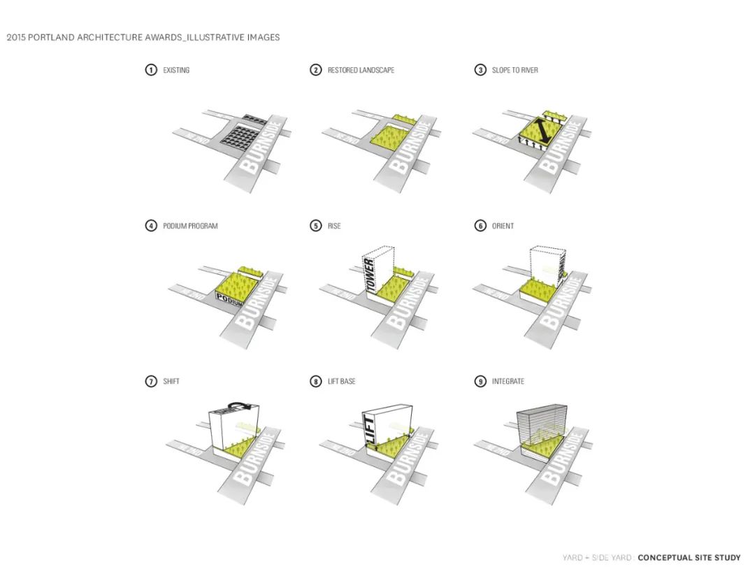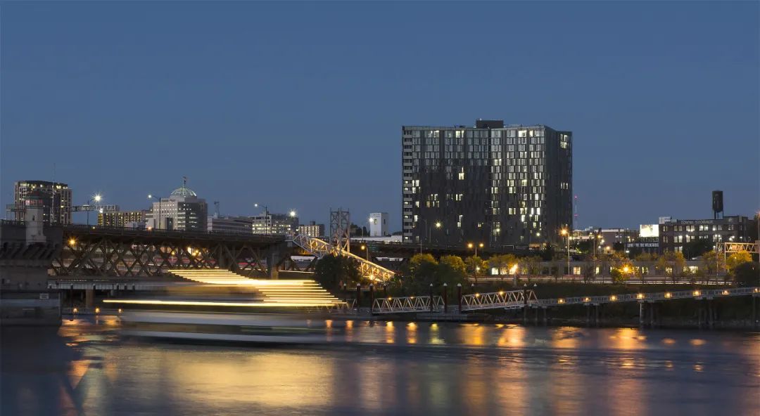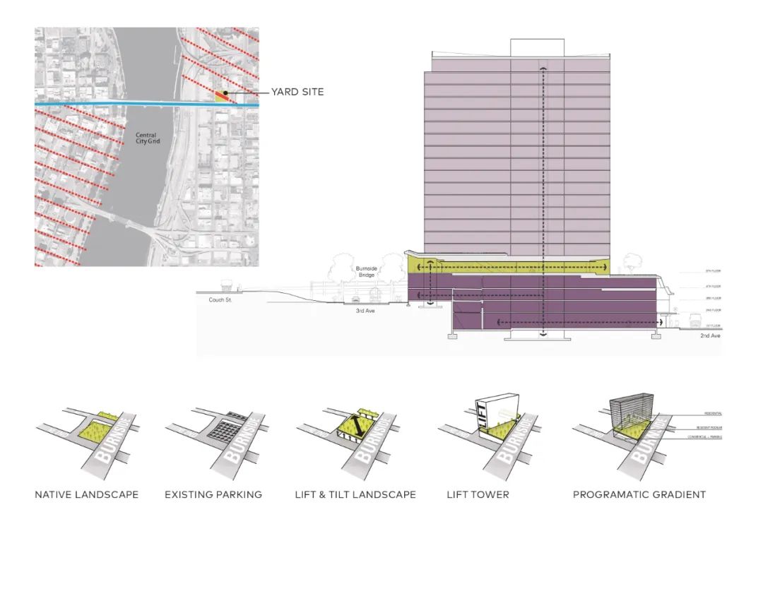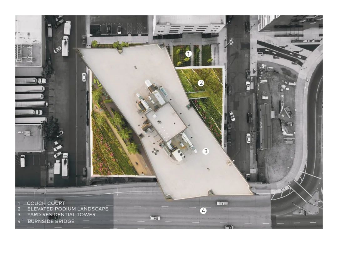 YARD 位於波特蘭市中心的威拉公尺特河對面,由美國建築師事務所 Skylab Architecture 擔綱設計,是一座 21 層、佔地 34.31 平方英呎的集合住宅大樓,高聳於著名的伯恩賽德大橋之上。