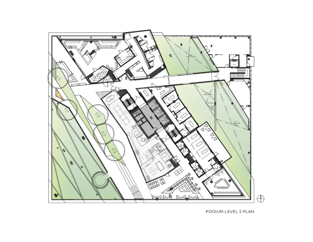 選址頗具挑戰:40% 的基地被限制建造不超過五層或六層的建築。為瞭解決基地限制和地勢變化的問題,塔樓偏移至軸線之外,並被托架在裙樓的兩部分之間。