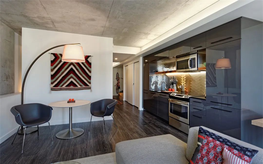 建築內部的公共空間則呈現了西北太平洋地區的隨和美學。公寓設施包括玻璃爐灶、花崗岩檯面、智能家居技術(部分單元)和電動汽車充電站。公共的聯合辦公區和休息區營造出了良好的社交氛圍,尤其是在景觀平台的室內和室外共用部分。