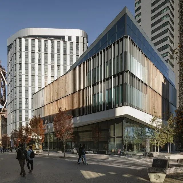 兩棟相連的建築除了共同支持康乃爾大學的理工學院公共生活外,還共享後勤服務區,以最佳化各自的效率。會議中心帶來了一個可重新配置的大型宴會廳以及四個多機能教室,每個空間都在朝向校園和城市景觀的軸線上。這棟低調且位於中心的教育建築具有親切而有機的形式和暖色調的材質搭配,其中間兩層教室覆蓋北美橋柏飾面的垂直鋁制格柵窗系統,為周圍建築提供了柔和的補充。這些格柵窗的間距和角度與城市景觀相映成趣,提供了溫馨的感覺,同時也突出康乃爾科技校區靠近紐約市中心。