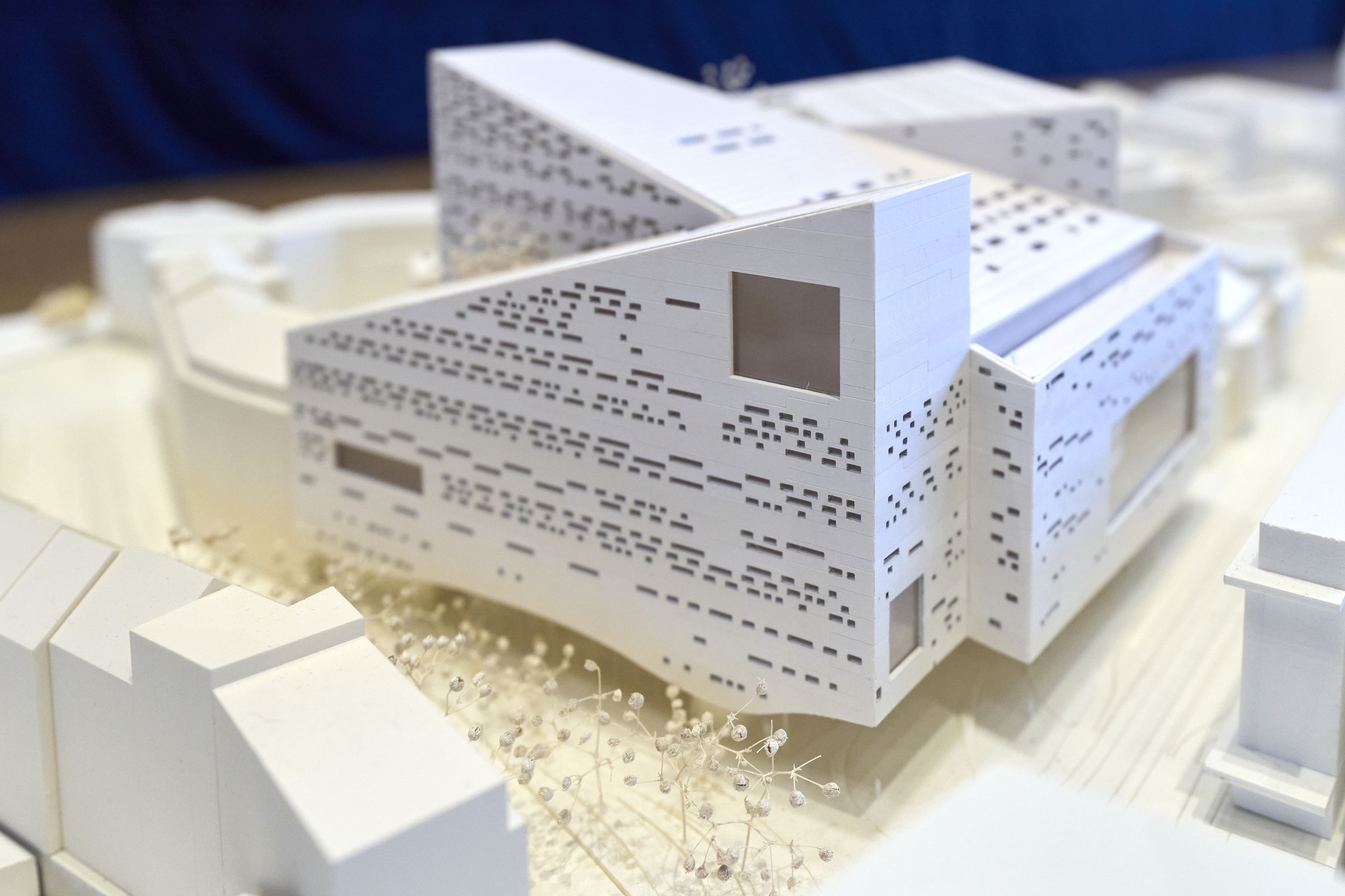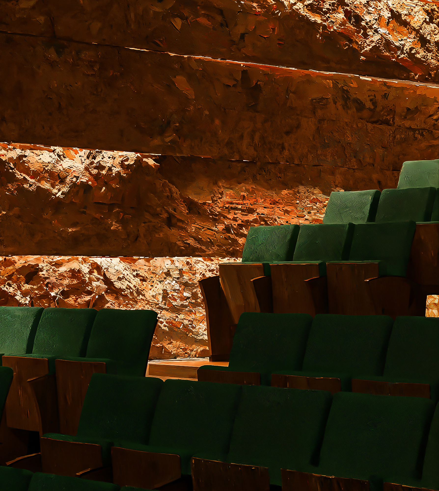石材模組在尺寸和表面處理上變化多端,從粗獷到精細研磨,並以波浪狀的條帶排列,清晰地呈現出地質沈積層的視覺感,巧妙地將地面層的「侵蝕」主題延伸至立面。大型開口框出了門廳和排練空間等關鍵公共區域,而較小的過濾窗則提供一個受控的遮陽與通風環境。
