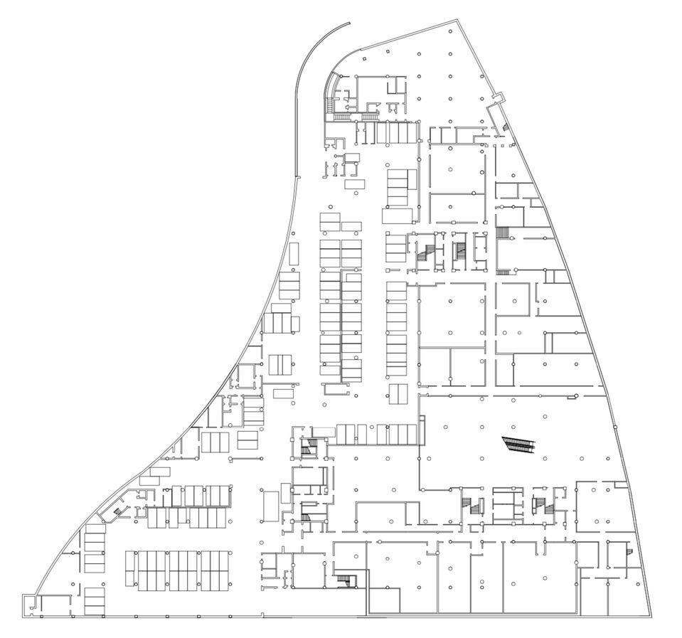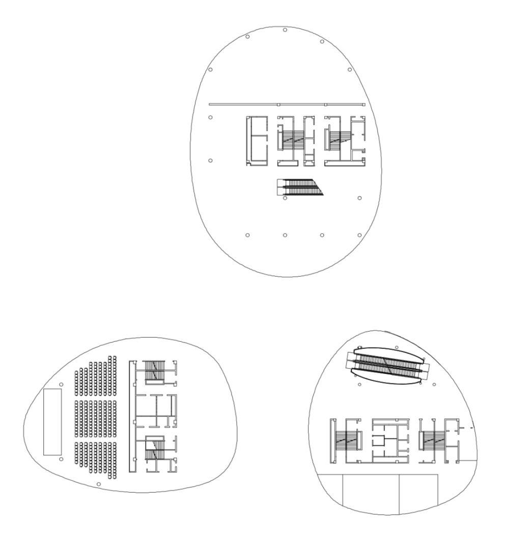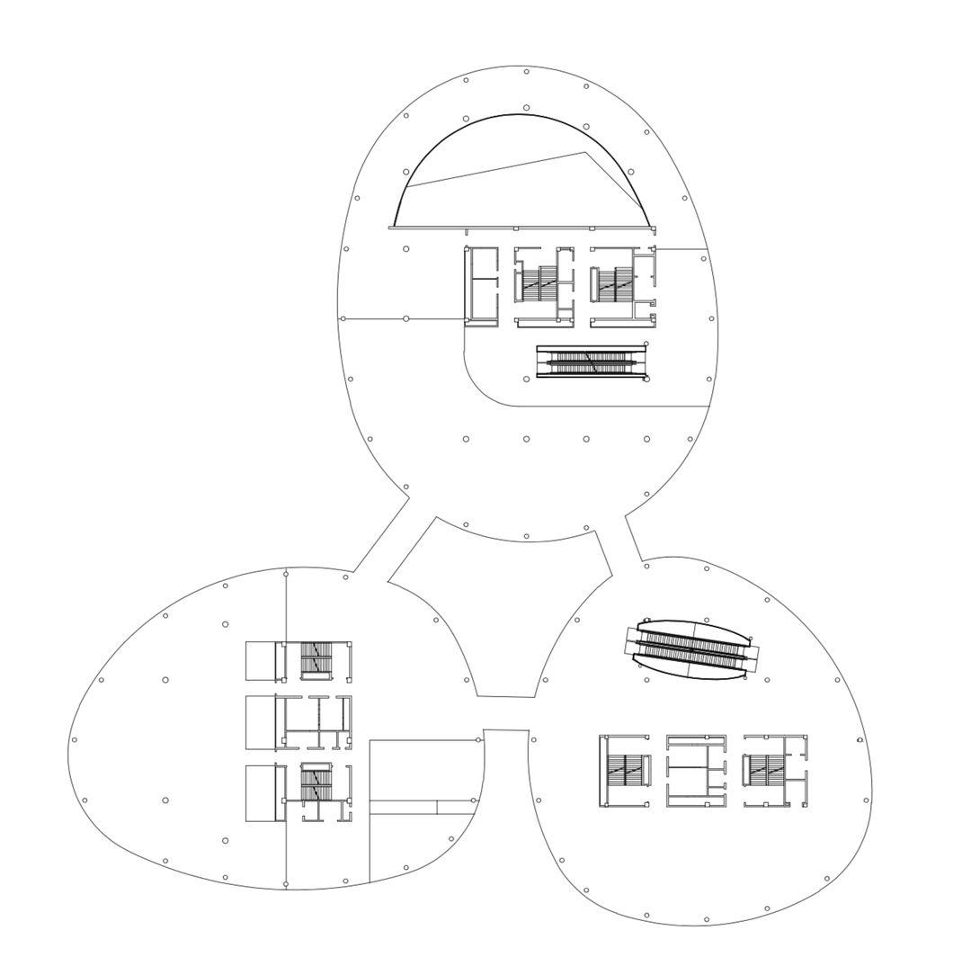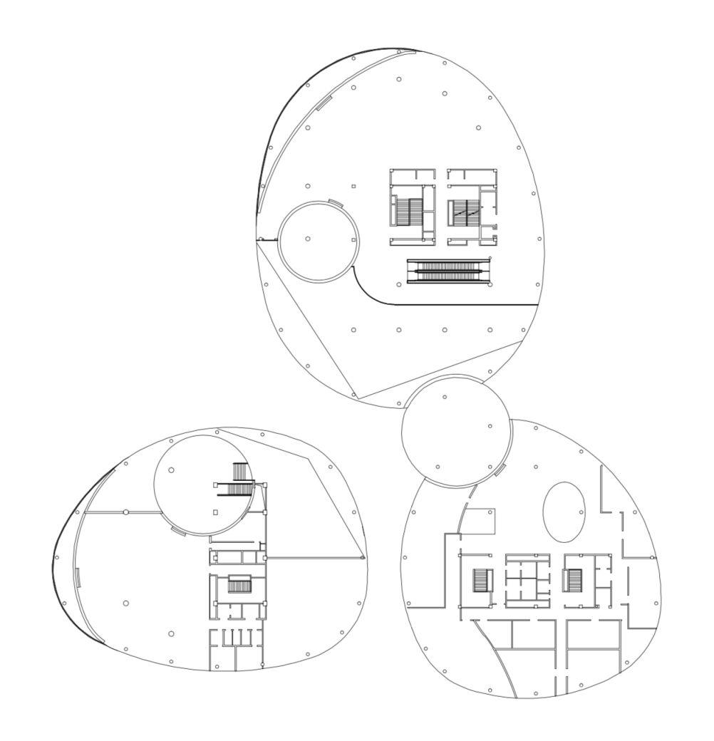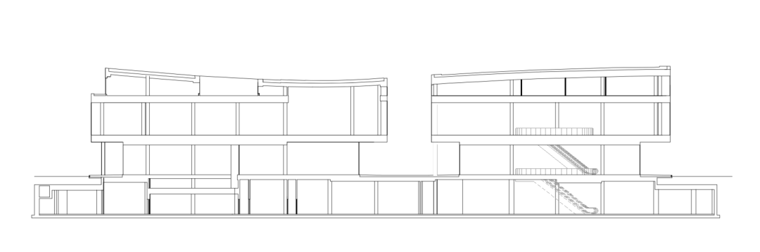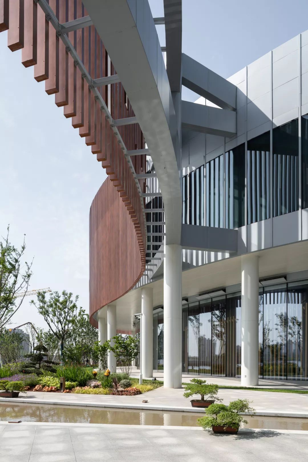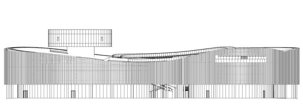 該建築主體含地上3層,地下1層。地上部分採用鋼框架結構體系,地下室採用框架結構體系。鋼構造系統適應性較強,使得立面出挑的輕盈格柵和連接三個單體的屋頂環道造型得以實現。