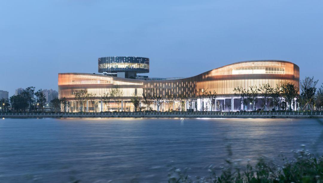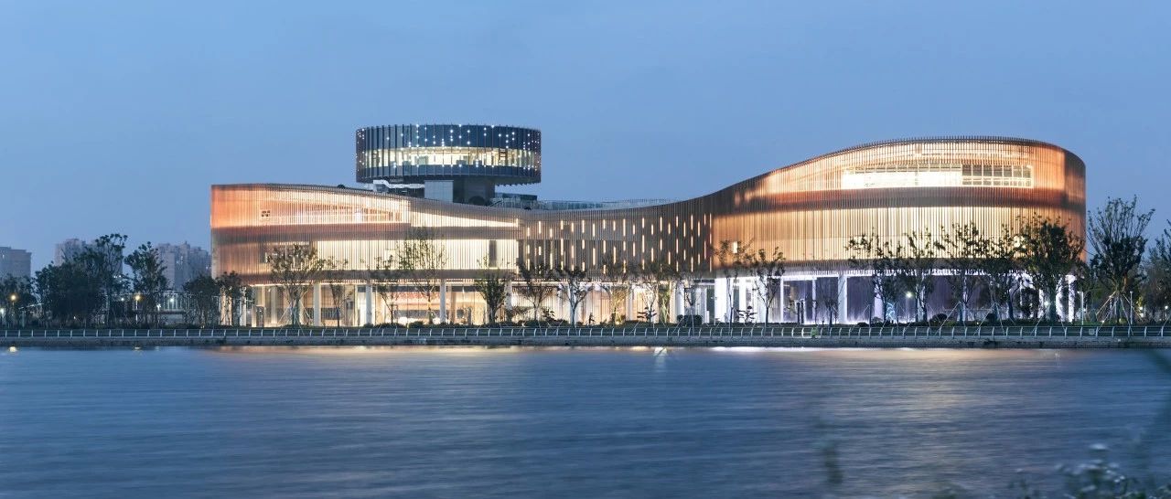 夜晚的博物館是整個上海之魚湖區的焦點,流動的燈光和烘托氣氛的暖色調光影效果,將建築溫柔地融入這湖光水影之中。