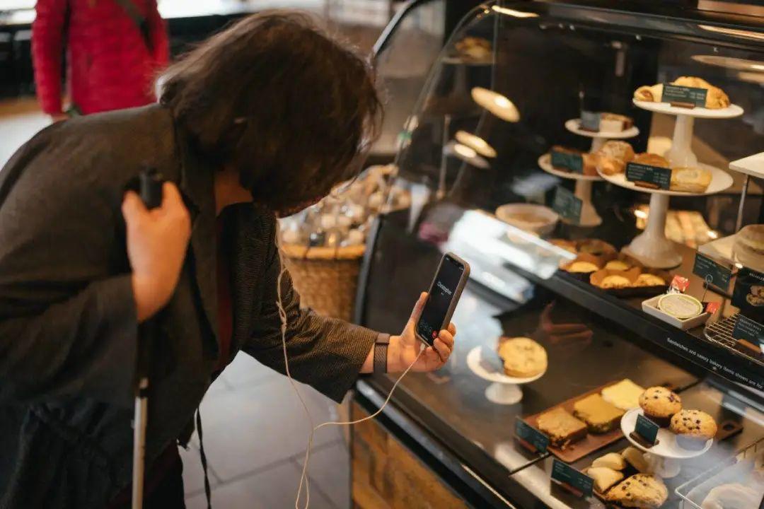 走到櫃檯,視覺口譯員將告訴你玻璃櫃裡都有什麼糕點,菜單裡都有什麼咖啡,同時跟你介紹每一款食物。