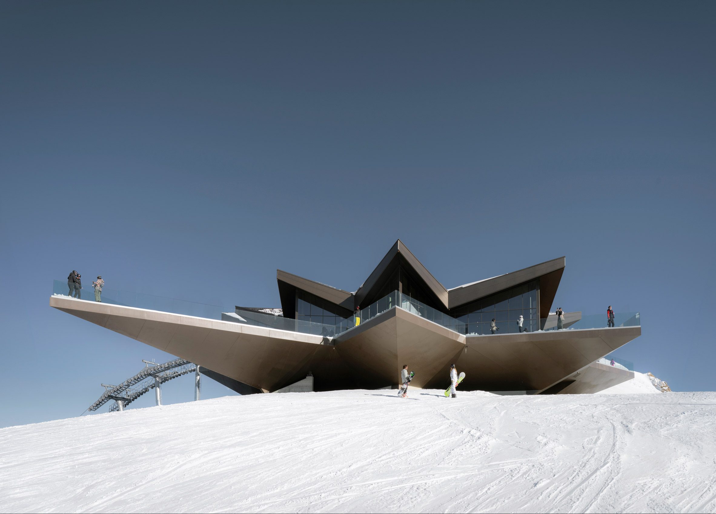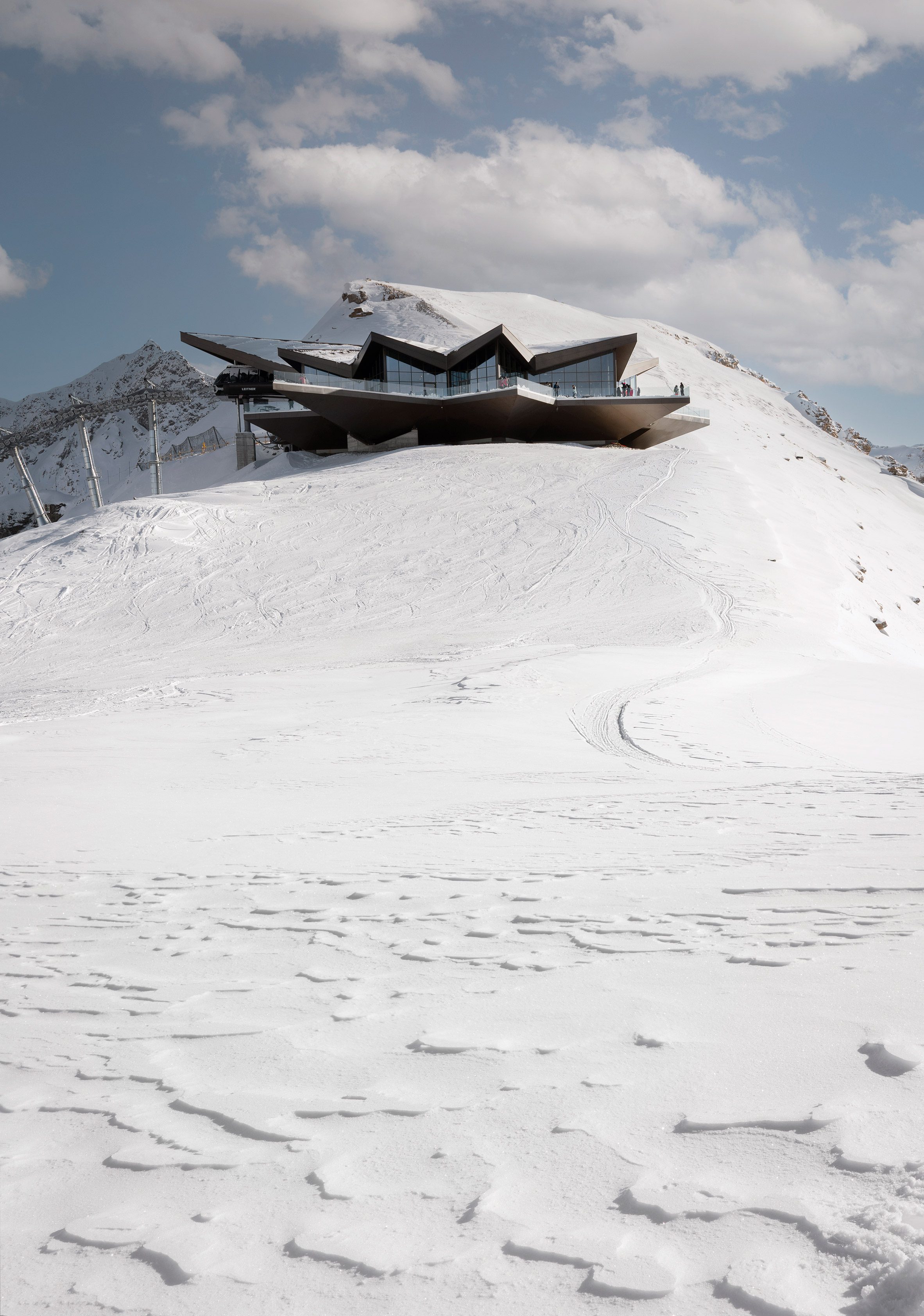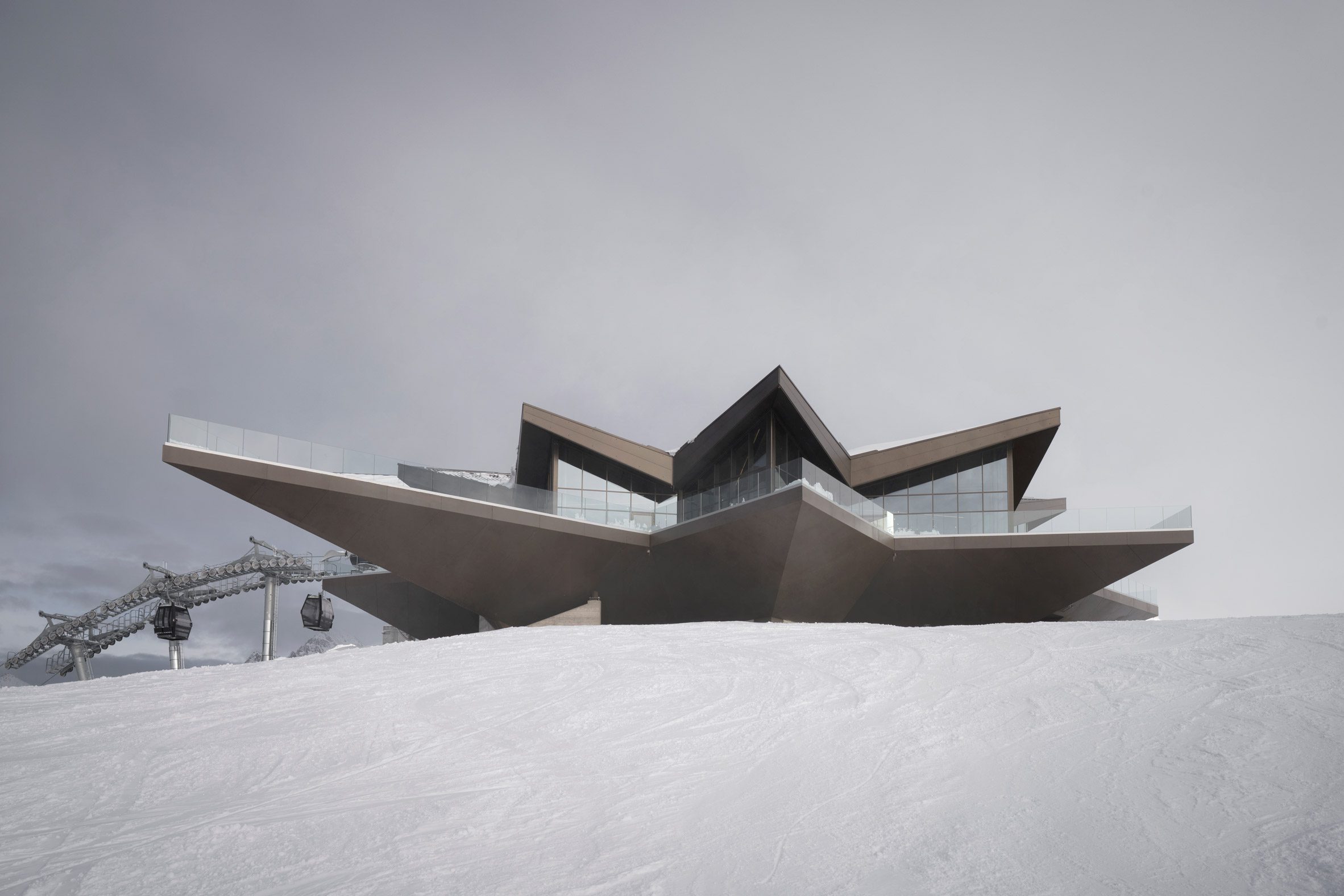 為了與周遭雄偉的自然環境產生對話,Stella di Pila 纜車站擁有一個極具辨識度的鋸齒狀外觀,獨特的幾何形體並非憑空捏造,而是深度汲取了阿爾卑斯山區特有的高山植物——雪絨花(edelweiss),以及航海圖上常見的羅盤玫瑰(compass rose)意象。