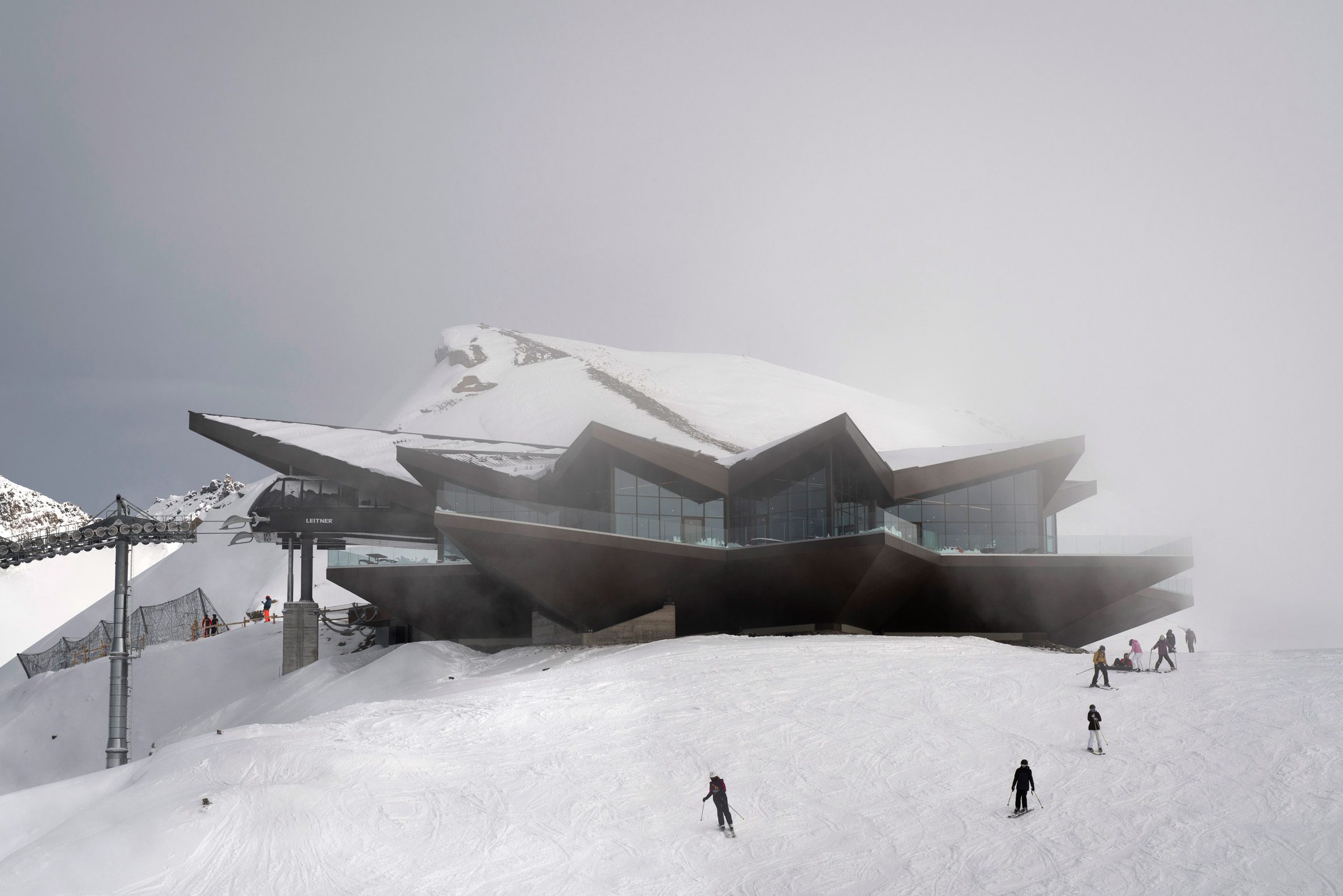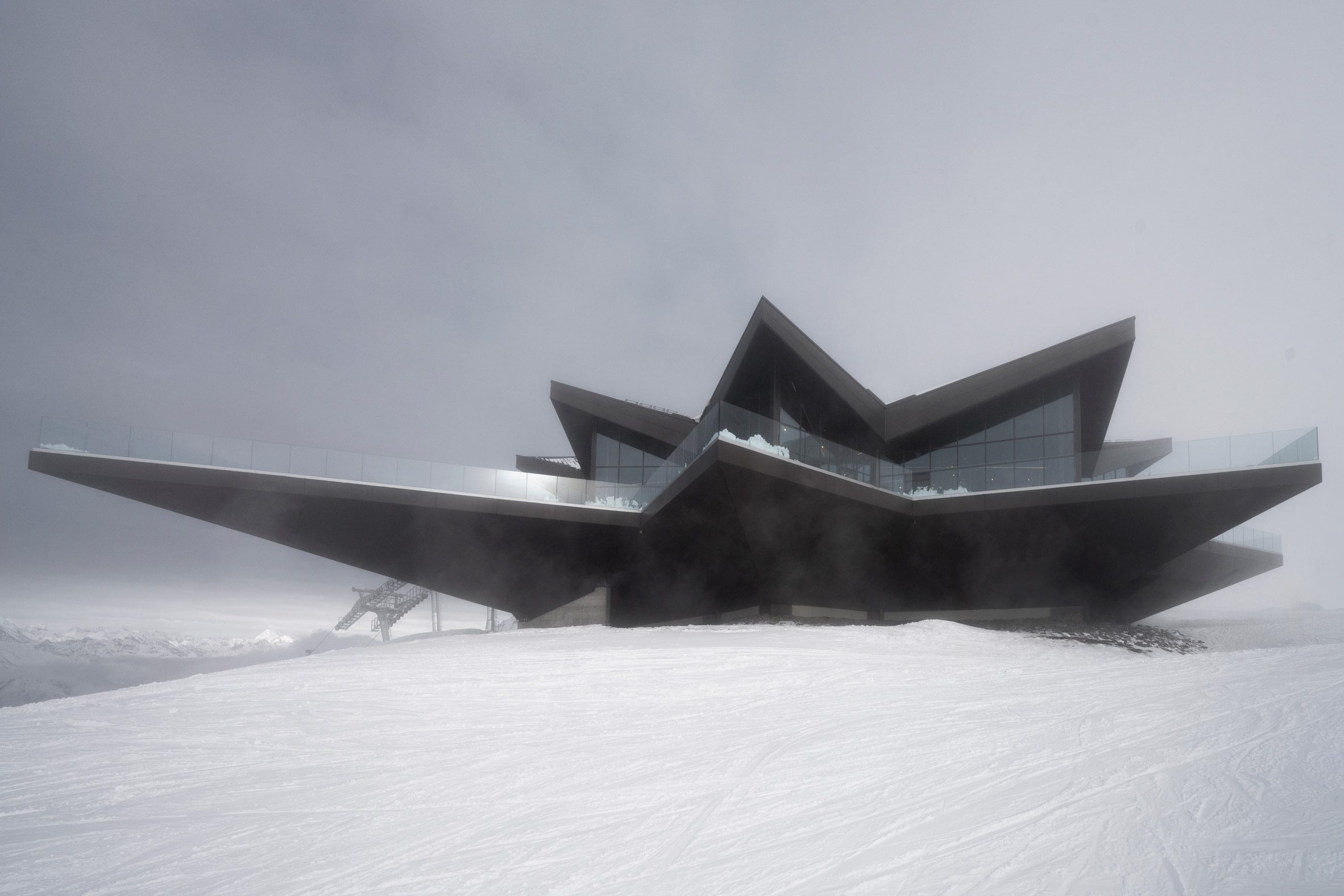 在海拔將近2,750公尺的高山上進行工程,面臨的挑戰遠超乎平地建築的想像。狂風、暴雪、酷寒的氣溫以及極度困難的物料運輸(logistics),都是設計與營造團隊必須正面迎擊的難題。對於 De Carlo Gualla 建築師事務所而言,創造一個獨特且易於識別的建築輪廓固然重要,但更關鍵的是必須確保這棟建築能夠在極端惡劣的山區環境中長久屹立不搖。Gualla 深刻體認到:「在這個高度,氣候與物流不再是需要設法繞過的限制,而是積極形塑建築的強大力量。真正的挑戰在於創造出足夠堅固、能抵禦極端條件的構造,同時還必須保持建築語彙的清晰、精準以及視覺上的輕盈感(visual lightness)。」透過精密的結構計算與先進的材料科學,團隊成功找到了堅固與美感的完美平衡點。