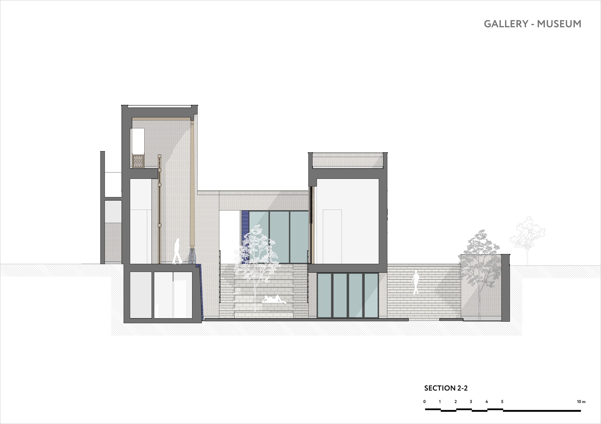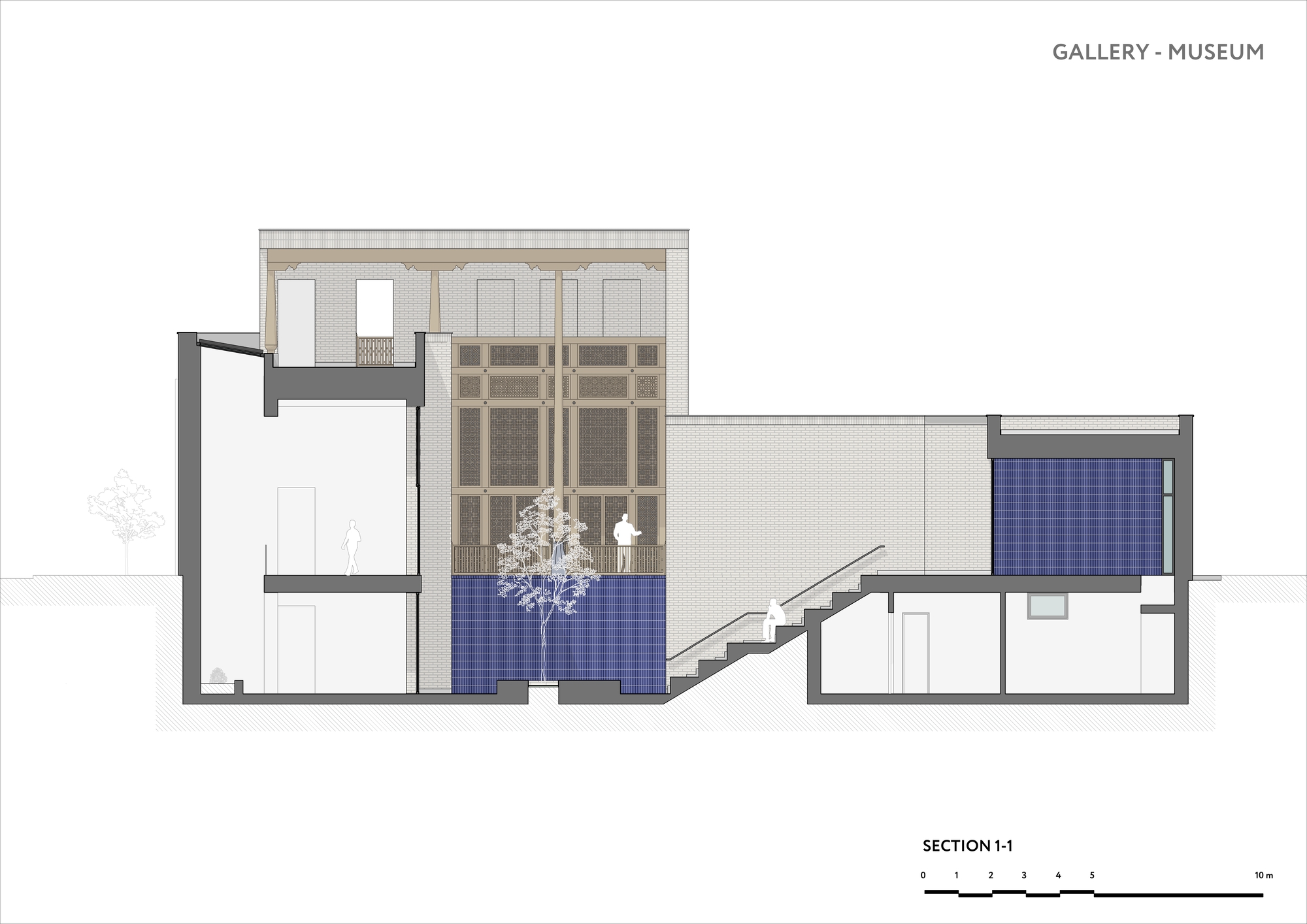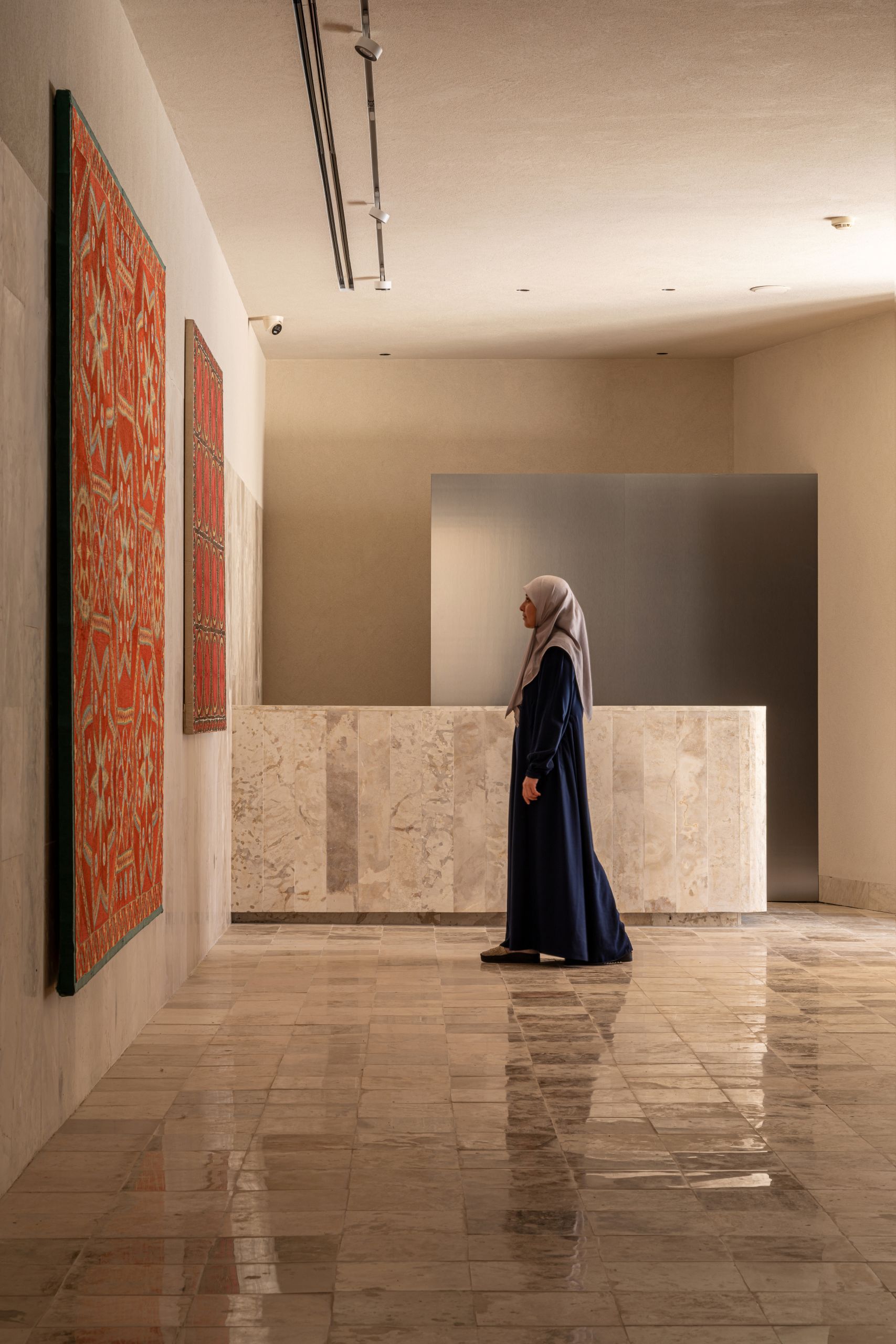 東側的畫廊博物館完全把參觀者的感官體驗作為設計核心。走入中央庭院,挺拔的桑樹映入眼簾,無聲講述著中亞絲路貿易的繁華過往,並象徵絲綢的起源。地面層遵循流暢的環形動線,引領遊客從入口處依序探索陳列著巨幅刺繡作品的主展廳、精緻的藝廊與文創商店。