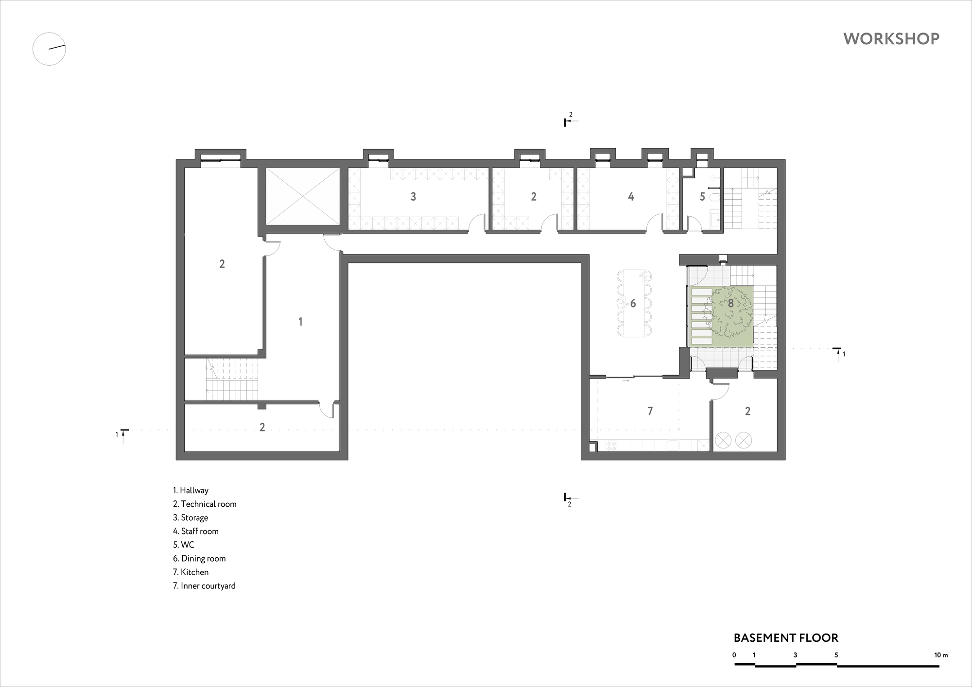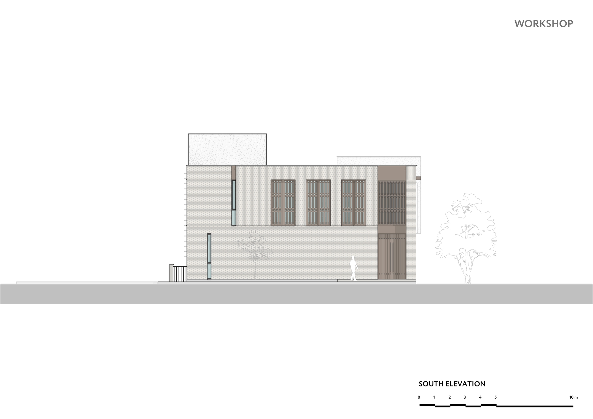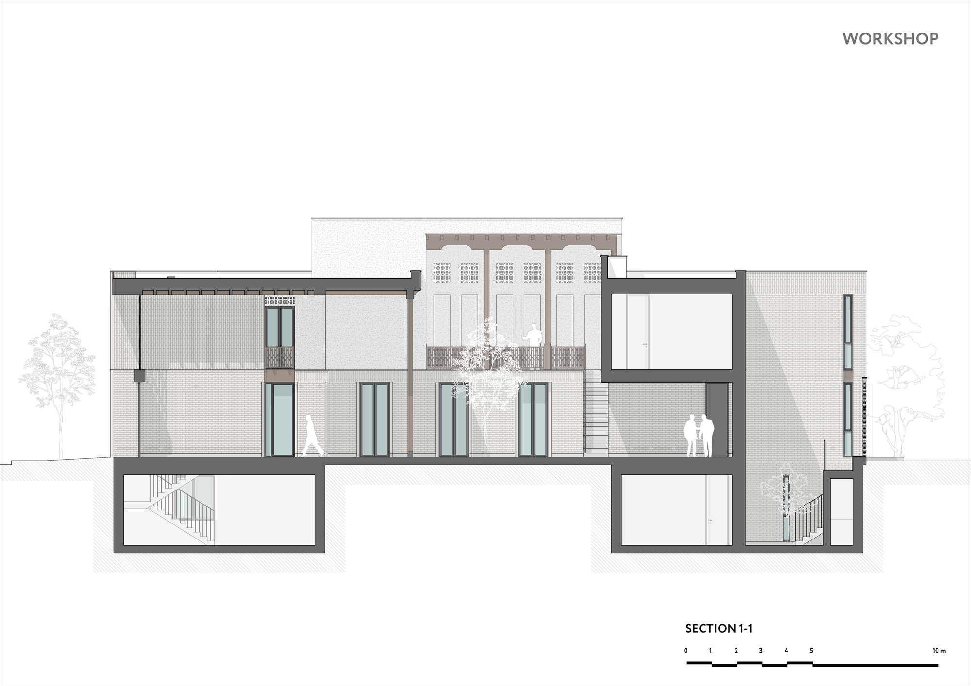 視線轉向西側的工作坊,宛如一座運作不息的職人基地。地面層專注於繁複的生產工序,涵蓋色彩斑斕的染線區、專注細緻的刺繡區,以及為培育下一代匠人而設的教育推廣空間。拾級而上來到二樓,明亮開闊的場域成為藝術家與設計師激盪靈感的工作室,縫紉區、行政辦公室與會議室比鄰而居,確保溝通的順暢。地下室則作為員工餐廳、大型儲藏室與設備機房,提供堅實的後勤支援。有別於傳統老屋粗暴的水平增建,設計團隊將原本散落各處的刺繡產業鏈,有條不紊地整合於單一立體空間內,強烈突顯出保留非物質文化遺產的強大企圖心。