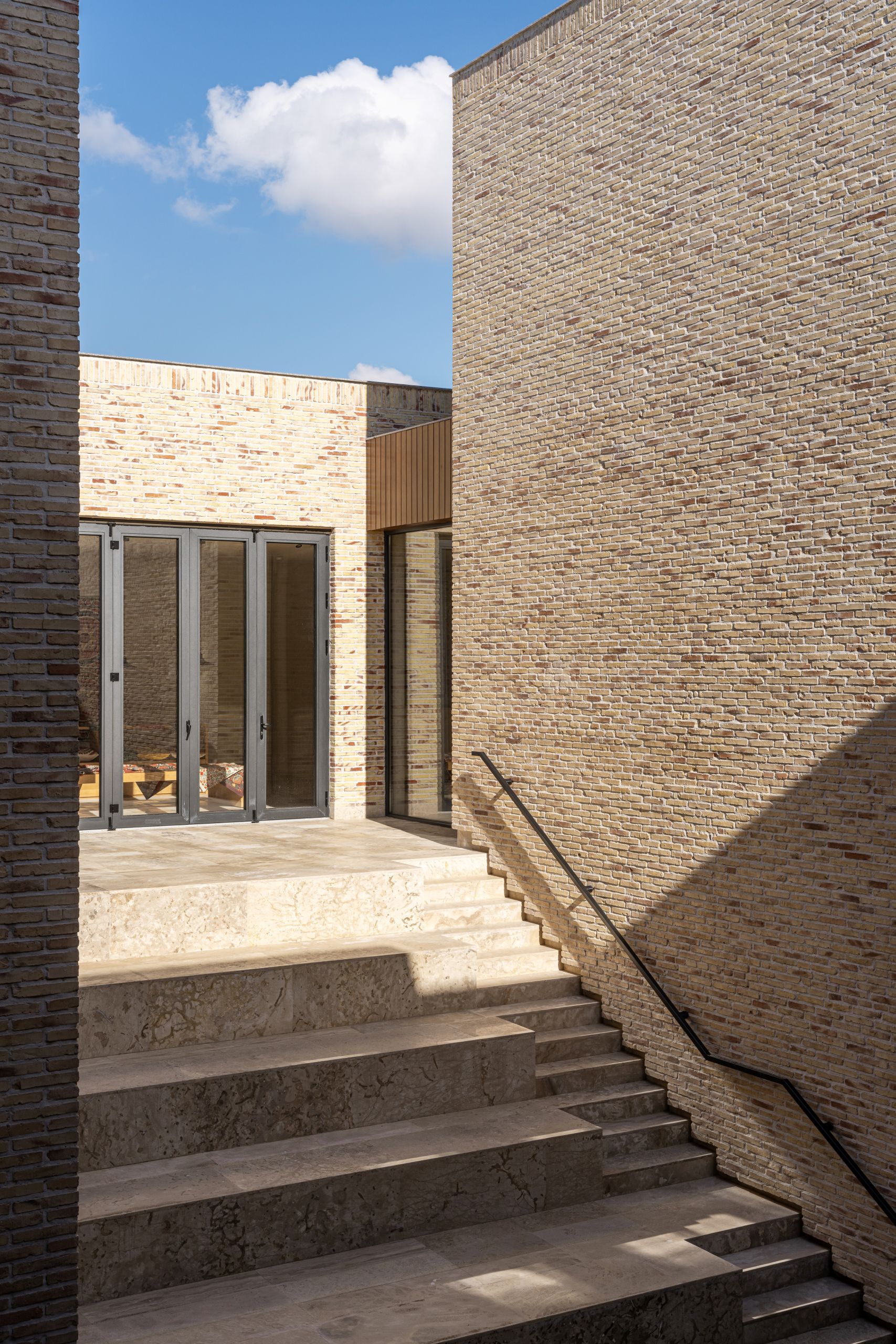 順著階梯而下,寬敞的地下室容納可供舉辦大型講座的活動廳、飄散咖啡香氣的休憩館與機電設施。當遊客步上屋頂露台,更能將Suzuk Ota建築群的莊嚴圓頂與歷史風光盡收眼底。建築團隊透過垂直空間的靈活調度,讓人在古今交錯的場域中,徹底沉浸於刺繡藝術的洗禮。