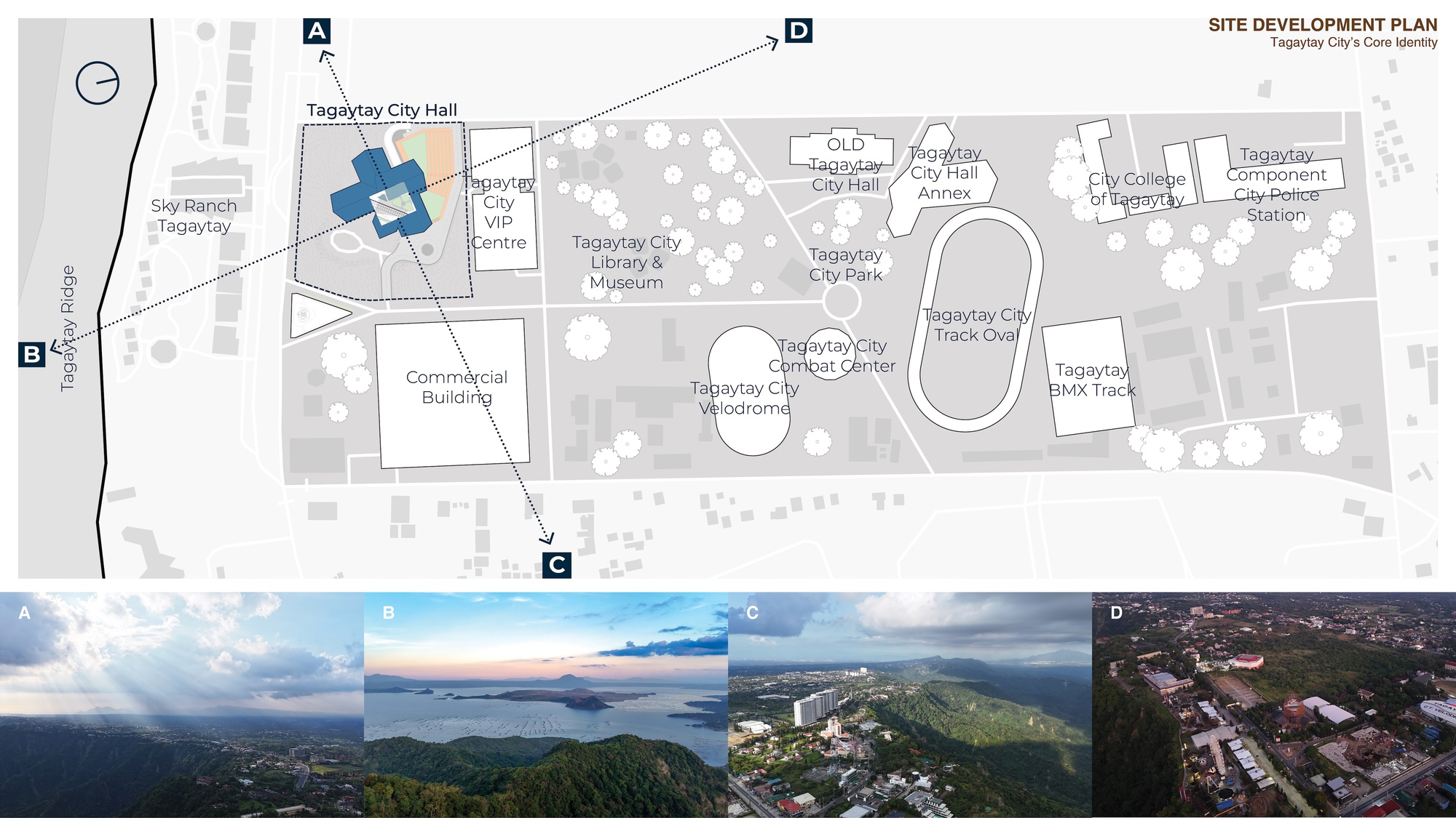菲律賓塔蓋泰市(Tagaytay City)行政大樓,坐落於俯瞰大雅爾湖(Taal Lake)的火山邊緣,地理位置得天獨厚。這座城市依傍著塔爾山脊(Taal Ridge),因其涼爽宜人的氣候與茂密的森林坡地,成為馬尼拉都會區民眾趨之若鶩的度假勝地。塔蓋泰的名稱源自於塔加路語(Tagalog word)「山脊」之意,標誌了城市核心認同受地理、森林及觀光業三者形塑的特質。