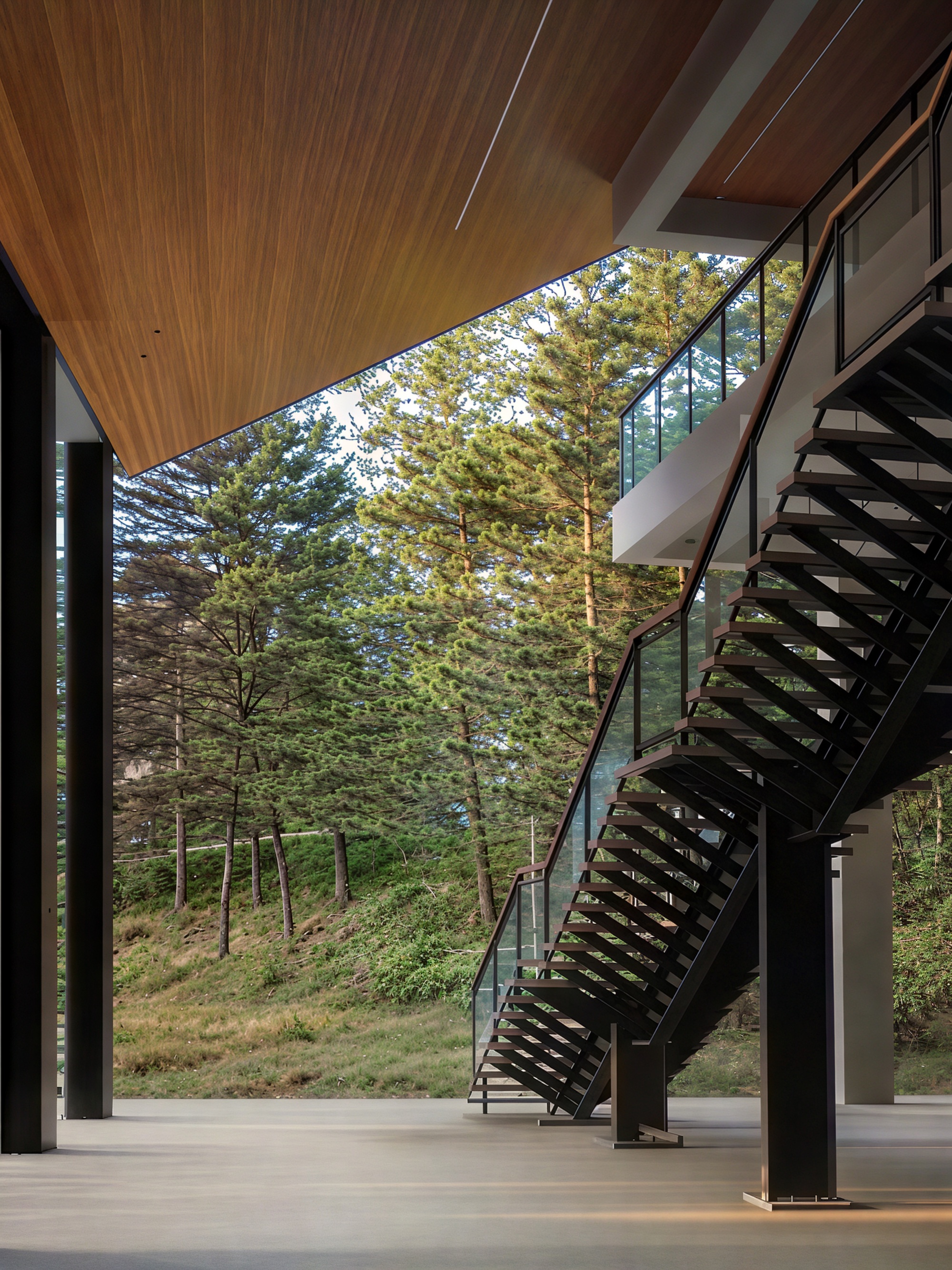 金棕色垂直節奏:外牆向松林致敬的溫暖剪影