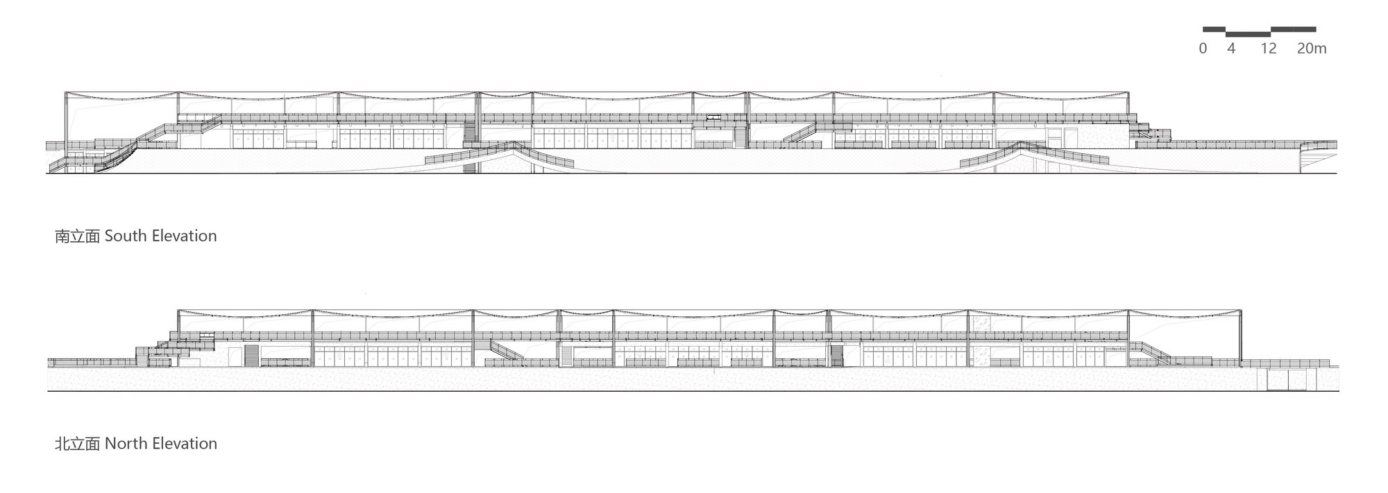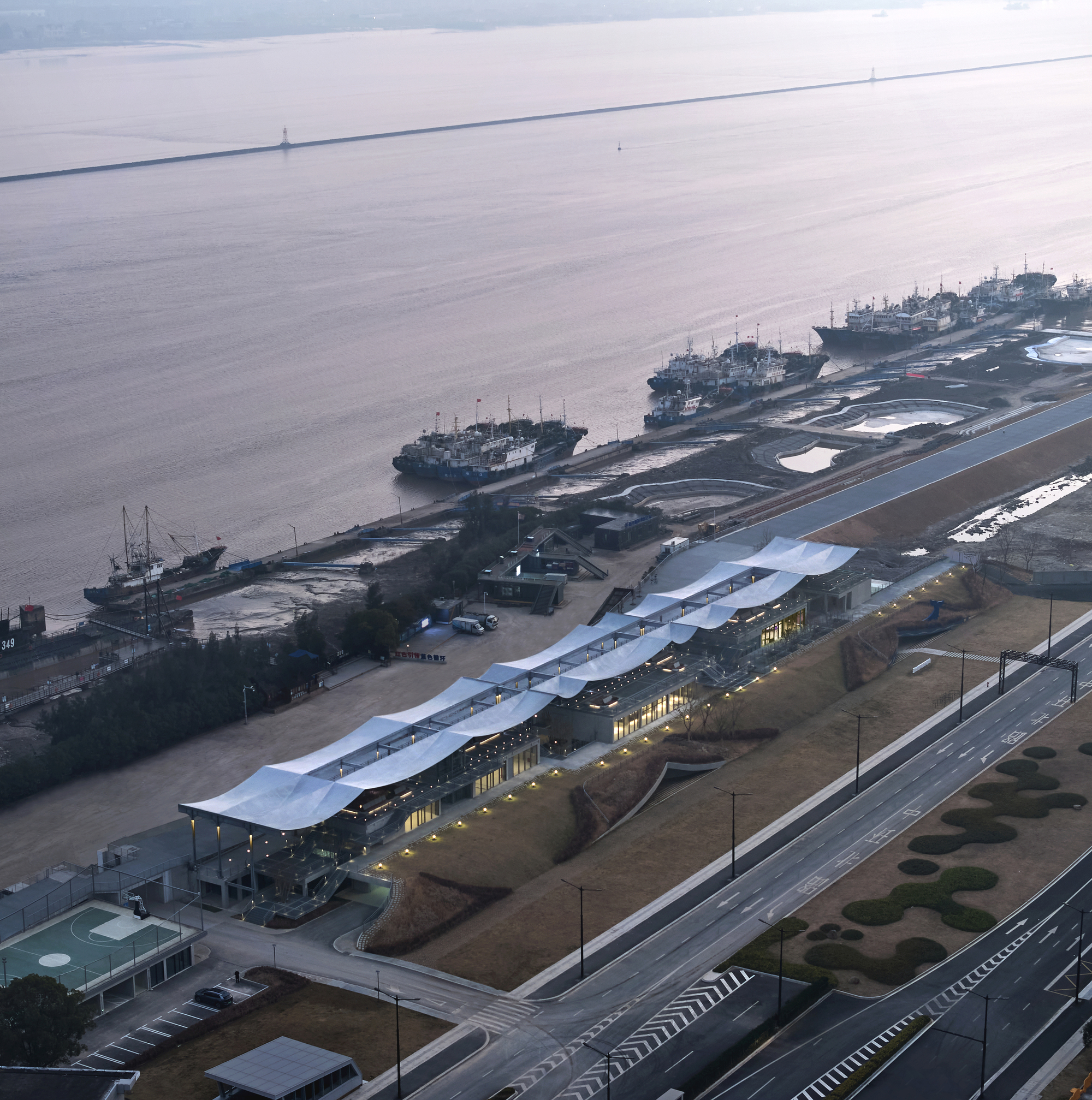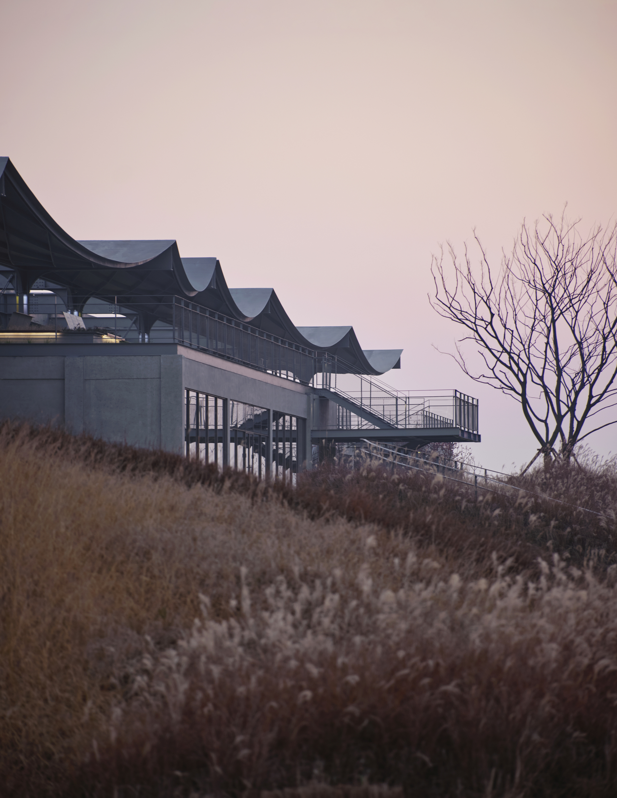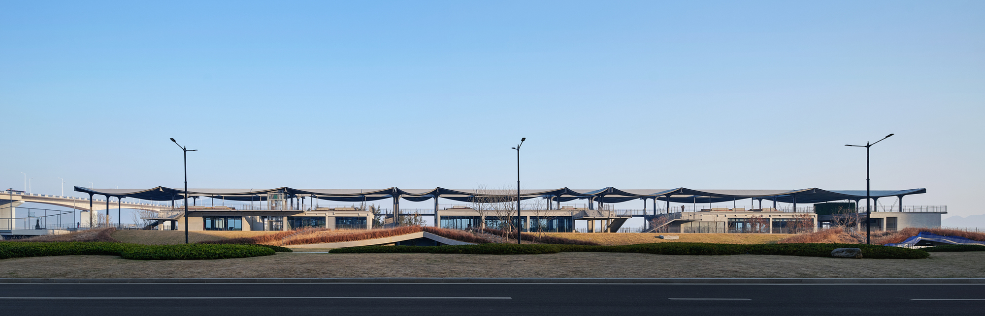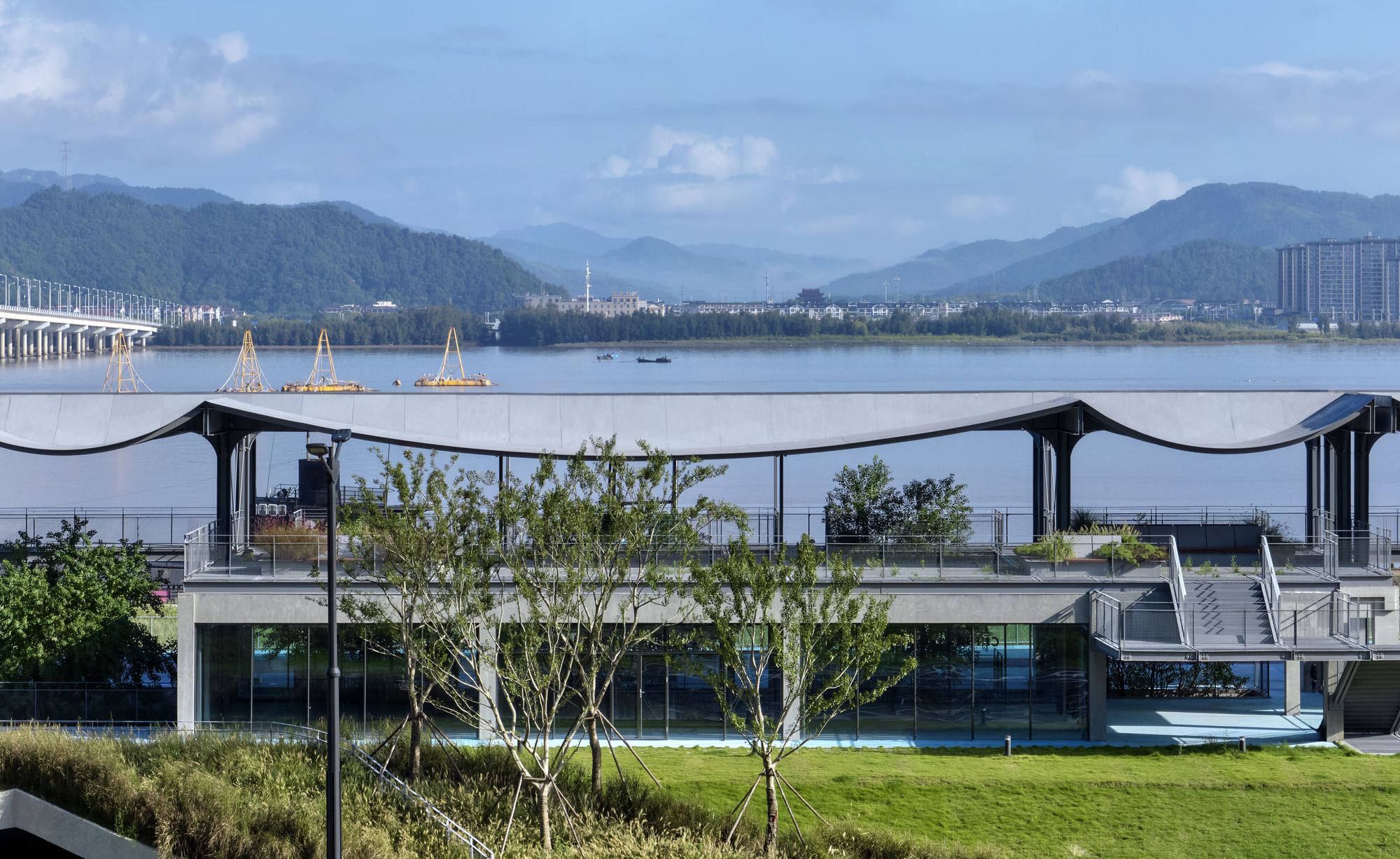 新增的鋼結構長亭,其形態語彙處處呼應著椒江的漁家文化。連綿起伏、悠揚輕盈的亭屋面,是對江面上晾曬漁網這一日常場景的藝術化回應。屋面結構採用懸垂形帶肋鋼板作為主要形式,以僅一七○毫米的截面高度,實現了八至二四米的大跨度,展現了力學之美與鋼材的輕巧。主體框架則採用十字工形柱,結合雙槽鋼格構梁。此外,建築南側的綠坡造型取自漁梭,將車庫入口親近地融入其中;北側的階梯與球場圍欄,則呼應江面微波,與主體建築融為一體,共同創造了鬆弛輕快的場所氛圍。